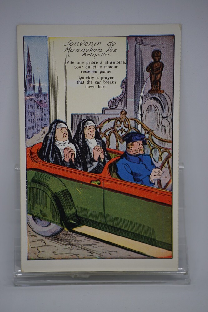 Postcard Belgium Comic Manneken-Pis Brussels Nuns Prayer Cabriole Pissing Statue " Vite une prière à St-Antoine, pour qu'ici le moteur reste en panne. Quickly a prayer that the car breaks down here. " One of a series of comic postcards on the subject of the Manneken-Pis statue in Brussels, early 20th century. Souvenir de Manneken-Pis Bruxelles Series No 30 Unposted. Good vintage condition. No visible damage to any of the edges. All corners slightly bent. Dirt spots, discoloration, creasing, scratches, missing paint and stains marks may be visible on single or both sides of the postcard. Good condition for its age. Please look at the photos for condition details. Additional details : This postcard is quite far from what we know as English humour, marked by fine irony. What do we mean by saucy seaside postcards? The name was coined for cards featuring risqué images and innuendo. These often include images of figures scantily clad and in precarious positions. Many of these designs would not be deemed appropriate today and even at the time, as we will discover, people questioned their impact on the morality of their audience. Pedro, Fitzpatrick, Chas, Quip, L.B. Martin, Ajw, Trow, Donald McGill were all an English graphic artists for seaside, risqué, comic satire, humour whose names has become synonymous with the genre of saucy postcards, particularly associated with the seaside (though they were sold throughout the UK). This cards mostly featured an array of attractive young women, fat old ladies, drunken middle-aged men, honeymoon couples and vicars. Many artists behind the designs were influenced by the one who has been called 'the king of the saucy postcard', Donald Fraser Gould McGill (28 January 1875 - 13 October 1962) 'Saucy Postcards' are often collected and appreciated for artistic skill, its power of social observation and earthy sense of humour. Even at the height of fame top artists only earned three guineas a design, but by the 2000s original artwork could fetch thousands of pounds. Keywords: Artist drawn illustration ; Edwardian ; Victorian ; Antique ; Early colour ; Double entendre ; Humorous ; Amusing ; Entertaining ; Innuendo ; Toilet humour ; Dirty jokes ; Rude joke ; Cheeky ; Funny situations ; Novelty ; Big boobs ; Buxom ; Plump ; Thicc ; Busty ; R andy ; Bawdy ; Foreplay ; Courting ; Pretty girl ; Sexy lady ; Sex ; Nude ; Nudes ; Nudist club ; Naturist club ; Naked women ; Naked man ; Naked couple ; Topless ; Nylons ; Stockings ; Love ; Romance ; Wedding ; Marriage ; Wife ; Husband ; Hubby ; Breezybums ; Koolbums ; Fabric ; Cloth ; Rag ; Towel Roller ; Blind garden fence ; Neighbour ; On bed ; On spoon ; Erectile dysfunction ; Bikini ; Holiday ; Beach ; Bathing beauty ; Mouse trap ; Hole ; Plumber ; Engineer ; Deckchair ; Pub Inn ; Boomers ; Bronze statue ; Fountain ; Foldout ; Brussels ; Le Petit Homme ; Qui Pisse ; Burxelles Menneke Pis ; Urinal ; Urinating ; Peeing ; Pissing ; Little boy ; Baby ; Penis ; Symbol ; City ; Umbrella ; Car