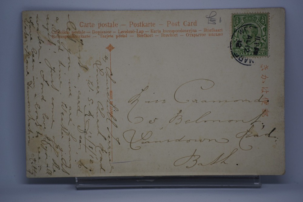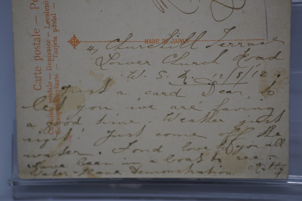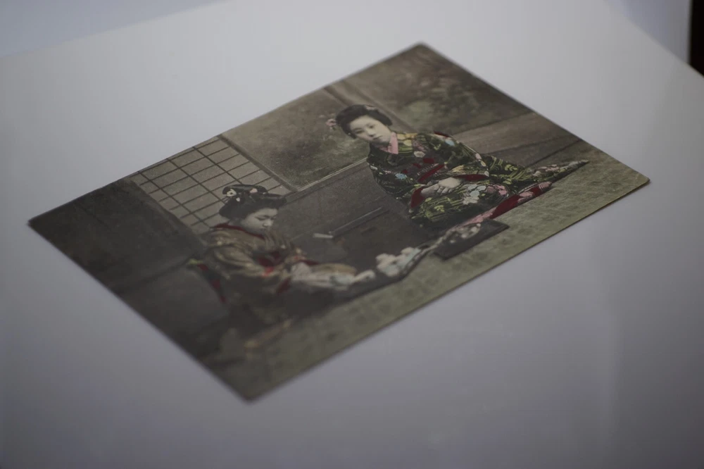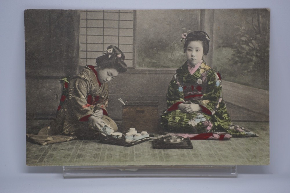 Postcard Japanese Tradition Geisha Girls Meiji Era Kimono Hand-Tinted Photograph Two Japanese Meiji Era geisha girls Tea time / tea ceremony, c. 1910. Posted Good vintage condition. Some damage to all of the edges. All corners slightly bent. Dirt spots, discoloration, creasing, scratches, missing paint and stains marks may be visible on single or both sides of the postcard. Good condition for its age. Please look at the photos for condition details. Details: Japan - Two Japanese girls in traditional costume reading a picture book. 【141 x 90 mm.】 thought to be from late Meiji Period (1890-1912). unposted. used. hand writing at the back. overall feeling of use and aging, browning, stains or other small damage. see photos for details “Tsugane San came in shortly and seated herself upon a square cushion on the opposite side of the hibachi. She pulled the tea tray towards her and taking the tall blue cup poured a little hot water in it and replaced it on the tray. “Opening an air tight canister which had a lid with a rim quite half as deep as the canister’s entire height she took out two pinches of tea dried leaves of a deep dull green that had never suffered from other heat or chemical process than the sun’s rays effect. The two pinches went into the kibisho, or small porcelain teapot. Next she poured boiling water from the tetsubin – the iron tea kettle – into a sort of gravy boat where it must cool a bit lest it make the brew astringent. “Replacing the tea kettle on the brazier she turned the moderated boiling water on the leaves, let it stand perhaps a minute, and pouring a tiny cup half full for Kato San – her cup full for herself – drank the sherry colored liquor slowly with a sound somewhere between a kiss and a sigh.” – The Heart of Japan: Glimpses of Life and Nature Far from the Travellers Track in the Land of the Rising Sun, by Clarence Ludlow Brownell, 1903 Keywords: Old Japanese Postcard Meiji Period (1890-1912) Beautiful Women Kimono Geisha Tea Tea Ceremony Hand-Tinted