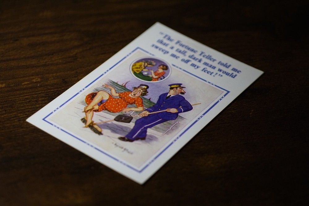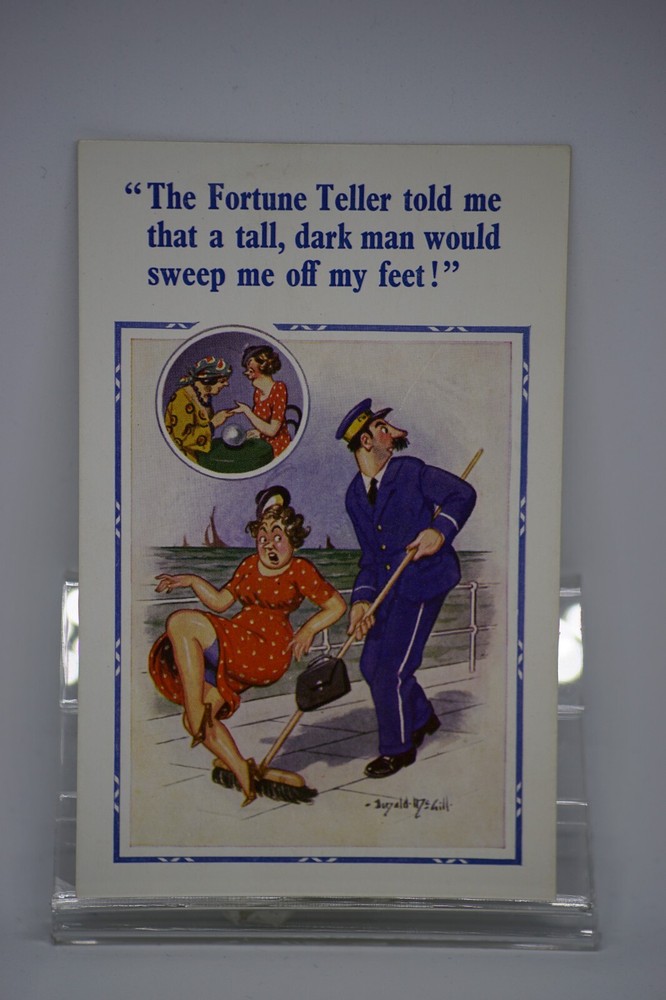 Postcard Seaside Comic Saucy Risqué Fortune Teller Constance Donald McGill 2101 "The fortune teller told me that a tall, dark man would sweep me off my feet!" D. Constance Ltd. 22 Christchurch Rd. London Sw2 New Donald McGill Comic Series No 2101 Unposted. Good vintage condition. No visible damage to any of the edges. All corners slightly bent. Dirt spots, discoloration, creasing, scratches, missing paint and stains marks may be visible on single or both sides of the postcard. Good condition for its age. Please look at the photos for condition details. Additional details : This postcard is quite far from what we know as English humour, marked by fine irony. What do we mean by saucy seaside postcards? The name was coined for cards featuring risqué images and innuendo. These often include images of figures scantily clad and in precarious positions. Many of these designs would not be deemed appropriate today and even at the time, as we will discover, people questioned their impact on the morality of their audience. Pedro, Fitzpatrick, Chas, Quip, L.B. Martin, Maurice, Ajw, Trow, Donald McGill were all an English graphic artists for seaside, risqué, comic satire, humour whose names has become synonymous with the genre of saucy postcards, particularly associated with the seaside (though they were sold throughout the UK). This cards mostly featured an array of attractive young women, fat old ladies, drunken middle-aged men, honeymoon couples and vicars. Many artists behind the designs were influenced by the one who has been called 'the king of the saucy postcard', Donald Fraser Gould McGill (28 January 1875 - 13 October 1962) 'Saucy Postcards' are often collected and appreciated for artistic skill, its power of social observation and earthy sense of humour. Even at the height of fame top artists only earned three guineas a design, but by the 2000s original artwork could fetch thousands of pounds. Keywords: Artist drawn illustration ; Edwardian ; Victorian ; Antique ; Early colour ; Double entendre ; Humorous ; Amusing ; Entertaining ; Innuendo ; Toilet humour ; Dirty jokes ; Rude joke ; Cheeky ; Funny situations ; Novelty ; Big boobs ; Buxom ; Plump ; Thicc ; Busty ; R andy ; Bawdy ; Foreplay ; Courting ; Pretty girl ; Sexy lady ; Sex ; Nude ; Nudes ; Nudist club ; Naturist club ; Naked women ; Naked man ; Naked couple ; Topless ; Nylons ; Stockings ; Love ; Romance ; Wedding ; Marriage ; Wife ; Husband ; Hubby ; Breezybums ; Koolbums ; Fabric ; Cloth ; Rag ; Towel Roller ; Blind garden fence ; Neighbour ; On bed ; On spoon ; Erectile dysfunction ; Holiday ; Bikini ; Beach ; Sand ; Bathing beauty ; Mouse trap ; Hole ; Plumber ; Engineer ; Deckchair ; Pub Inn ; Boomers ; Cruise ; Cruise Ship ; Deck ; Polka dot ; Cleaner ; Broom