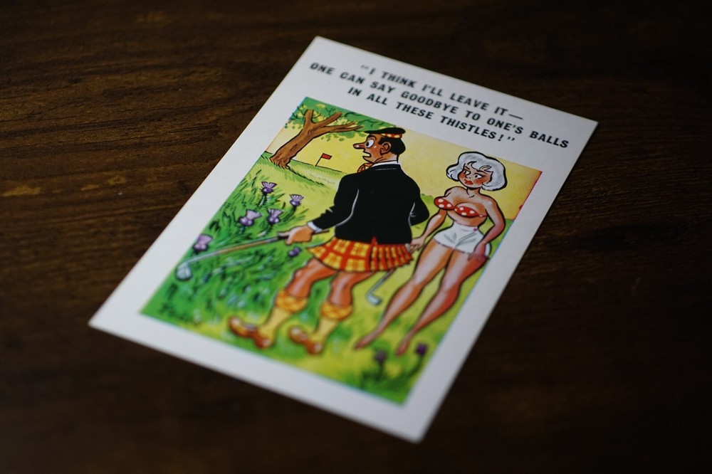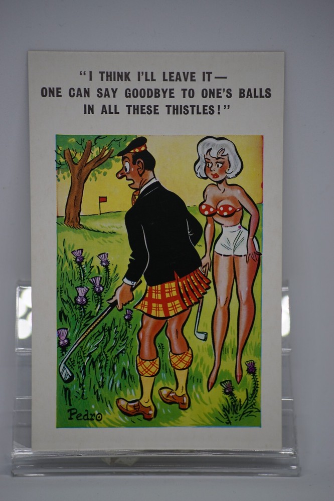 Postcard Seaside Comic Saucy Risqué Golf Scotsman Kilt Sunny Pedro Series 125 "I Think I'll Leave Itー One Can Say Goodbye To One's Balls In All These Thistles!" Sunny Pedro Series No 125 Unposted. Good vintage condition. No visible damage to any of the edges. All corners slightly bent. Dirt spots, discoloration, creasing, scratches, missing paint and stains marks may be visible on single or both sides of the postcard. Good condition for its age. Please look at the photos for condition details. Additional details : Postcard is also quite far from what we know as English humour, marked by fine irony. The card was published in 1973, is signed by Pedro, belongs to the Sunny Pedro Series. What do we mean by saucy seaside postcards? The name was coined for cards featuring risqué images and innuendo. These often include images of figures scantily clad and in precarious positions. Many of these designs would not be deemed appropriate today and even at the time, as we will discover, people questioned their impact on the morality of their audience. Pedro, Fitzpatrick, Donald McGill were English seaside, risqué, comic satire, humour graphic artists whose names has become synonymous with the genre of saucy postcards, particularly associated with the seaside (though they were sold throughout the UK). This cards mostly featured an array of attractive young women, fat old ladies, drunken middle-aged men, honeymoon couples and vicars. Many artists behind the designs were influenced by the one who has been called 'the king of the saucy postcard', Donald Fraser Gould McGill (28 January 1875 – 13 October 1962) 'Saucy Postcards' are often collected and appreciated for artistic skill, its power of social observation and earthy sense of humour. Even at the height of fame top artists only earned three guineas a design, but by the 2000s original artwork could fetch thousands of pounds. Keywords: Artist Drawn Illustration Early Colour Double Entendre Toilet Humour Dirty Jokes Funny Situations Novelty Big Boobs Buxom Plump Thicc Busty Sexy Sex Nude Nudist Club Naturist Club Wedding Marriage Naked Women Naked Man Breezybums Koolbums Golfer Scottish