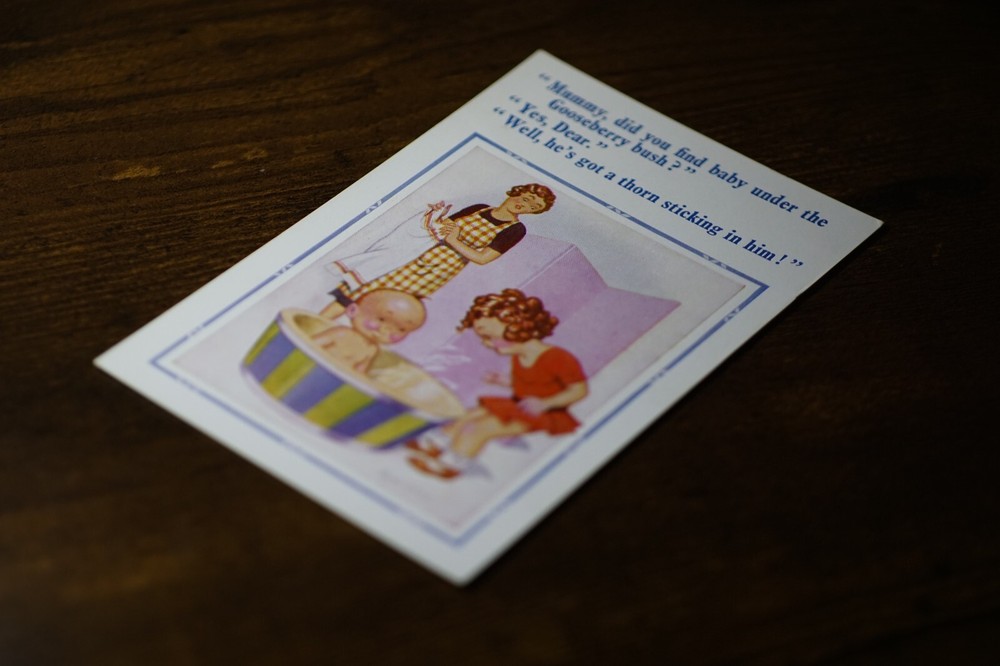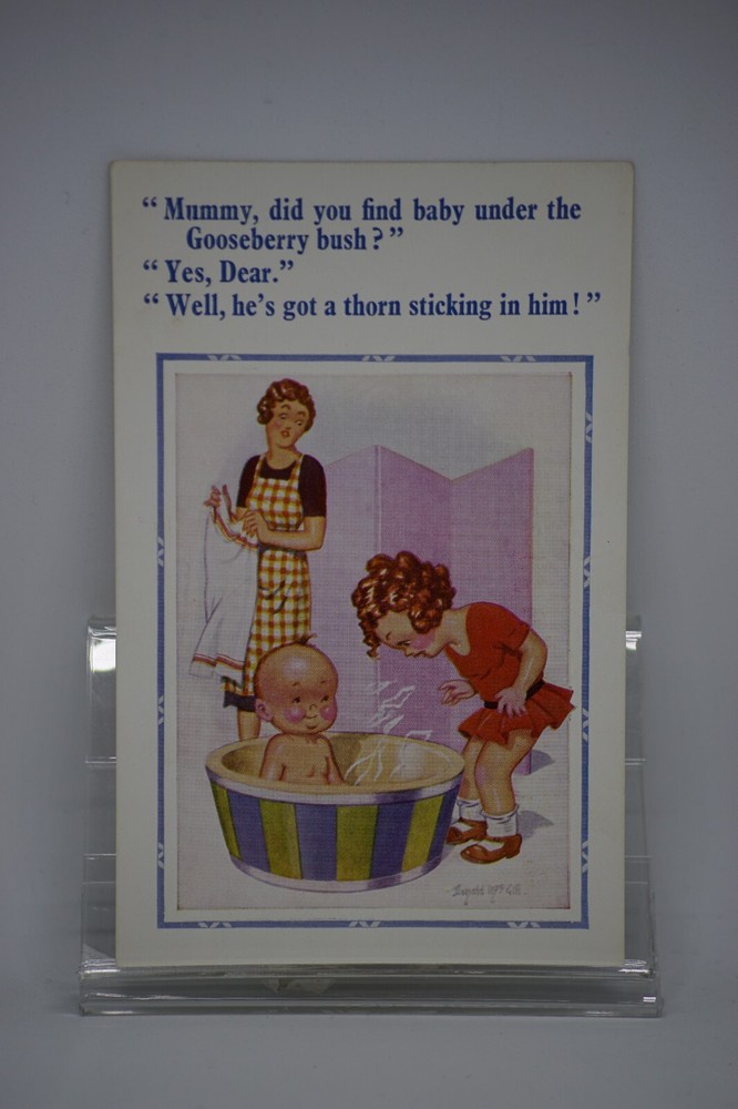 Postcard Seaside Comic Saucy Risqué Gooseberry Bush Constance Donald McGill 177 "Mummy, did you find baby under the gooseberry bush? Yes, dear. Well, he's got a thorn sticking in him!" D. Constance Ltd. 22 Christchurch Rd. London Sw2 New Donald McGill Comic Series No 177 Unposted. Good vintage condition. No visible damage to any of the edges. All corners slightly bent. Dirt spots, discoloration, creasing, scratches, missing paint and stains marks may be visible on single or both sides of the postcard. Good condition for its age. Please look at the photos for condition details. Additional details : This postcard is quite far from what we know as English humour, marked by fine irony. What do we mean by saucy seaside postcards? The name was coined for cards featuring risqué images and innuendo. These often include images of figures scantily clad and in precarious positions. Many of these designs would not be deemed appropriate today and even at the time, as we will discover, people questioned their impact on the morality of their audience. Pedro, Fitzpatrick, Chas, Quip, L.B. Martin, Maurice, Ajw, Trow, Donald McGill were all an English graphic artists for seaside, risqué, comic satire, humour whose names has become synonymous with the genre of saucy postcards, particularly associated with the seaside (though they were sold throughout the UK). This cards mostly featured an array of attractive young women, fat old ladies, drunken middle-aged men, honeymoon couples and vicars. Many artists behind the designs were influenced by the one who has been called 'the king of the saucy postcard', Donald Fraser Gould McGill (28 January 1875 - 13 October 1962) 'Saucy Postcards' are often collected and appreciated for artistic skill, its power of social observation and earthy sense of humour. Even at the height of fame top artists only earned three guineas a design, but by the 2000s original artwork could fetch thousands of pounds. Keywords: Artist drawn illustration ; Edwardian ; Victorian ; Antique ; Early colour ; Double entendre ; Humorous ; Amusing ; Entertaining ; Innuendo ; Toilet humour ; Dirty jokes ; Rude joke ; Cheeky ; Funny situations ; Novelty ; Big boobs ; Buxom ; Plump ; Thicc ; Busty ; R andy ; Bawdy ; Foreplay ; Courting ; Pretty girl ; Sexy lady ; Sex ; Nude ; Nudes ; Nudist club ; Naturist club ; Naked women ; Naked man ; Naked couple ; Topless ; Nylons ; Stockings ; Love ; Romance ; Wedding ; Marriage ; Wife ; Husband ; Hubby ; Breezybums ; Koolbums ; Fabric ; Cloth ; Rag ; Towel Roller ; Blind garden fence ; Neighbour ; On bed ; On spoon ; Erectile dysfunction ; Holiday ; Bikini ; Beach ; Sand ; Bathing beauty ; Mouse trap ; Hole ; Plumber ; Engineer ; Deckchair ; Pub Inn ; Boomers ; Adam ; Eve ; Adam and Eve