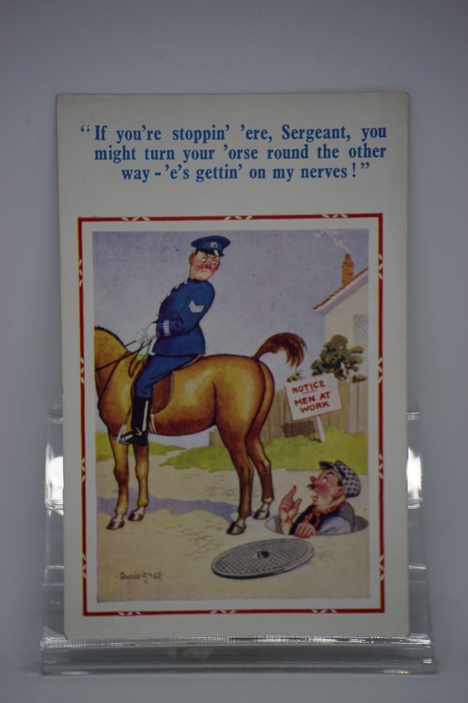 Postcard Seaside Comic Saucy Risqué Police Manhole Constance Donald McGill 1632 "If you're stoppin' 'ere, sergeant, you might turn your 'orse round the other way -'e's gettin' on my nerves!" D. Constance Ltd. 22 Christchurch Rd. London Sw2 New Donald McGill Comic Series No 1632 Unposted. Good vintage condition. No visible damage to any of the edges. All corners slightly bent. Dirt spots, discoloration, creasing, scratches, missing paint and stains marks may be visible on single or both sides of the postcard. Good condition for its age. Please look at the photos for condition details. Additional details : This postcard is quite far from what we know as English humour, marked by fine irony. What do we mean by saucy seaside postcards? The name was coined for cards featuring risqué images and innuendo. These often include images of figures scantily clad and in precarious positions. Many of these designs would not be deemed appropriate today and even at the time, as we will discover, people questioned their impact on the morality of their audience. Pedro, Fitzpatrick, Chas, Quip, L.B. Martin, Maurice, Ajw, Trow, Donald McGill were all an English graphic artists for seaside, risqué, comic satire, humour whose names has become synonymous with the genre of saucy postcards, particularly associated with the seaside (though they were sold throughout the UK). This cards mostly featured an array of attractive young women, fat old ladies, drunken middle-aged men, honeymoon couples and vicars. Many artists behind the designs were influenced by the one who has been called 'the king of the saucy postcard', Donald Fraser Gould McGill (28 January 1875 - 13 October 1962) 'Saucy Postcards' are often collected and appreciated for artistic skill, its power of social observation and earthy sense of humour. Even at the height of fame top artists only earned three guineas a design, but by the 2000s original artwork could fetch thousands of pounds. Keywords: Artist drawn illustration ; Edwardian ; Victorian ; Antique ; Early colour ; Double entendre ; Humorous ; Amusing ; Entertaining ; Innuendo ; Toilet humour ; Dirty jokes ; Rude joke ; Cheeky ; Funny situations ; Novelty ; Big boobs ; Buxom ; Plump ; Thicc ; Busty ; R andy ; Bawdy ; Foreplay ; Courting ; Pretty girl ; Sexy lady ; Sex ; Nude ; Nudes ; Nudist club ; Naturist club ; Naked women ; Naked man ; Naked couple ; Topless ; Nylons ; Stockings ; Love ; Romance ; Wedding ; Marriage ; Wife ; Husband ; Hubby ; Breezybums ; Koolbums ; Fabric ; Cloth ; Rag ; Towel Roller ; Blind garden fence ; Neighbour ; On bed ; On spoon ; Erectile dysfunction ; Holiday ; Bikini ; Beach ; Sand ; Bathing beauty ; Mouse trap ; Hole ; Plumber ; Engineer ; Deckchair ; Pub Inn ; Boomers ; Policeman ; Mounted police ; Notice men at work ; Horse ; Workman in street ; Workman ; Nervous