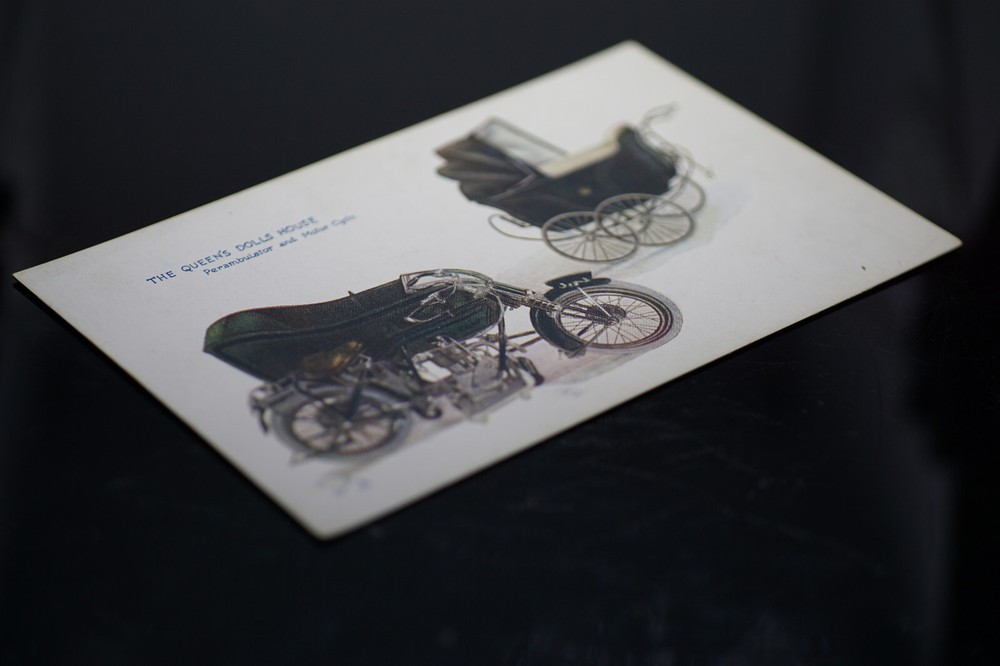 Postcard The Queen's Dolls' House Perambulator (Pram) and Motor Cycle Tuck 4505 Oilette colour lithograph Raphael Tuck & Sons Series VI No. 4505 The Queen's Dolls' House Perambulator and Motor Cycle. One of a series of postcards illustrating aspects on The Queen's Dolls' House, published by Raphael Tuck, 1920s. Queen Mary's Dolls' House is a doll's house built in the early 1920s, completed in 1924, for Queen Mary, the wife of King George V. Boudoir wall designs by Edmund Dulac. It is kept at Windsor Castle. Unposted. Good vintage condition. No visible damage to any of the edges. All corners slightly bent. Dirt spots, discoloration, creasing, scratches, missing paint and stains marks may be visible on single or both sides of the postcard. Good condition for its age. Please look at the photos for condition details.