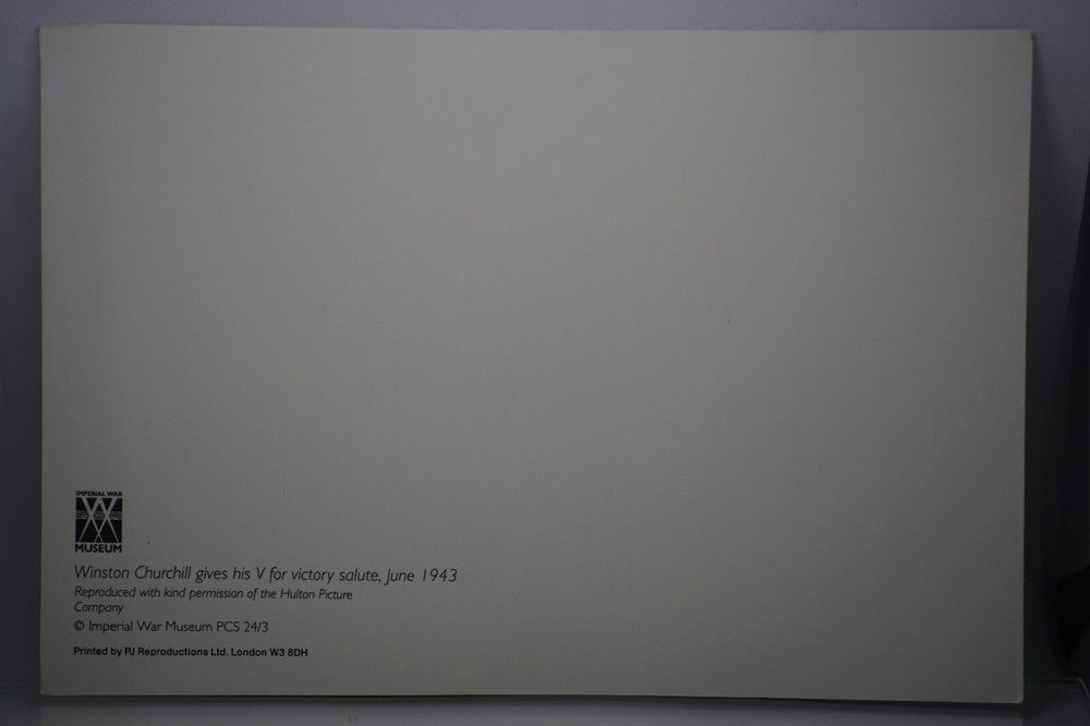 Postcard Winston Churchill Gives His V For Victory Salute June 1943 Imperial War Winston Churchill gives his V for victory salute, June 1943 Reproduced with kind permission of the Hulton Picture Company Imperial War Museum PCS 24/3 Printed by PJ Reproductions Ltd. London W3 80H Unposted. Good vintage condition. No visible damage to any of the edges. All corners slightly bent. Dirt spots, discoloration, creasing, scratches, missing paint and stains marks may be visible on single or both sides of the postcard. Good condition for its age. Please look at the photos for condition details.