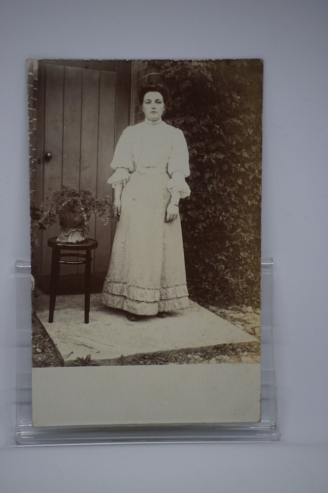 Postcard Woman Lady Portrait Hairstyle Chair Long Dress Edwardian Fashion RPPC Unposted. Good vintage condition. No visible damage to any of the edges. All corners slightly bent. Dirt spots, discoloration, creasing, scratches, missing paint and stains marks may be visible on single or both sides of the postcard. Good condition for its age. Please look at the photos for condition details. Details: RPPC - Real Photo Postcard