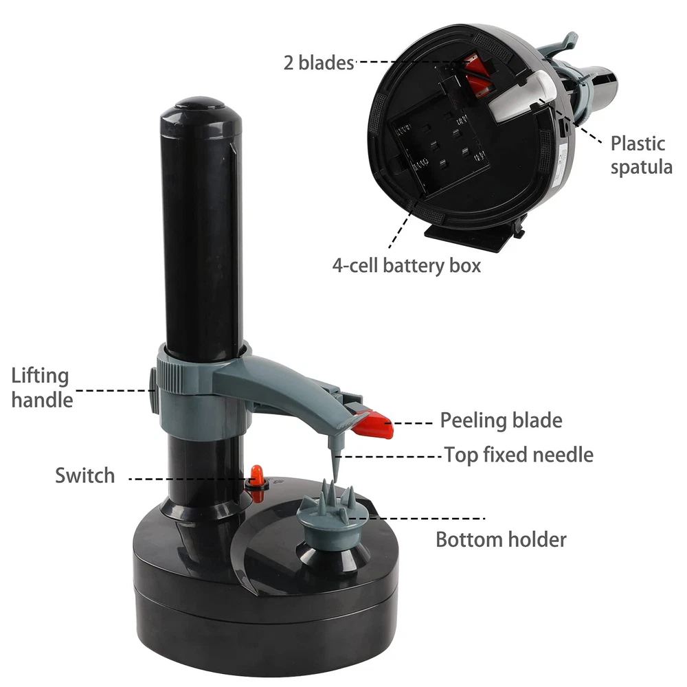 Extra Components: Comes with 13*replaceable blades + 1*thumb knife + apple-shaped paring knife, the thumb knife can dig out potato eyes quickly and easily, 2 replaceable blades + thumb knife tools are all centrally stored in the peeler below the device. You don't need to buy extra blades, saving you money Peeler:The movable fixed needle can adapt to different heights of vegetables and fruits. After the fruit is fixed, the humanized button design, lightly press it, it will start peeling automatically. The robotic arm can adjust the thickness and automatically balance during the peeling process to keep the thickness uniform Sharp Knife & Non-slip Base:Select high quality ABS and stainless steel material, peels fruits and vegetables faster. A potato can be peeled within 10 seconds. It just pares the skin without wasting any of the nutritious part. Durable ABS plastic Non-slip base keep steady on the desk or other working place Multiple Power Source Supply: Utility paring machine can not only function with 4* AA batteries (not included), but also can be used with the charger, charging when you use it (6V Adapter Included). Strong power, high working efficiency Suitable Many Kinds of Fruits & Vegetables:Adjustable robotized arm adjusts to every thickness, shape and textures.It can peel potatoes, sweet potatoes, , zucchini, apples, pears, oranges, lemons, persimmon, mango, kiwi, cucumber, radish, papaya and some other smooth hard fruits and vegetables