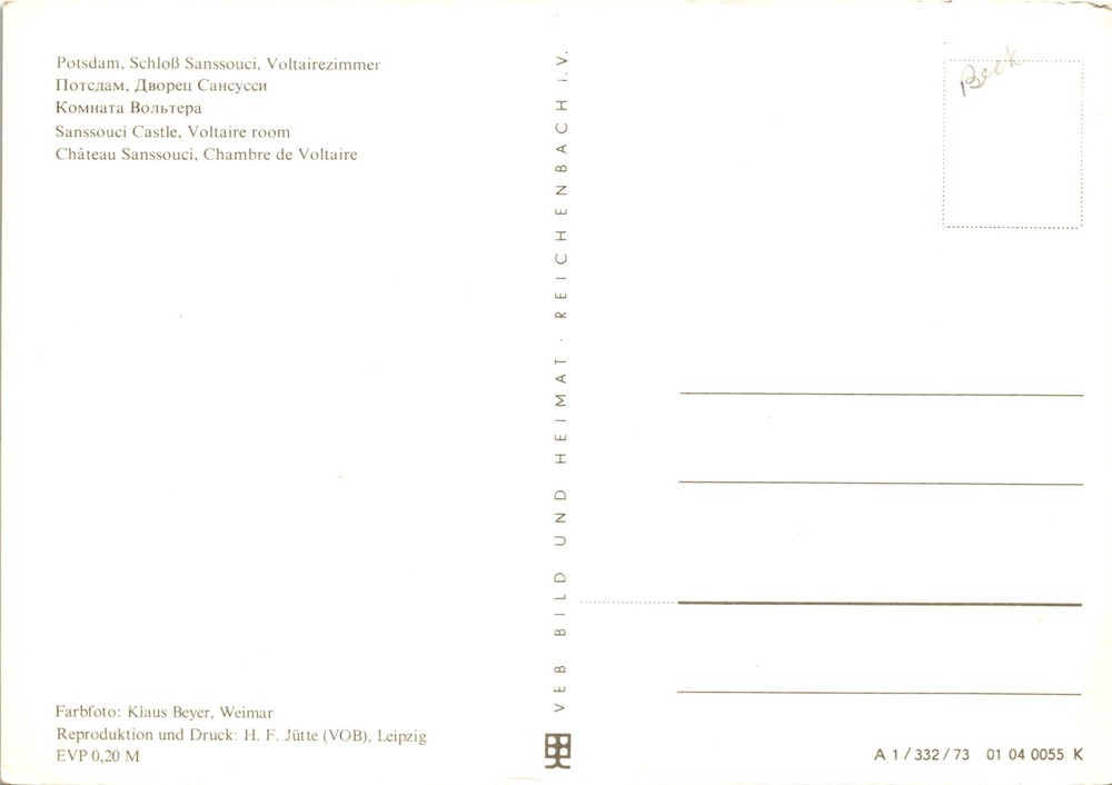 MAKE AN OFFER. THE MORE YOU BUY THE BETTER DEAL I WILL ACCEPT This postcard features a color photo of the Voltaire room in Sanssouci Castle in Potsdam. The text is in multiple languages, including German and Russian. The photo was taken by Klaus Beyer from Weimar, and the reproduction and printing were done by H. F. Jütte (VOB) in Leipzig.