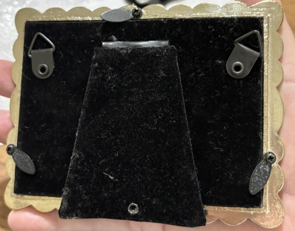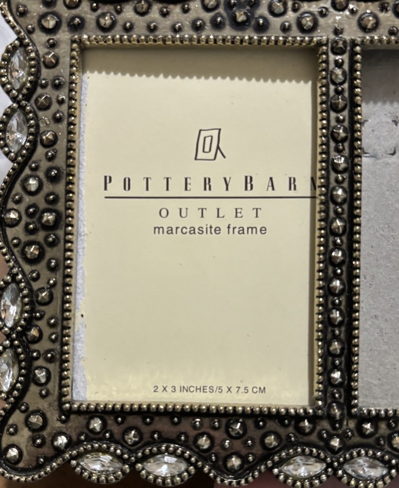 Condition: Pre-owned – Excellent condition. No missing stones noted. Light surface wear consistent with normal handling. Velvet backing intact. Add elegant, vintage-inspired charm to your décor with this beautiful Pottery Barn Outlet double picture frame. This antique brass tone frame features marcasite-style detailing with faceted rhinestone accents and beaded trim. It holds two 2x3 photos and works beautifully for wedding pictures, family portraits, or special memories. Features: • Brand: Pottery Barn Outlet • Holds: Two 2x3 inch photos • Finish: Antique brass / bronze tone • Faux marcasite & rhinestone embellishments • Velvet backing • Easel stand for tabletop display • Wall hanging hardware attached All stones appear intact. Frame is clean and display-ready.