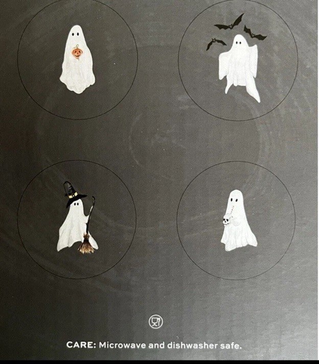 Pottery Barn Scary Squad Stoneware Appetizer Plates - Set Of 4 New in box Crafted of stoneware with a glazed decal finish. Dishwasher and microwave safe Thanks for looking!