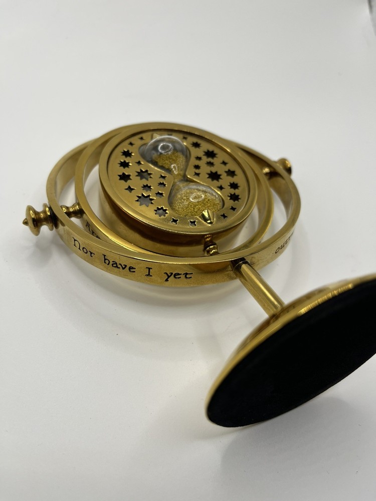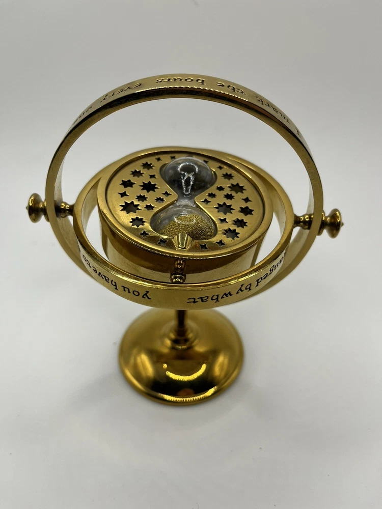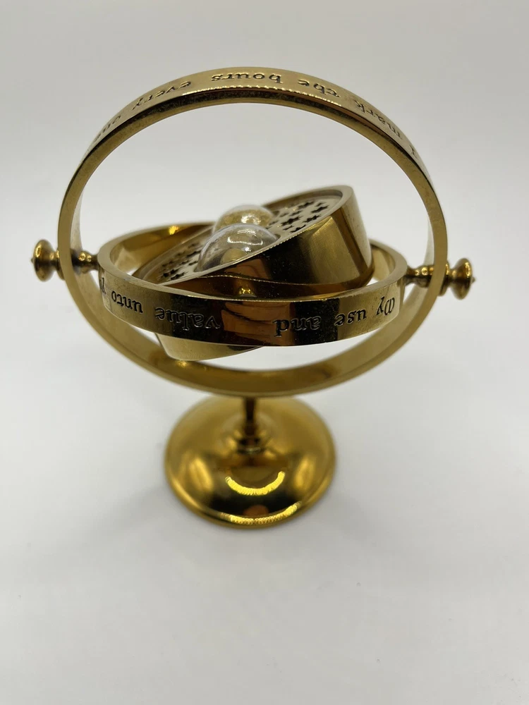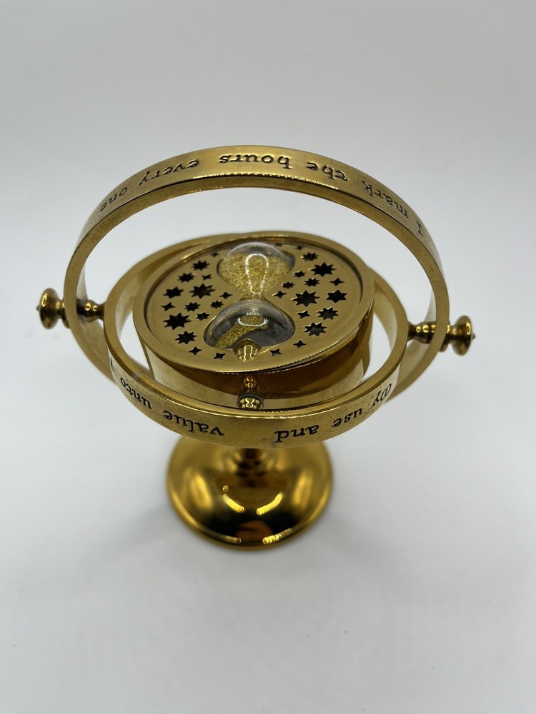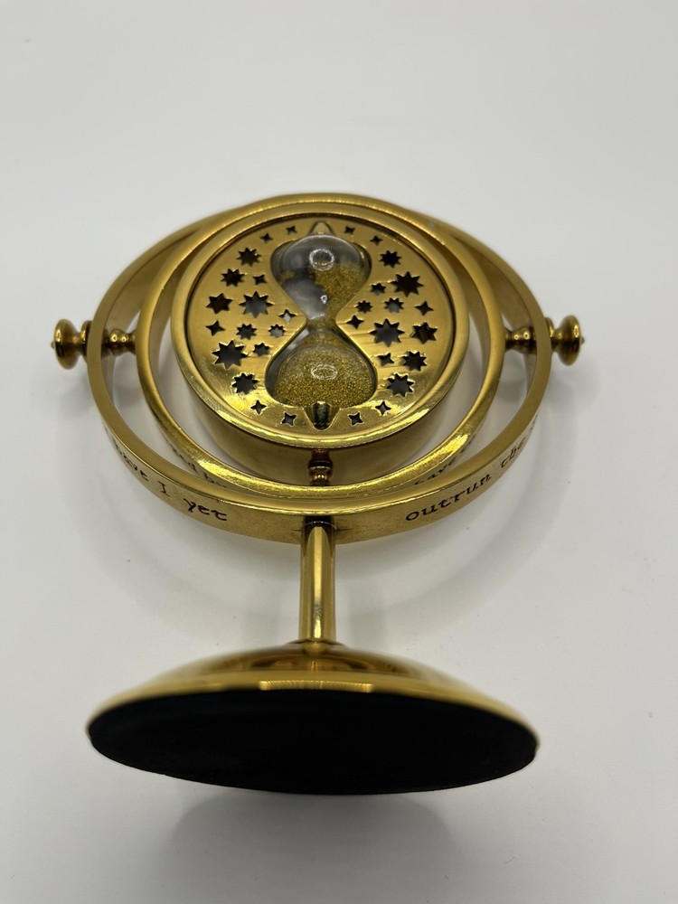 The Pottery Barn Teen Harry Potter Time Turner Desk Clock is a luxurious and magical collectible inspired by the iconic Harry Potter franchise. This reversible quartz clock features intricate details and a shiny gold finish, making it a perfect addition to any fan's collection. With the brand's reputation for quality and design, this clock is sure to enhance any space with a touch of fantasy and wizardry. The clock points downward when the piece is standing on its base as it seems to be a bit off balance