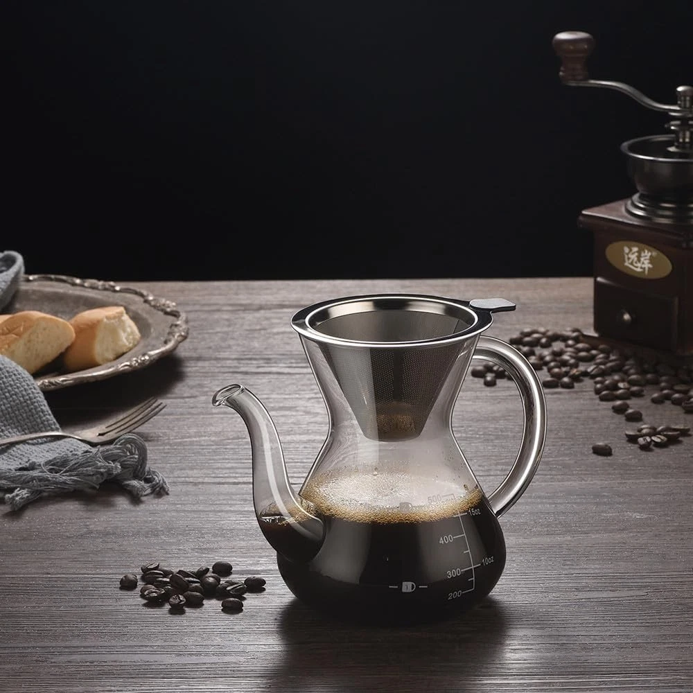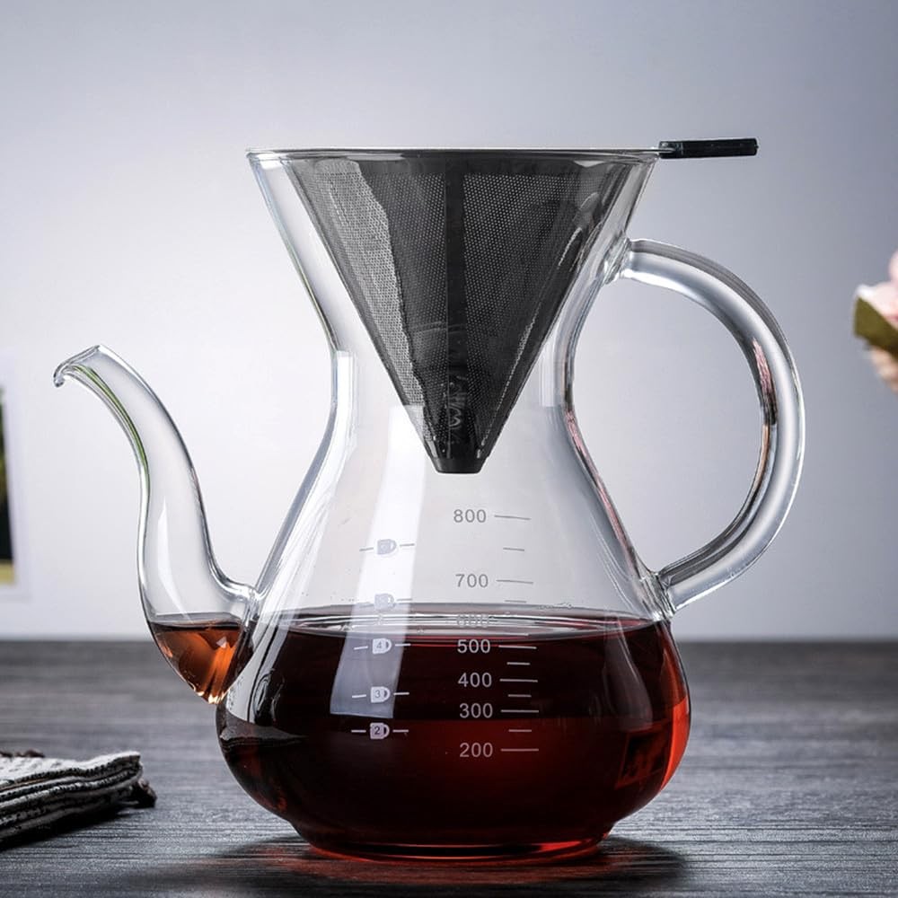 name: Pour into the coffee pot reusable stainless steel filter and the latest borosilicate coffee pot in BPA-free glass water bottle Latest trends: The borosilicate glass coffee pot provides functional and technical design for those who need a more basic and controlled brewing method. Our coffee pot can brew 1-4 cups at a time. Capacity: 34l Material: Borosilicate glass Design: Eagle mouth kettle, can be poured accurately Great for families, parties, and tea time. Also compatible with lemon tea, ice tea or other drinks, enjoy your coffee time user's guidance 1> Put the coarsely ground coffee into the filter 2>Pour boiling hot water slowly into the coffee pot filter. 3> Hold for one minute, remove the filter, pour in and enjoy your coffee time. [Paperless pour into coffee maker steel filter]: Pour the coffee pot into a filter cup equipped with borosilicate glass, double-layer design, one design for fine gauze paperless filtration zero residue, another design Stainless steel round hole cover, double internal and external, so that all coffee nutrients and flavor oil can pass through. [Permanent stainless steel filter]: Disposable filters have become history. They cost money, remove flavors, cause waste and damage the environment. This laser-cut stainless steel mesh filter ensures that the odor falls on your lips instead of falling into the trash 【Fine Mouth Kettle Kettle】This elegant pouring coffee pot is designed with fashionable olecranon. It is exquisite and compact in shape and easy to carry. It is ergonomically designed. The coffee liquid is smooth and not easy to leak. Easy to use and clean. [Perfect Service]: This coffee machine provides a perfect choice for families, parties, and afternoon tea. It is also compatible with lemon tea, ice tea or other beverages. Our coffee pot can brew 3-6 cups cups at a time.(Comes with a stainless steel two-in-one coffee and tea spoon) [Attention to heat protection] The coffee pot uses high borosilicate, which can withstand the temperature change of -20°C-150°C, and will not produce any chemical impurities in your handmade coffee. When brewing coffee by hand, safety is important. The tipping coffee machine kit has a heat-resistant silicon collar that enhances grip and prevents burns when pouring hot water. The dishwasher is safe. Can be used at home, travel or office. 34oz.