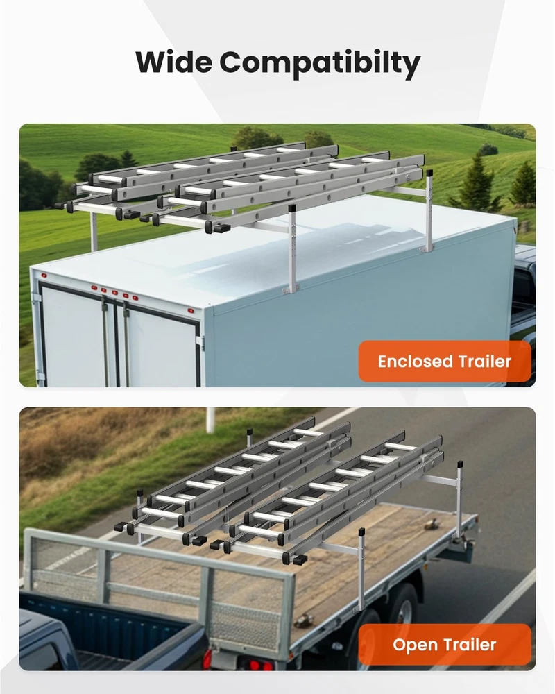 Heavy-Duty Steel Construction: Trailer ladder rack built with heavy-duty steel offers outstanding strength and durability. Finished with a sliver powder-coated surface, it's made to withstand harsh outdoor conditions 400 LBS Load Capacity: Dual-rack design with reinforced welding supports up to 400 lbs of evenly distributed weight. Perfect for carrying ladders, lumber, pipes, and more Adjustable Width and Height: Ladder Rack adjusts from 5.77 ft to 8.65 ft in width and 16.5 inch to 24.5 inch in height, allowing flexible installation on most enclosed and open trailers. Easy to trim and fit as needed Easy Installation: Comes with all mounting hardware and clear instructions for quick setup. Self-tapping screws and heavy-duty bolts ensure secure attachment Secure and Versatile Transport: Ladder Rack built-in ladder stoppers prevent shifting during transit. Ideal for transporting ladders, kayaks, lumber, or other oversized items On Nov 3, 2025 at 11:10:10 PST, seller added the following information: