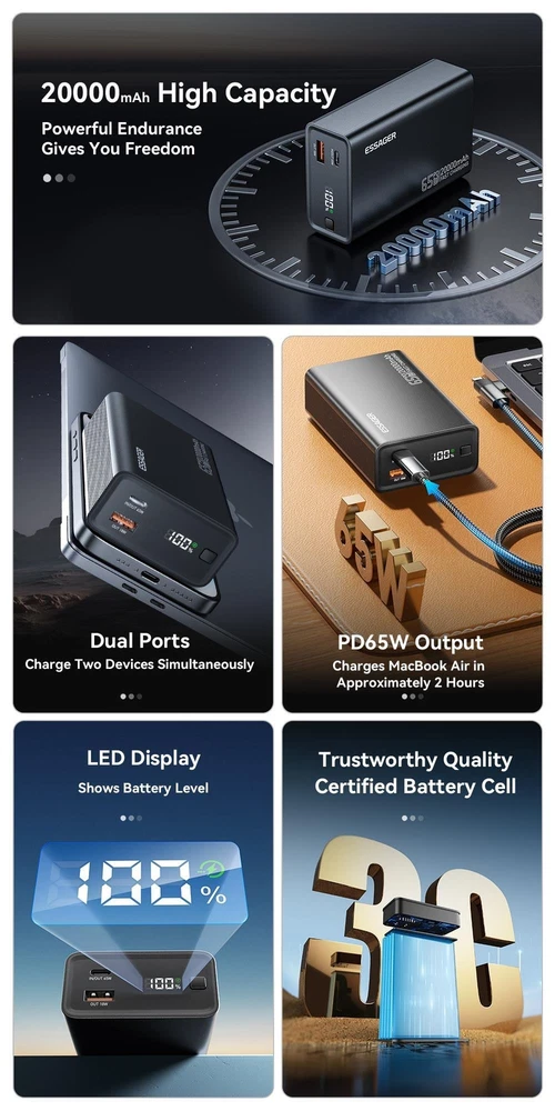 Free and fast shipping , shipping take up 1-7 Business Days 30 Day Return Accepted EASY PAYMENT via PayPal, Credit Card, PayPal Credit, Google Pay... Power Bank 20000mah Mobile Phone Plastic Mini Black 2-usb 5v Backup 65w Brand:Essager Function 1:QC PD 3.0 Fast Charge Power Bank / 20000mAh Powerbank Function 2:PD2.0 / PD3.0 / SCP / FCP / PPS / QC2.0 / QC3.0 / QC4.0 / AFC Power Bank 20000 mAh Feature 1:With Typec cable, 65w Fast Charging Feature 2:Fast Portable Charger / Power Bank 20000mAh, Battery Bank / Pover Bank Feature 3:Portable Battery / Portable Phone Charger / Mobile Phone Power Bank Feature 4:USB Poverbank / Quick Charge 3.0 Power Pack / Batery Charger Feature 5:Fast Charge Power Bank / External Battery Charger / battery pack Feature 6:Essager Quick Charge With USB Type C Cable 20000mAh Power Bank REVIEWS The product came very well packaged. I'm very happy. thank you for everything. Seller strongly recommended. This is great! I definitely recommend! Product looks amazing Delivery was fast. Excellent seller, great communication. I advise everyone to buy it!