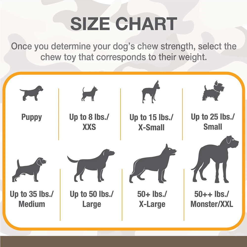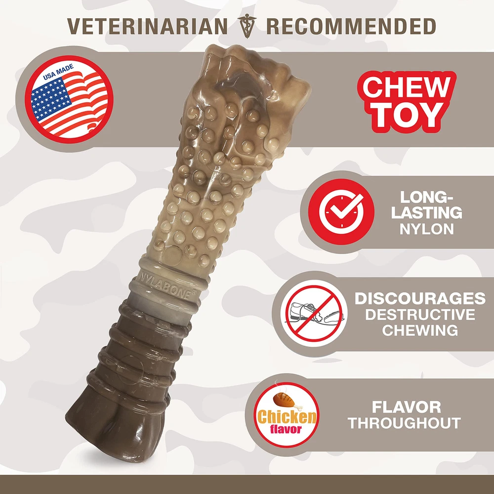 has been creating products for furry friends of every breed, personality, and size since 1955. We are proud to partner with the movie Dog to offer a limited-edition chew toy! The movie, starring and directed by Channing Tatum, follows the story of a former army ranger and a Belgian Malinois on a heartfelt journey together. This special Power Chew toy features a custom-made camouflage design and challenges extreme chewers. Made of our toughest material, the long lasting chew toy provides ongoing enjoyment, satisfies the natural urge to chew, and encourages positive chewing habits. Plus, it is of our most popular shapes, featuring ridges and nubs to help clean teeth and freshen breath as your dog chews. Reward your furry friend with this USA-made camouflage chewing toy for dogs, available for a limited time only! SPECIAL EDITION - Unique camouflage design is custom-made for the movie MADE OF OUR TOUGHEST MATERIAL - Durable chew toy challenges even the most extreme chewers PROMOTES DOG DENTAL - Ridges and nubs help prevent plaque and tartar buildup as dogs chew FUN & OCCUPYING - Multi-textured dog bone chew toy keeps dogs busy while satisfying their natural urge to chew MADE IN THE USA - Dog chew toy is proudly made in the United States FOR EXTRA-LARGE DOGS - Size Souper chew toy created for dogs 50+ pounds FLAVOR DOGS LOVE - Features delicious chicken flavor throughout