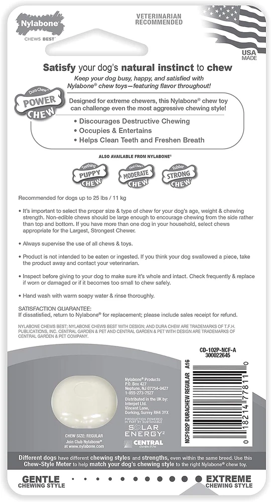 FUN & OCCUPYING - Multi textured chew toy keeps dogs busy while satisfying their natural urge to chew MADE OF DURABLE NYLON - Long lasting dog chew toy challenges even the most aggressive chewers and discourages destructive chewing SUPPORTS DOG DENTAL HEALTH - Helps clean teeth and freshen breath as dogs chew MADE IN THE USA Dog chew toy is proudly made in the United States Regular chew toy intended for dogs up to 25 pounds Features savory chicken flavor throughout When out of package, chew toy measures 4.5" long x 1" wide x 1.75" high TRUSTED CHEW TOYS WITH HEART & PURPOSE - Every chew toy’s unique shape, individual texture, and gotta-have-it flavor is created with purpose and love to give your dog what they need, when they need it! Treat your best friend to two delicious chew toy flavors! The Combo Pack features 2 long-lasting Power Chew toys in a classic bone shape dogs love: 1 in irresistible bacon flavor and the other in delicious chicken flavor. They are designed with our toughest material and help clean teeth & freshen breath as your dog chews! Made with heart and purpose, these veterinarian-recommended chew toys are a must-have for every powerful chewer.