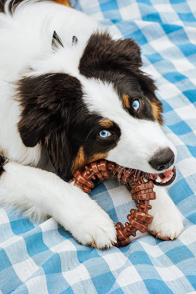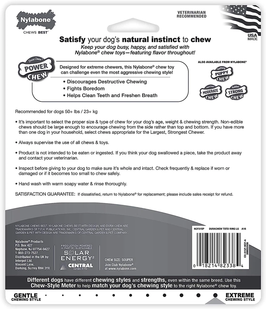 Power Chew Textured Dog Chew Ring Toy, Dog Toys for Aggressive Chewers, Flavor MADE OF DURABLE NYLON - Long-lasting dog toy for aggressive chewers discourages destructive chewing TEXTURED RING SHAPE - Engaging chew toy for dogs is easy for furry friends to hold and chew PROMOTES DOG DENTAL HEALTH - Ridges and nubs help prevent plaque and tartar buildup as dogs chew MADE IN THE USA - Dog chew toy is proudly made in the United States FLAVOR MEDLEY THROUGHOUT - Chew toy features an enticing flavor dogs love FOR EXTRA-LARGE DOGS - Size Souper chew toy intended for dogs over 50 pounds CHEW TOY DIMENSIONS - Out of package measures 6.5" long x 2" wide x 2.06" high TRUSTED CHEW TOYS WITH HEART & PURPOSE - Every chew toy’s unique shape, individual texture, and gotta-have-it flavor is created with purpose and love to give your dog what they need, when they need it! ABOUT POWER CHEW TOYS Made from our toughest nylon material, Power Chew toys challenge even the most extreme chewing styles! These durable dog chew toys for aggressive chewers come in many different shapes and enticing flavors to discourage destructive chewing, help clean teeth, and simply keep dogs happy! A WELL-ROUNDED CHEWING EXPERIENCE The Power Chew textured ring chew toy offers a fun change from the traditional bone shape! This dog teeth cleaning toy includes engaging ridges and nubs that help prevent plaque and tartar buildup as your dog chews. Plus, it features delicious flavor throughout for an even more exciting dog toy! Satisfy your best friend’s natural urge to chew with this USA-made, durable dog toy. Color may vary. MEET NYLABONE – THE CHEWING EXPERTS We’ve been making the very best chewing solutions since 1955, so we know a thing or two about CHEW! Fast-forward 60+ years and pet parents continue to trust our family-founded company for high-quality chew toys, tasty treats, fun play toys, and easy-to-use dental products. To put it simply: Nylabone Chews Best. GUARANTEED YOUR DOG WILL LOVE IT Before we introduce new dog products to furry friends and pet parents everywhere, we make sure our very own dogs love them first! If you’re not happy with your Nylabone chew toy for any reason, simply return it to us with the sales receipt for your money back. Or, reach out to our Consumer Care team so we can help make it right (and talk about how much we also love our dogs). 1.38 inches x 5.63 inches x 5.63 inches. Weight: 0.8 oz Item model number NCF315P Age Range Description All Life Stages Warranty Description Satisfaction Guarantee: if dissatisfied, return to ® for replacement; please include sales receipt for refund. Number of Items 1 Country of Origin United States Style Ring Target Audience Keyword dogs Department Unisex-Adult Breed Recommendation Large Product Dimensions 5.63 x 1.38 x 5.63 inches; 0.8 ounces Material Nylon Flavor Name Flavor Medley Is Discontinued By Manufacturer No Item Package Dimensions L x W x H 8.43 x 7.2 x 1.54 inches Model Name Power Chew Customer Favorites Textured Ring Item Weight 0.8 Ounces Specific Uses for Product Chewing Item Dimensions LxWxH 5.63 x 1.38 x 5.63 inches Color Textured Ring Included Components Textured Ring Power Chew Toy for Dogs, Dog Toys for Aggressive Chewers, Flavor Medley, X-Large - 50+ lbs, 1 Count Size X-Large/Souper (1 Count)