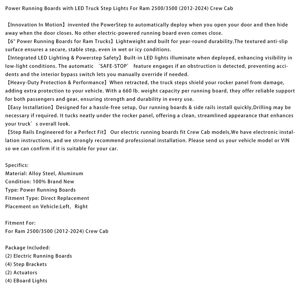 Product Description Power Running Boards with LED Truck Step Lights For Ram 2500/3500 (2012-2024) Crew Cab 【Innovation In Motion】invented the PowerStep to automatically deploy when you open your door and then hide away when the door closes. No other electric-powered running board even comes close. 【6" Power Running Boards for Ram Trucks】Lightweight and built for year-round durability.The textured anti-slip surface ensures a secure, stable step, even in wet or icy conditions. 【Integrated LED Lighting & Powerstep Safety】Built-in LED lights illuminate when deployed, enhancing visibility in low-light conditions. The automatic ‘SAFE-STOP’ feature engages if an obstruction is detected, preventing accidents and the interior bypass switch lets you manually override if needed. 【Heavy-Duty Protection & Performance】When retracted, the truck steps shield your rocker panel from damage, adding extra protection to your vehicle. With a 660 lb. weight capacity per running board, they offer reliable support for both passengers and gear, ensuring strength and durability in every use. 【Easy Installation】Designed for a hassle-free setup, Our running boards & side rails install quickly,Drilling may be necessary if required. It tucks neatly under the rocker panel, offering a clean, streamlined appearance that enhances your truck’s overall look. 【Step Rails Engineered for a Perfect Fit】 Our electric running boards fit Crew Cab models,We have electronic installation instructions, and we strongly recommend professional installation. Please send us your vehicle model or VIN so we can confirm if it is suitable for your car. Specifics: Material: Alloy Steel, Aluminum Condition: 100% Brand New Type: Power Running Boards Fitment Type: Direct Replacement Placement on Vehicle:Left,Right Fitment For: For Ram 2500/3500 (2012-2024) Crew Cab Package Included: (2) Electric Running Boards (4) Step Brackets (2) Actuators (4) EBoard Lights ⚠ COMPATIBILITY WARNING • DO NOT GUESS FITMENT • Verify [Year][Make][Model][Engine][Submodel] • Cross-check OEM#: [XXX-XXX-XXX] ♦Need Help? Send: 1:VIN (17-digit) 2:Original part photos 3:Your vehicle specs SHIPPING & HANDLING RETURNS WARRANTY FEEDBACK ♦Every item will be inspected and packed carefully before shipping. ♦Processing Time: shipped within 3 business days (Mon-Fri, excludes holidays) ♦Estimated delivery time : 3-5 business days . ♦Tracking Info: Provided automatically via eBay. ♦All orders will be shipped through USPS First Class, UPS and Fedex depends on the weight of the items. ♦ Fast & Reliable Shipping – Your order is our priority! 🌍 Ships from U.S. Warehouse – No long waits! 📦 Standard Shipping (Free): 3-5 business days (U.S. only). 🔸 60-Day Hassle-Free Return Policy We offer 60-day free returns for your peace of mind. To ensure a smooth process, please contact us first before opening a return request—we’ll gladly help resolve any issues! 🔸 Return Requirements: ✅ Unused & in original packaging ✅ Contact us immediately if the item is defective/damaged (photos/video required) ✅ Repack securely to prevent shipping damage ⚠️ Important Notes: • If returning due to change of mind, please select: "Changed mind" or "Didn't like item" Defective/damaged items? Contact us immediately with photos/video proof • Incorrect return reasons (e.g., falsely claiming "defective") may result in a refused refund. 🔸 Return Process: Contact us → We’ll provide return instructions. Ship the item back with tracking (recommended). We inspect returns within 3-5 business days. Approved refunds are issued to your original payment method (processing time varies by bank). 🔸 Need Help? Message Us First! We’re happy to offer alternative solutions, including replacements or discounts, before you proceed with a return. Your satisfaction is our top priority! �� 🔸 Covered Products: All parts sold in our store (warranty duration varies by item - see product description) ⏳ Warranty Period: • Standard Parts: 180_days • Wear Items: 60 days 🔸 What's Covered: ✓ Manufacturing defects ✓ Material failures under normal use ✖ What's Not Covered: ✗ Installation errors ✗ Physical damage (drops, accidents) ✗ Unauthorized modifications ✗ Normal wear & tear Claim Process: Contact us via eBay Messages within warranty period Clear photos/video of the issue We respond within 24-48 hours with solution 🔸 Feedback & Satisfaction Policy Your 5-Star Reviews Help Us Grow! We're committed to your complete satisfaction. When you receive your item and are happy: ✅ Please consider leaving positive feedback about your experience ✅ Share what you loved (fast shipping? great packaging? accurate description?) 🔸Our Promise to You: ✔ 100% satisfaction guarantee - we stand behind our products ✔ Open, honest, and timely communication ✔ Always respond within 24 hours to any concerns 🔸 Before Leaving Feedback: • Contact us first if anything is less than perfect • Allow us to make it right (replacement/refund/store credit) • Negative feedback won't solve issues - but we will! 🔸Important Notes: • Feedback about shipping carriers should go to their official channels • eBay cases opened without contacting us first void satisfaction guarantees We value your voice - let's work together for a great eBay experience! SHIPPING & HANDLING ♦Every item will be inspected and packed carefully before shipping. ♦Processing Time: shipped within 3 business days (Mon-Fri, excludes holidays) ♦Estimated delivery time : 3-5 business days . ♦Tracking Info: Provided automatically via eBay. ♦All orders will be shipped through USPS First Class, UPS and Fedex depends on the weight of the items. ♦ Fast & Reliable Shipping – Your order is our priority! 🌍 Ships from U.S. Warehouse – No long waits! 📦 Standard Shipping (Free): 3-5 business days (U.S. only). RETURNS 🔸 60-Day Hassle-Free Return Policy We o
