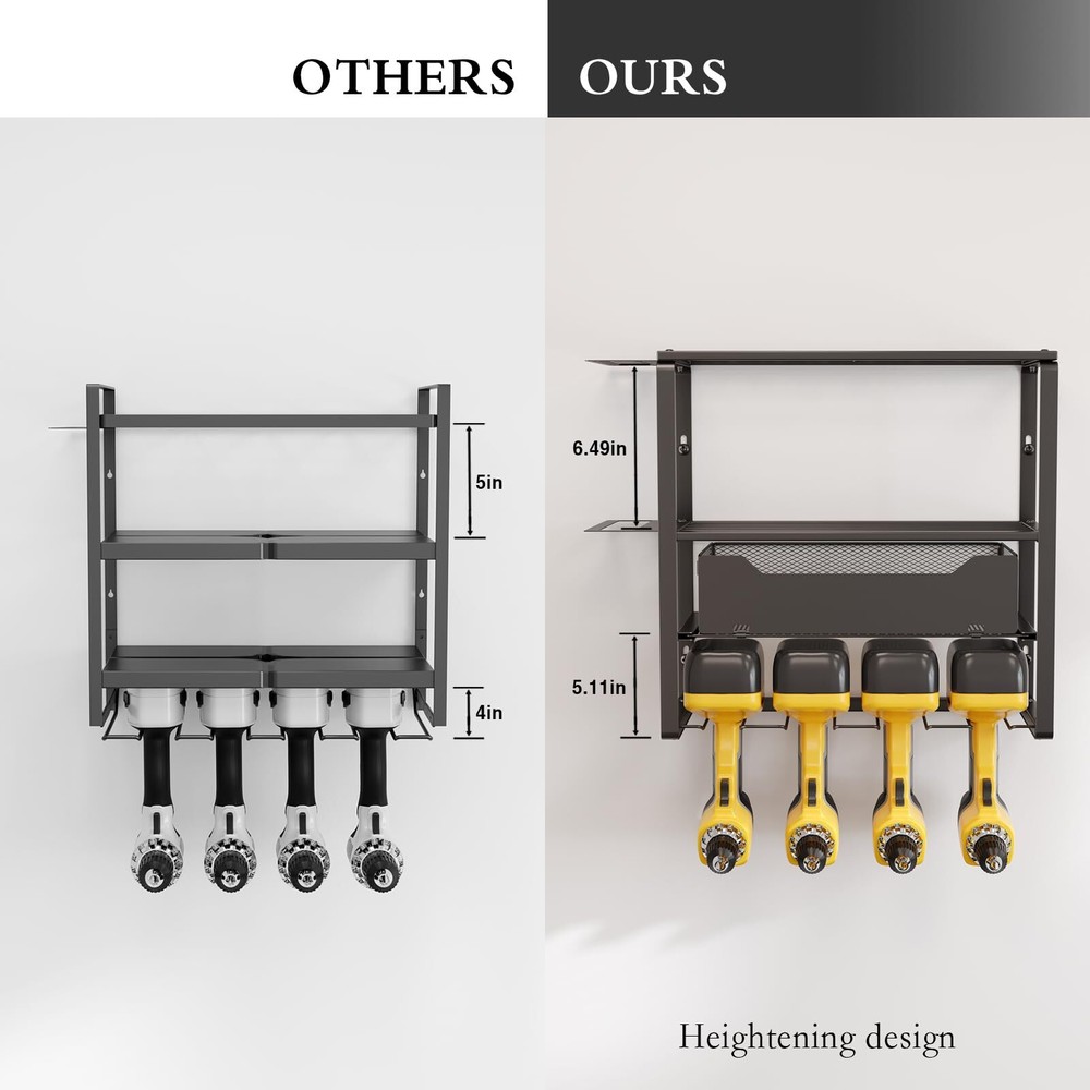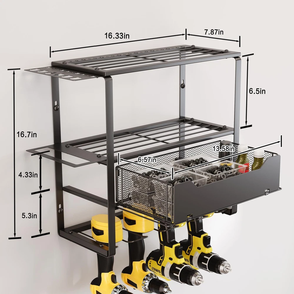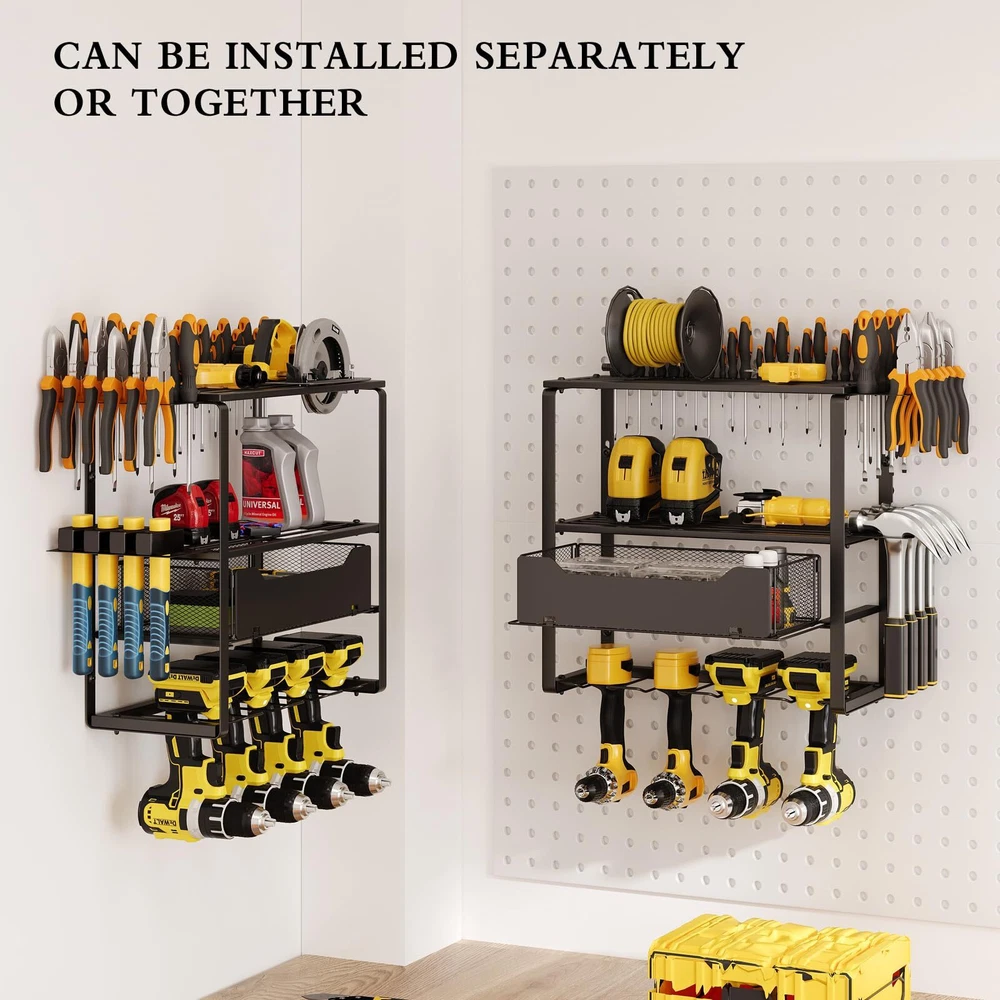 【Four Tiers High Capacity Storage】This tool shelf is designed with four tiers high capacity. The third tier are two pull-out drawers to increase the diversity of tools stored, the bottom tier can store 8 cordless drills, the top three tiers can store other heavy-duty tools or a variety of small tools, with hammer holders, pliers holders and screwdriver holders on the side. 【Strong Load-bearing Capacity】The garage tool organizer is made of thickened heavy-duty steel metal with greater load-bearing capacity and durability, it can be kept for a long period of time without deformation when storing tools, after extensive load testing, you don't have to worry about the shelf breaking or the power tool storage rack falling off the wall. 【Planned Space】This heavy duty tool organizer takes full advantage of wasted wall space to display and place your handheld tools into a compact and efficient area. This drill holder wall mount tool manager helps you keep all your frequently used project tools neatly organized and within reach. This is not only a space saver, but a greater time saver in finding your tools. 【Easy to Install】The power tool organizer has a detachable design, refer to the professional installation manual, you just need to attach the steel frame and screws, then hang it on the wall. It only takes a few minutes to assemble the heavy tool organizer on the wall in your garage, workshop or studio. 【Optimized Details】The edges of each piece of metal on this garage tool organizer are polished and rounded, so your fingers won't get scratched. Each slot slopes upward in the front to ensure your tools won't slide out.
