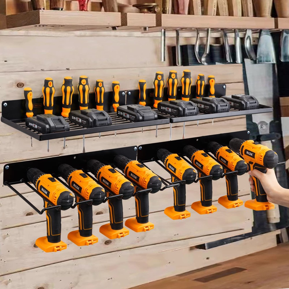 Organize Power Tools: This organizer holds power tools and drill accessories on the wall for easy access and organization. Solid Metal Construction: Made from heavy duty metal with a black finish for durability and style. Wall Mounted Design: Comes with a wall mount bracket for quick and easy installation. Multi-Tier Storage: Features two shelves and two tool racks for flexible storage options. Weight Capacity: Holds up to 50 pounds of tools and accessories for heavy-duty use.