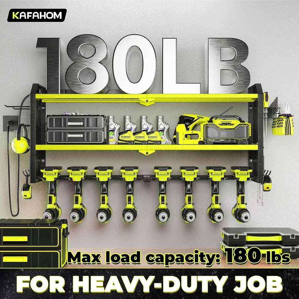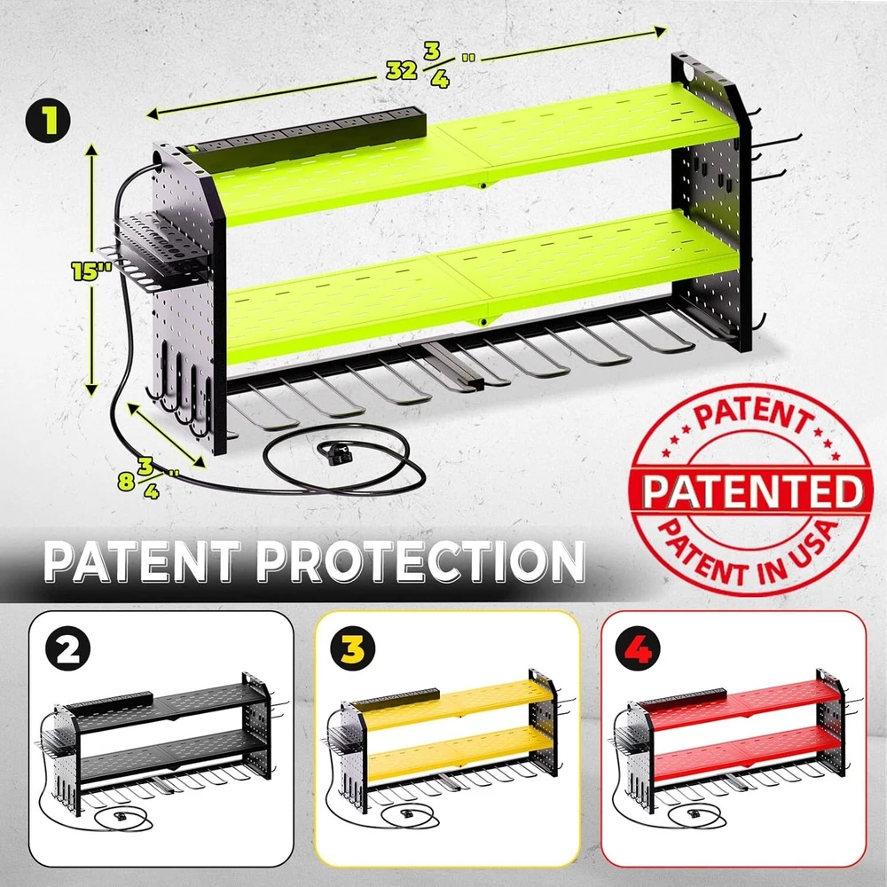 Power Tool Organizer with Charging Station, Built in 8 Outlet Power Strip,Large 8 Drill Holder Wall Mount, Heavy Duty Metal Power Tool Storage Rack Tool Shelf for Garage Organization Efficient Storage: The Electric Tool Rack is designed with three tiers and eight dedicated slots to efficiently store your electric tools. The top tier features a built-in charging station, enabling direct charging while tools are power cord is 7 FT long 14AWG,and the charging station is 15A 125VAC 1875W 60Hz. Robust Construction: Built to last, tool box organizers and storage wall mount features a sturdy alloy frame and reinforced double-layered metal plates for exceptional load-bearing capacity. It's the ideal utility cordless drill holder for a wide range of tools and accessories. Customizable Space: The middle layer of garage organization rack can be adjusted to accommodate items of varying heights or removed entirely for tailored storage. This flexibility allows you to organize your tools and equipment as needed. Easy Installation: garage wall shelving schieve maximum stability with a straightforward installation process. Whether you're mounting it on a wooden wall, concrete surface, or pegboard, this tool rack wall mount is designed for easy and secure attachment.Amazing christmas or father's day gift for men. Total Garage Organization: Finally, a storage solution that can accommodate all your tools in one place. From hammers and screwdrivers to drills, saws, toolboxes, chargers, and batteries, everything has a dedicated spot on the rack. Welcome to Where we specialize in top-notch storage solutions!