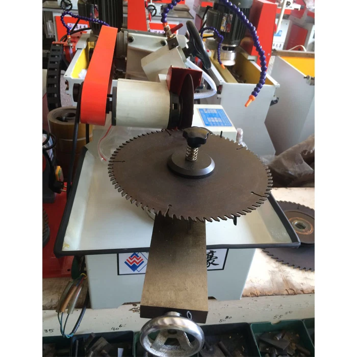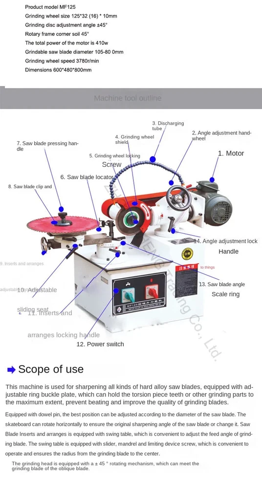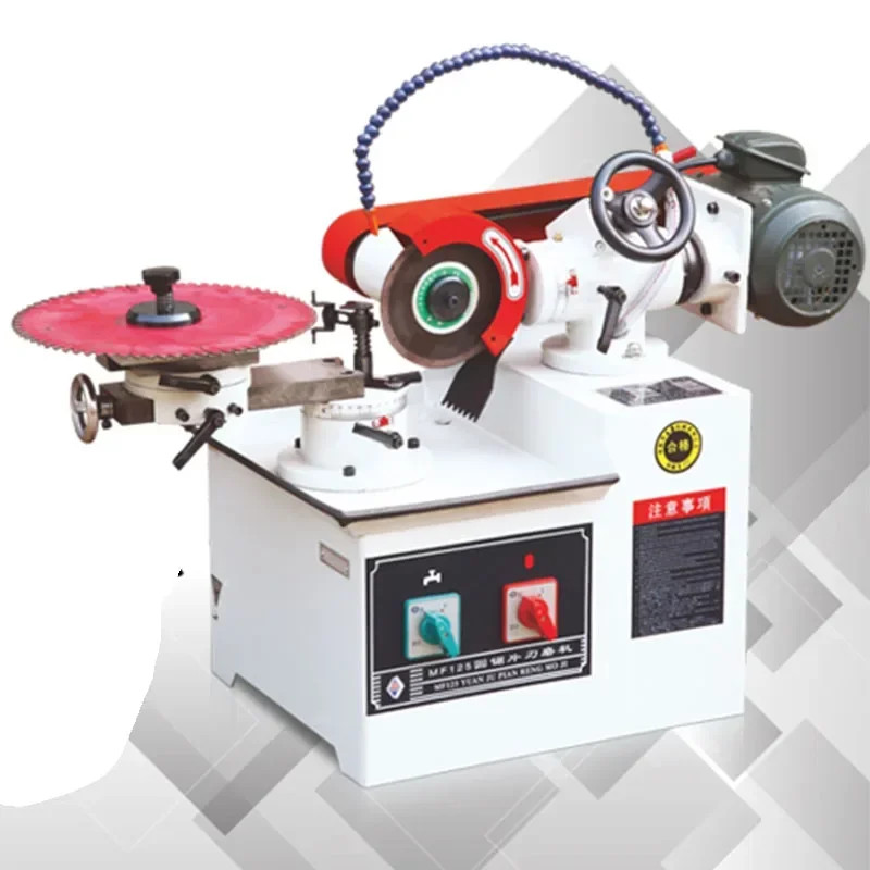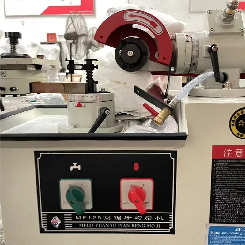 Power Tools MF125 Alloy Saw Blade Grinding Machine Small Manual Saw Blade 220V This machine is designed for sharpening various carbide saw blades. It features an adjustable ring clamp that maximizes support for the tooth face or other workpieces, preventing vibration and enhancing sharpening quality. Equipped with positioning pins, it allows adjustment to the optimal position based on the saw blade diameter. The sliding plate pivots horizontally, ensuring the saw blade's original grinding angle can be maintained or altered. The saw blade carriage features a swivel platform for adjusting the feed angle during grinding. This platform incorporates a slider, mandrel, and limit screw, facilitating operation while guaranteeing the grinding radius to the center. The grinding head includes a +45° rotation mechanism to accommodate grinding beveled saw blades.