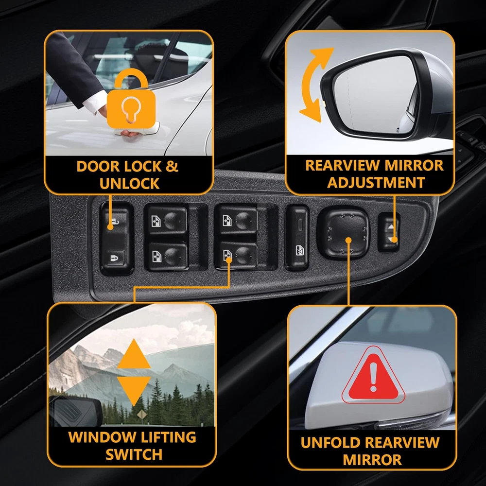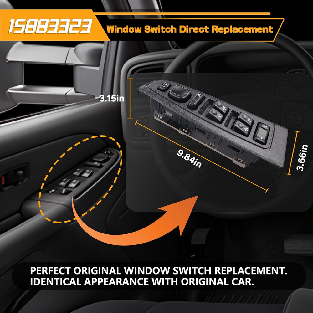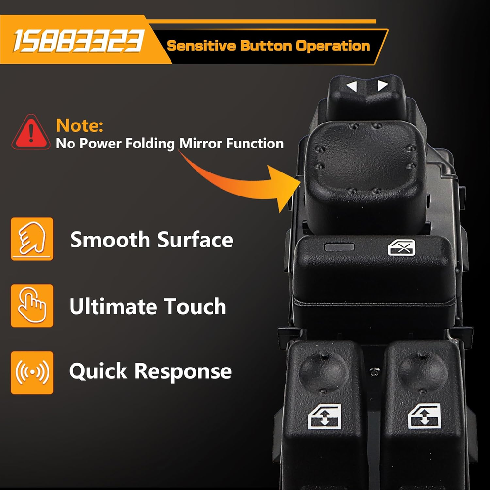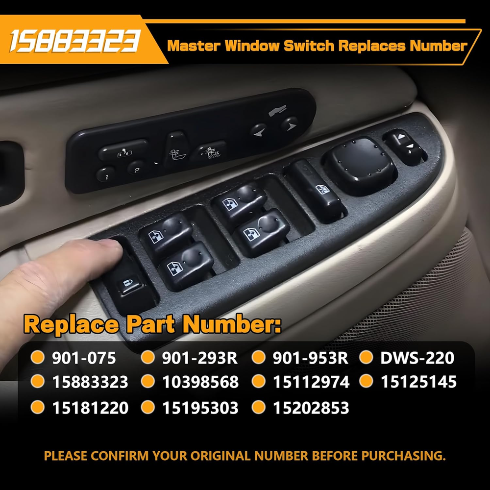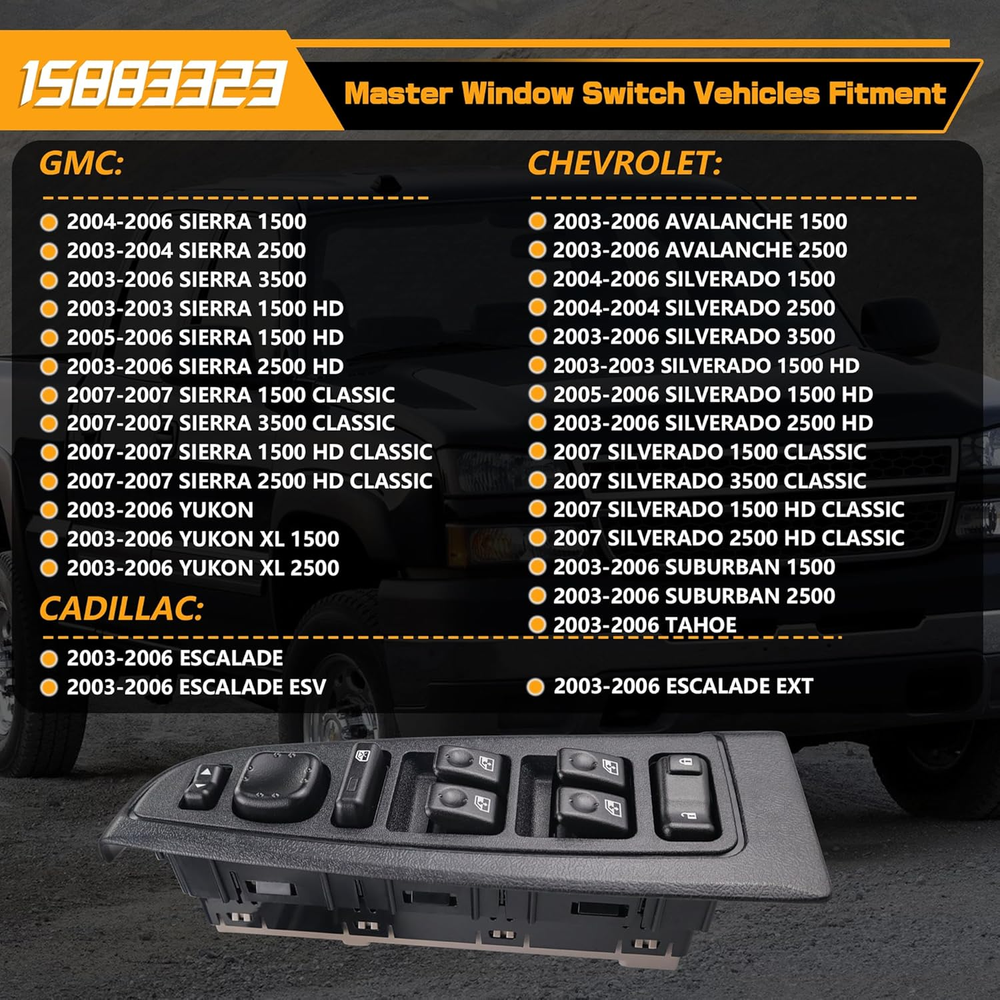 Replace Part Number: 901-075, 901-293R, 901-953R, DWS-220, 15883323, 10398568, 15112974, 15125145, 15181220, 15195303, 15202853. Please check the part number of original switch before ordering. Vehicle Fitment-1: Compatible with Chevrolet Avalanche 1500/2500 03-06, Silverado 1500 04-06, Silverado 2500 04, Silverado 3500 03-06; Silverado 1500 HD 03, Silverado 1500 HD 05-06, Silverado 2500 HD 03-06, Silverado 1500/3500 Classic 07; Silverado 1500/2500 HD Classic 07, Suburban 1500/2500 03-06, Tahoe 03-06. Vehicle Fitment-2: Compatible with GMC Sierra 1500 04-06, Sierra 2500 04, Sierra 3500 03-06, Sierra 1500 HD 03, Sierra 1500 HD 05-06, Sierra 2500 HD 03-06, Sierra 1500/3500 Classic 07, Sierra 1500/2500 HD Classic 07, Yukon 03-06, Yukon XL 1500/2500 03-06; Compatible with Cadillac Escalade 03-06, Escalade ESV/EXT 03-06. Precise Design: Perfect original switch replacement, very easy to install, ideal solution for your defective window switch. Premium Quality: This window door switch assembly is made of quality ABS & polycarbonate material to provide better performance and sensitive. Product Description
