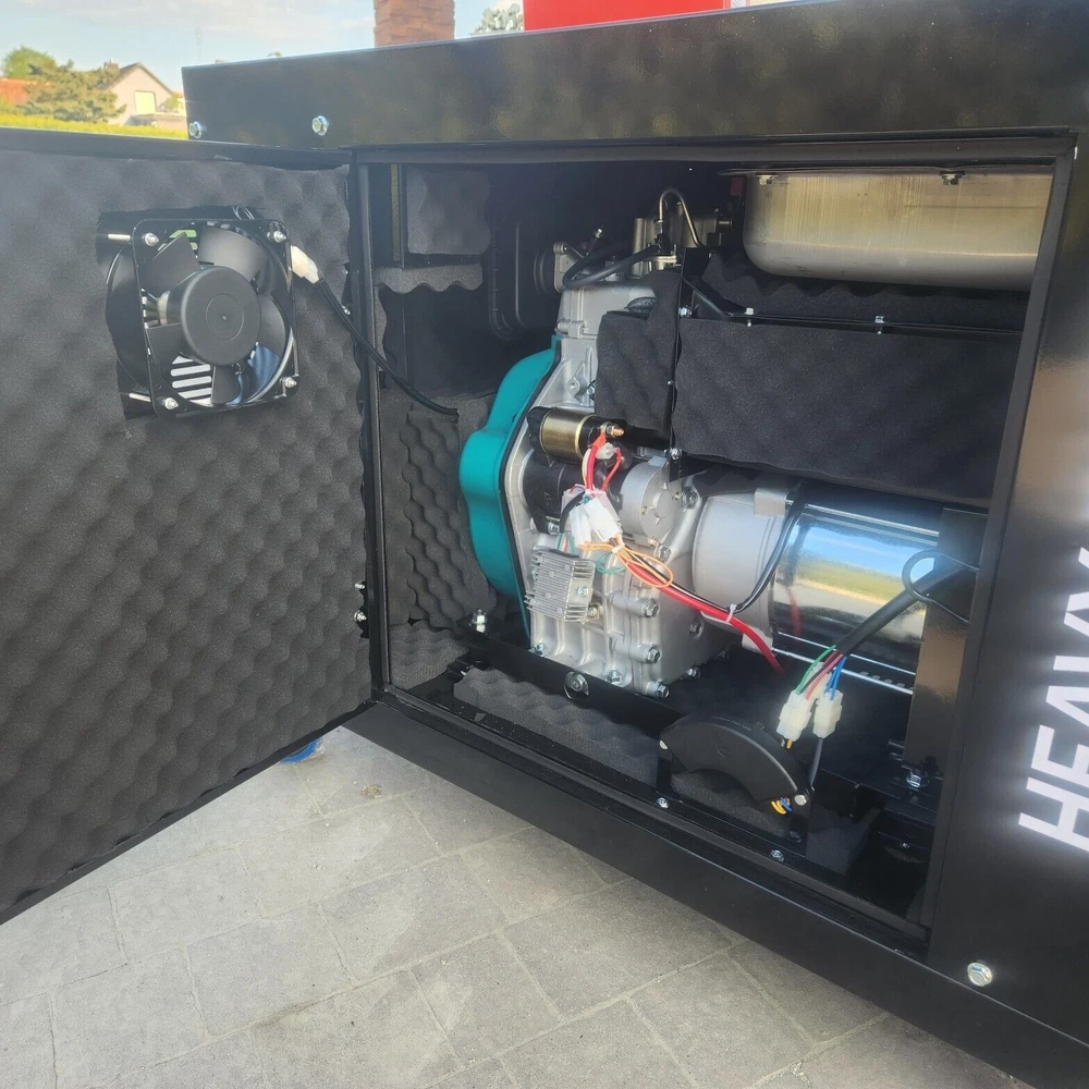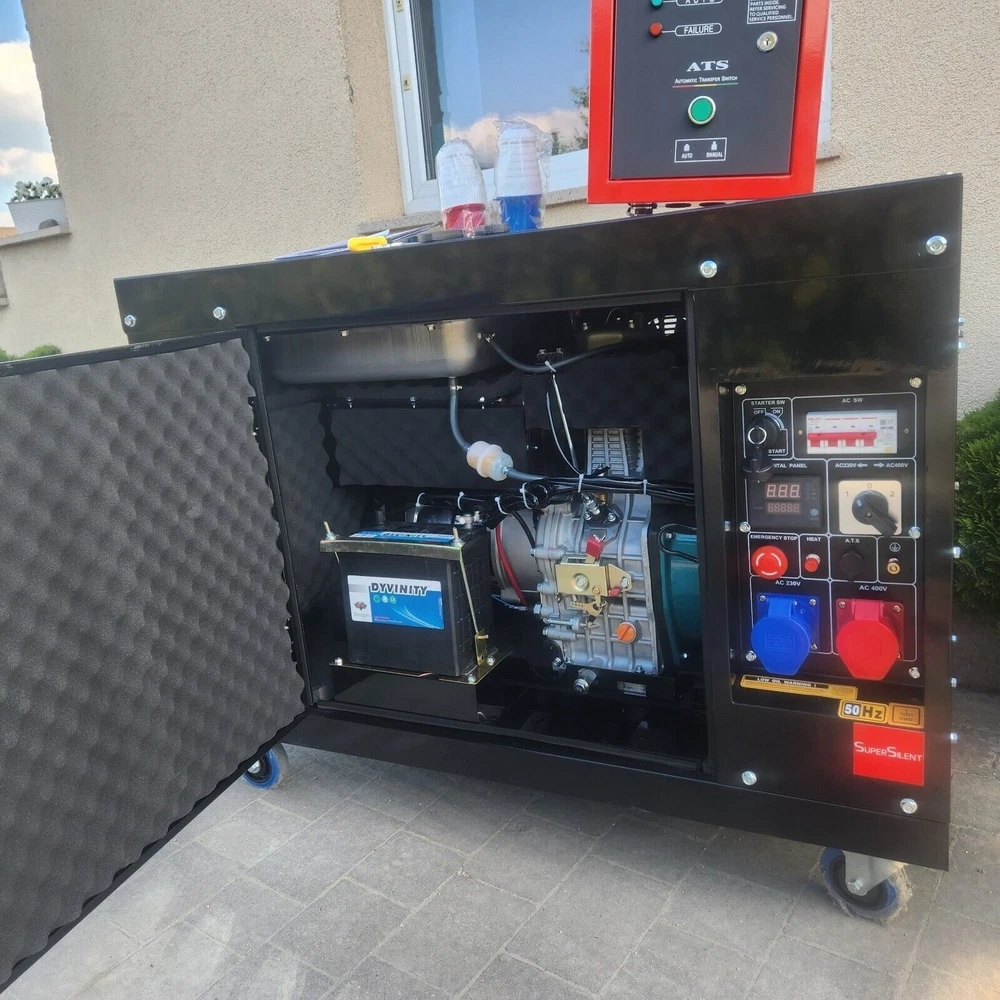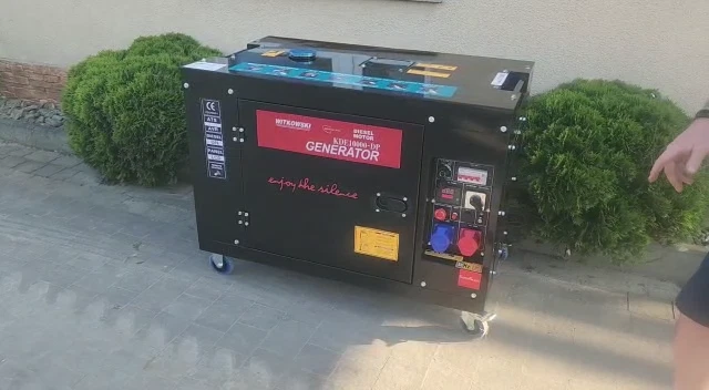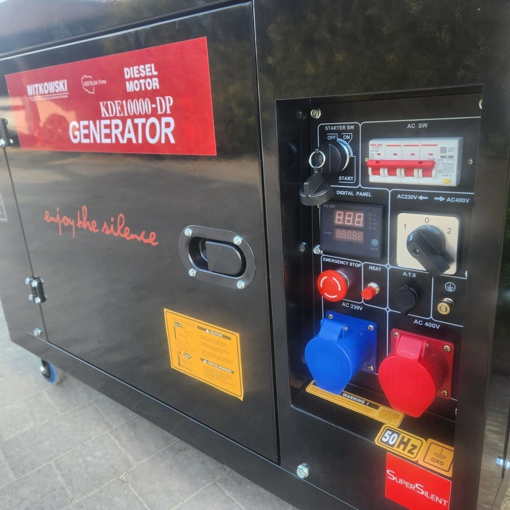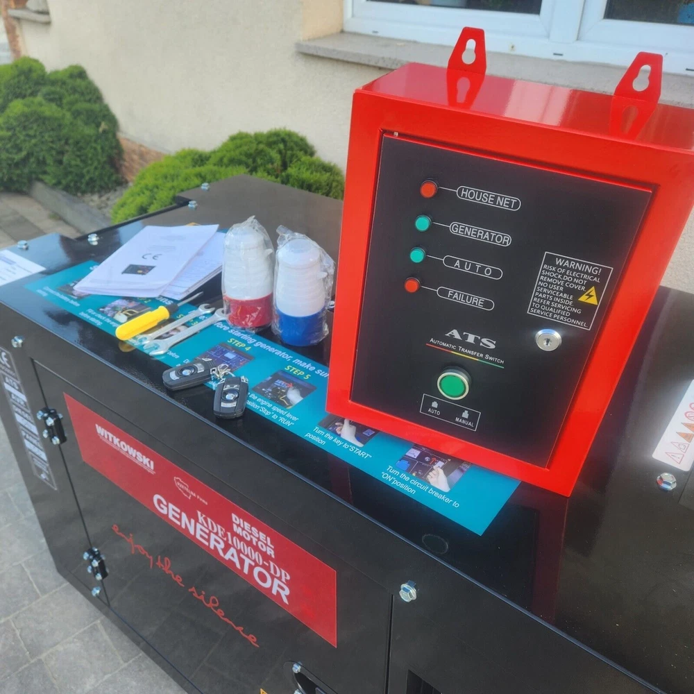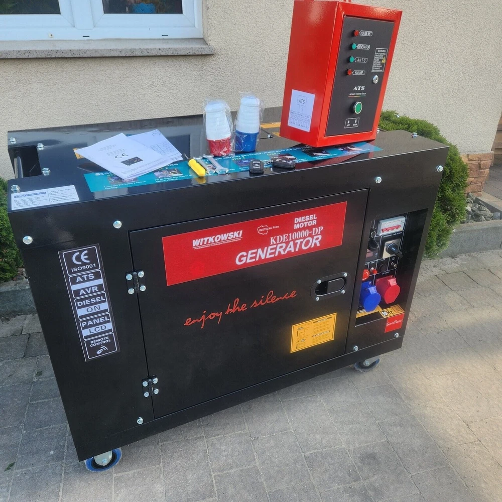 KDE10000DP WITKOWSKI (including ATS BOX) Innovative DUAL POWER technology. With a normal power generator, only 1/3 of the power of the storm generator is available per 230V socket. With this technology, the full power of the storm generator can be used at both 400 V and 230 V. It allows the connection of high power and single-phase devices. The storm aggregate becomes a versatile device with full performance. ADDITIONAL INFORMATION ONLY HERE! The KDE10000DP model is equipped with glow plugs, which make igniting the storm generator just as easy in frost as in plus temperatures. The high output power of the storm generator offers more freedom when connecting single-phase devices and enables the connection of large power devices (three-phase). Low fuel consumption: a maximum of 1.3 liters of oil per hour at maximum load. Easy starting even at minus 20 degrees thanks to the spacious 36Ah battery. 100% copper generator. Remote control with a range of up to 80 m. In addition to an automatic decompressor, the storm unit also has a manual decompressor, which makes starting up even easier. Our generator set has a detailed fuel filter (like in a car), eliminating the need for two filters, reducing operating costs. You also protect the engine from damage because the two-filter system does not have to be constantly ventilated. Adaptation to ATS (automation that allows self-ignition in the event of a power failure and automatic shutdown of the generator when the genset returns from the power plant) via a microprocessor in the electrical panel, solenoid valve and connection socket. If necessary, it is sufficient to purchase an ATS device that allows the storm generator to operate automatically. The storm unit is equipped with an AVR voltage stabilizer. Exhaust gas routing is possible with the hose available in our range. WARRANTY 24 months. Readily available spare parts. Operating instructions in German with EC declaration of conformity. Before delivery, we carry out the initial commissioning. We deliver the storm unit tested and ready for operation - flooded with engine oil and fuel. Technical data The single-cylinder 4-stroke diesel engine KM1100FA with a high power of 11 kW/3000 rpm is a guarantee for the life of the entire power generation unit Self-ignition maximum engine power 15 HP Displacement 670 cc Measuring time on sprockets Fuel: diesel Fuel fed overflow with forced return direct injection; Injection pump Combustion 1.1 l/h ON at 5.5kW, 0.9 l/h at 3.5kW Paper fuel filter forced lubrication; Oil pump Oil level and pressure sensor built-in reusable oil filter (metal) Oil pan capacity 1.65 l 1.2kW electric starter equipped with an electric valve that allows commissioning without a decompression lever replaceable paper air filter Volume 65 ~ 74 dB - distance 7 m Weight of the generators alone 50 kg - generators completely wrapped in copper, stator length 15 cm. Rated power at 230V 8.0 kW (10kVA) Rated power at 400V 8.0 kW (10kVA) maximum power at 230V 8.8kW (11kVA) maximum power at 400V 8.8kW (11kVA) Output voltage 400V/230V/12V C16 protection at 400V, C32 protection at 230V (very important: indicates the power of the generator) Frequency 50Hz AVR (Variable Voltage Stabilization) brushless self-starting generator - very durable Length of the device 1050 mm Width 620mm Height 730mm Weight of 200kg 25 liter tank Furnishing Electric start with the key (starter). Large 36Ah battery Electronic display showing operating hours, voltage and frequency. Additional manual decompressor Rectifier for charging other external batteries. Adapted for ATS (components: microprocessor in the electrical panel, electric valve and junction box 230V 32A in the electrical panel). After purchasing the ATS device, the storm unit can work in automatic mode. Socket 400V 16A Socket 230V 32A Fuel tank 25 l Full-fledged transport wheels for easy transport A 39mm diameter exhaust that allows the exhaust to be extended and the exhaust to be routed outside the room (hoses on offer) Remote controls that work at a distance of 60-80 m depending on the location of the unit (open space, walls, ceilings). Accessories for daily operations 230V (output) x 1 x 230V (standard) Schuko plug Plug 16A 400V Key set (8/10/12/14) screwdriver 2 remote controls Operating instructions in German DELIVERY 3-5 DAYS At the customer's request, the device may not be fired.