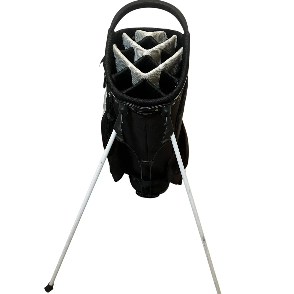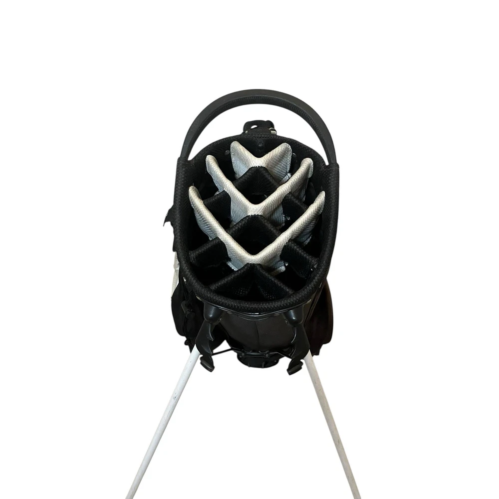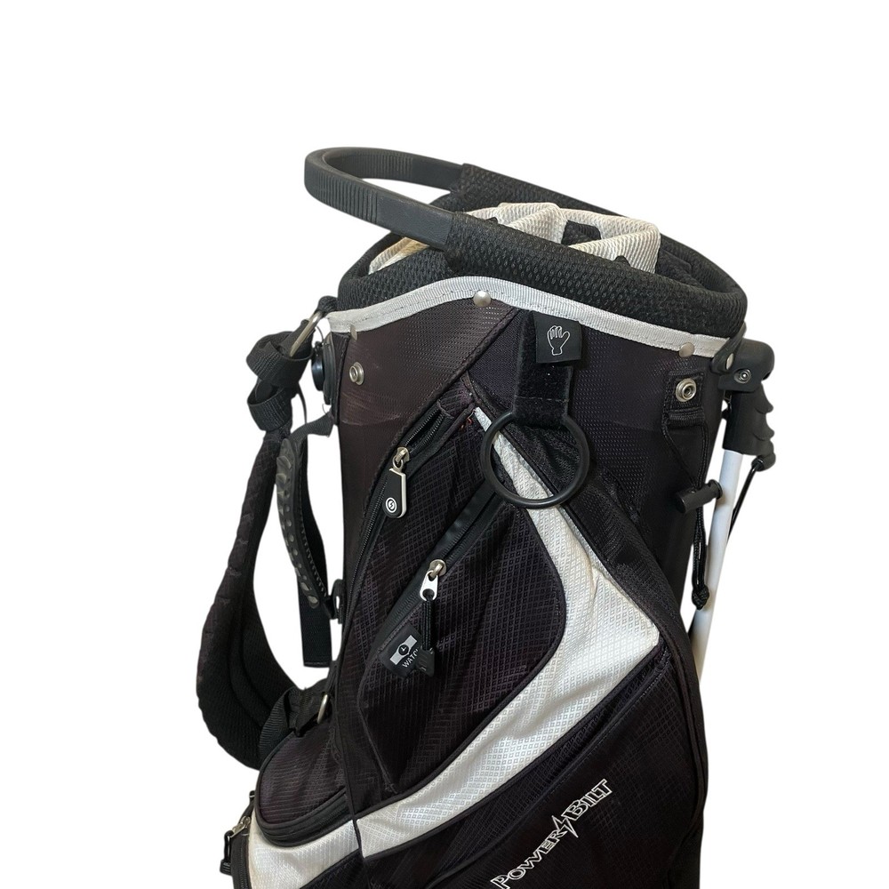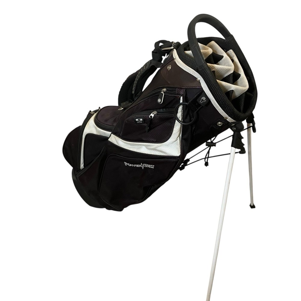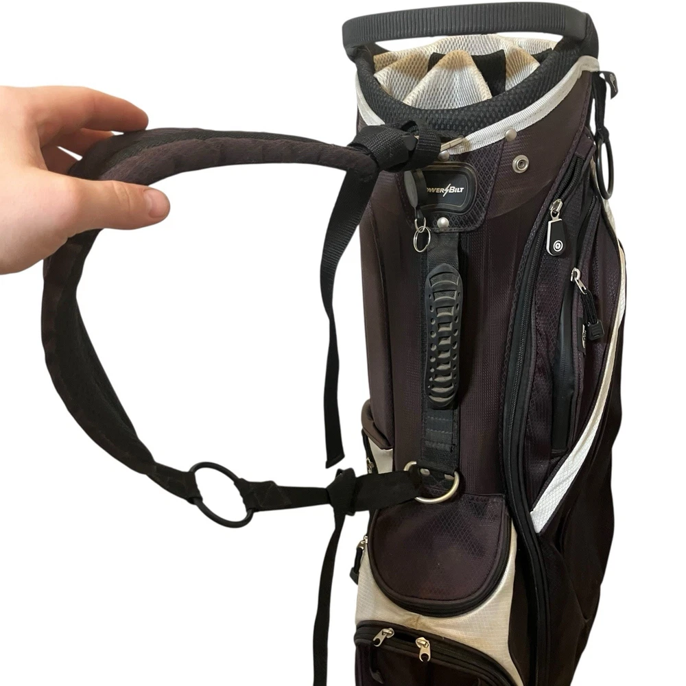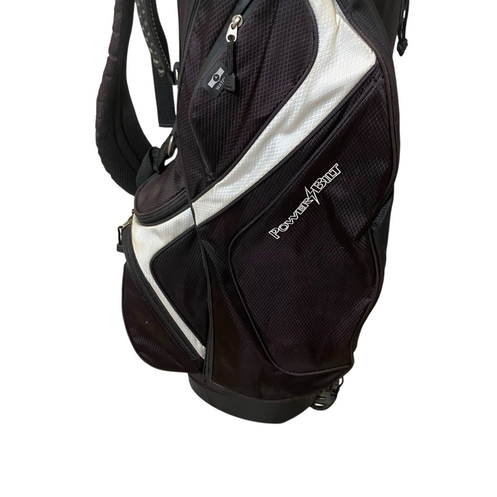 Preowned Powerbilt TPS Dunes 14-Way stand golf bag in all-black. Features a 14-way top for perfect club organization, including individual full-length dividers to protect shafts. Lightweight and designed for comfortable walking or cart use. Includes multiple pockets for apparel, accessories, and valuables. Stand legs function smoothly, straps are in good condition, and bag shows normal minor wear. Ready to hit the course!