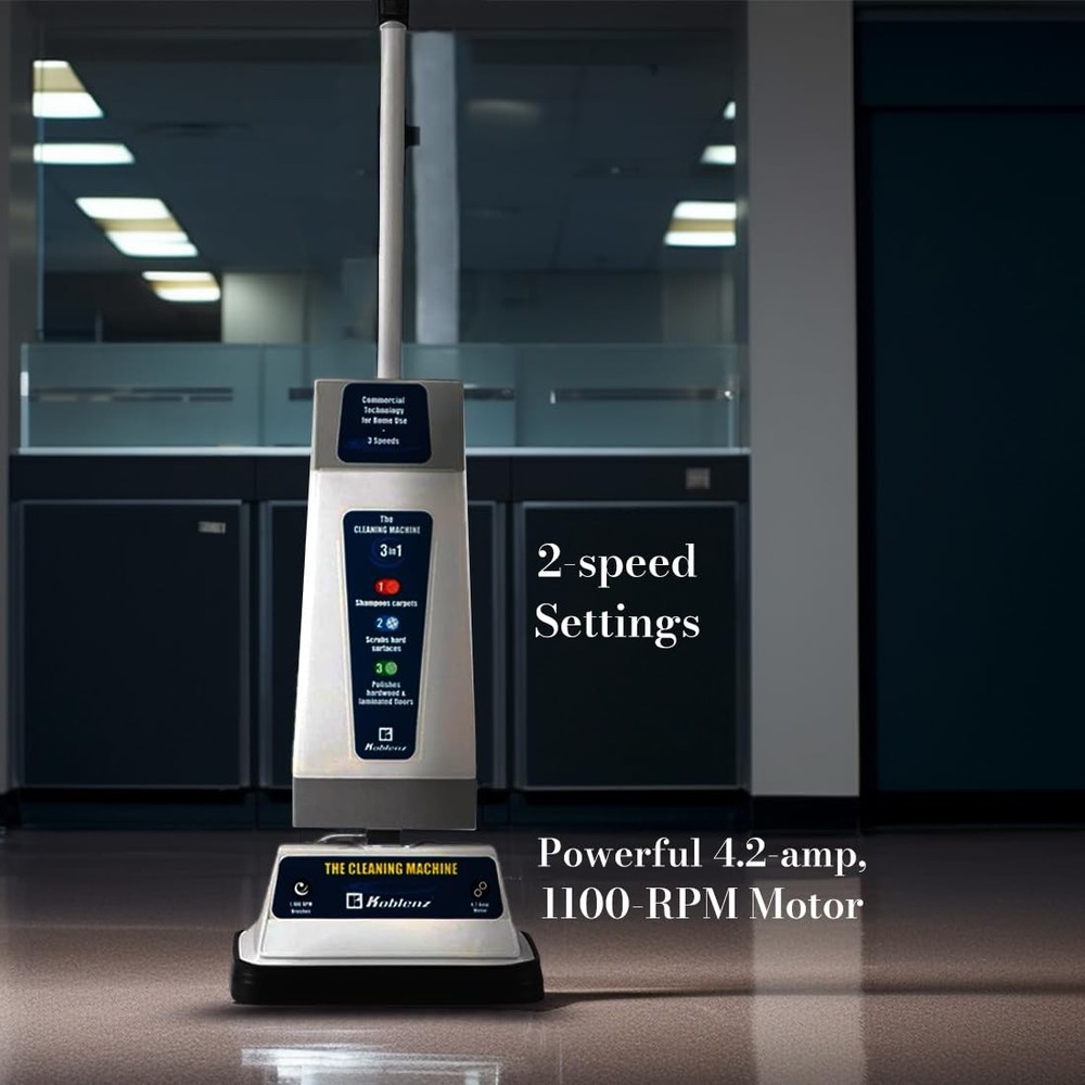 Versatile Floor Cleaner: The Carpet and Hardwood Floor Cleaner is a multi-functional powerhouse that not only polishes but also effectively shampoos, scrubs, waxes, and buffs various hard floors and carpets with its 2-speed settings. Powerful Motor: Equipped with a heavy-duty 4.2-amp, all-metal motor running at 1100 RPM and full-width bronze gears, our durable carpet shampooer delivers strong, consistent performance, ensuring thorough cleaning and polishing with ease. Spacious Tank Capacity: The rug cleaner boasts a 120-oz. tank, allowing for extended cleaning sessions without frequent refills. Its 12" cleaning path enables effortless cleaning of large floor areas in less time. Twin Brush System: The floor scrubber's twin brushes rotate in opposite directions, offering exceptional stability and ease of handling during operation. Our carpet cleaner comes with a 5' power cord for enhanced mobility. Comprehensive Accessory Set: Our rug shampooer includes a variety of accessories, such as one pair each of scrubbing brushes, tan polishing pads, and lambswool buffing pads, ensuring versatile cleaning options.