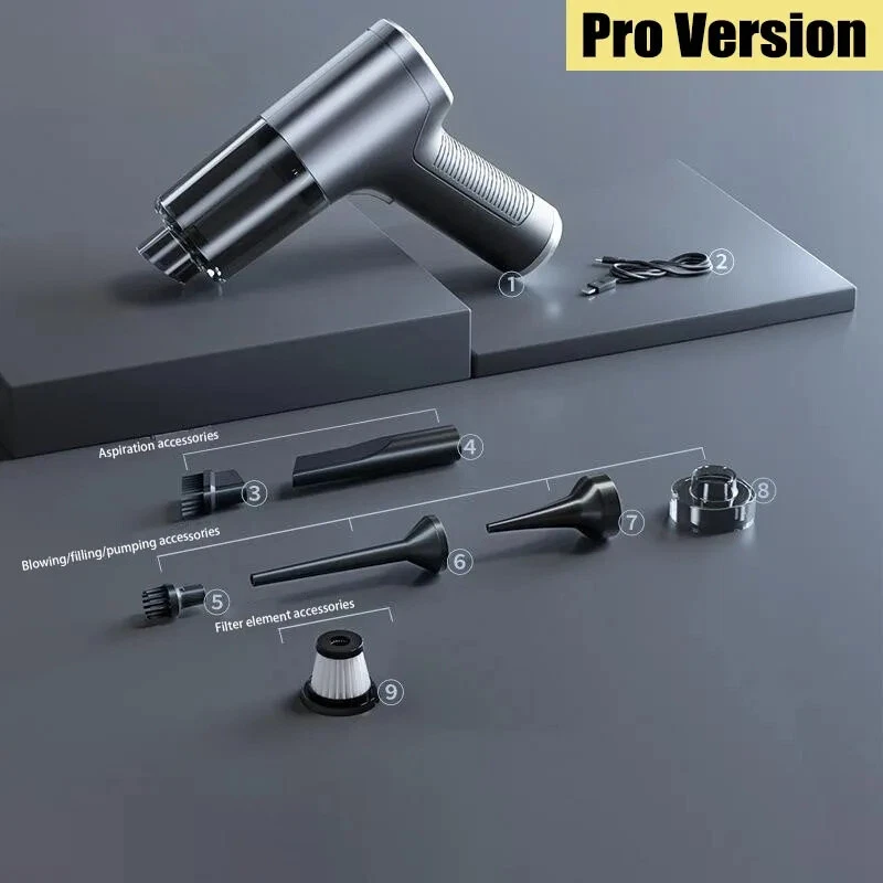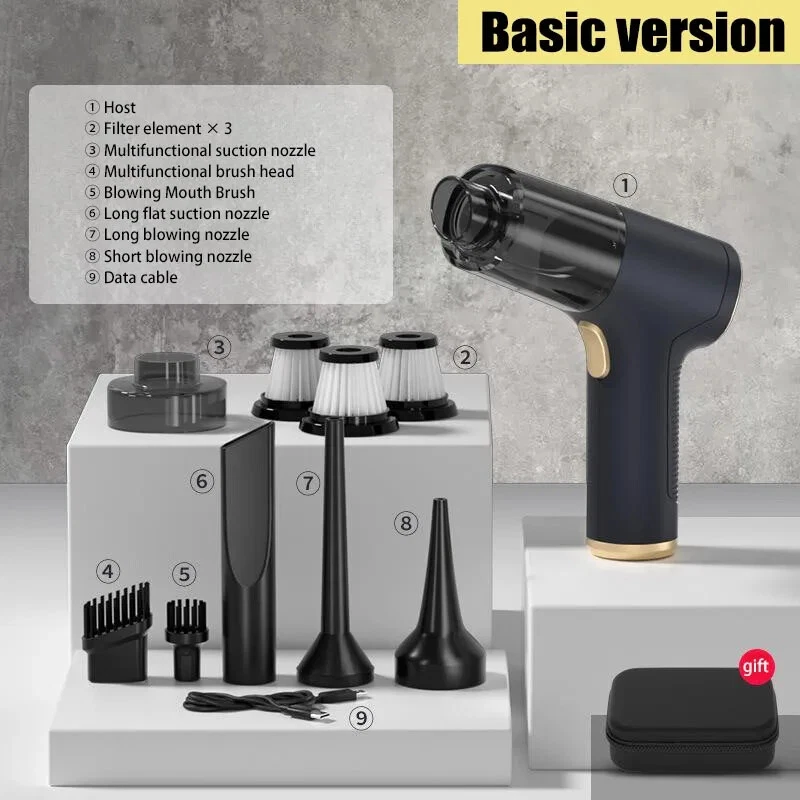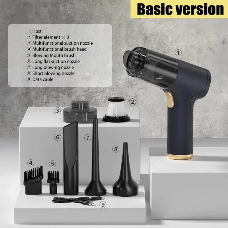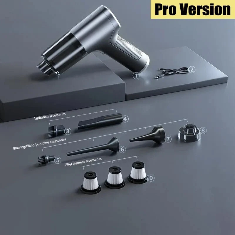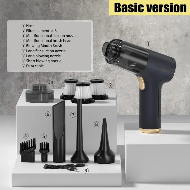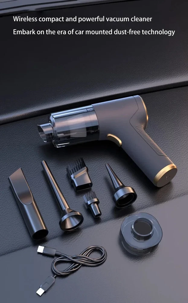 �� Rechargeable Battery :No need to constantly replace batteries. Simply recharge the vacuum cleaner and use it again and again. �� Wireless Convenience :No more tangled cords or limited mobility. The wireless feature allows for easy and convenient use in any room. ��Powerful Suction :The 120w power and strong suction ensure that even the toughest stains are removed with ease. �� Dry and Wet Use :This vacuum cleaner is suitable for both dry and wet use, making it versatile and perfect for any cleaning task. [Product Name]: Handheld Vehicle Vacuum Cleaner [Product functions]:mainly cleaning cars, vacuuming, blowing dust, blowing balloons and so on Version introduction: CA0002-1: Single filter screen Without vacuum cleanerOnly suitable for this vacuum [Pro Version]:AU00020 [Product material]: ABS [Motor]: New upgrated Brushless motor [Vacuum degree]: 1290000PA [Rated speed]: 35500rpm [Capacity of lithium battery]: 2 * 2000mAh [Charging mode]: Type-C charging line [Noise]: ≤ 52dB [Operating temperature]: - 20 ℃~+50 ℃ [weight]:550g [ackage list]: vacuum cleaner X1 Accessories X 6 Charging line X1 User manualX1 [Basic version]:AU00021 [Product material]: ABS [Motor]: Ordinary motor [Vacuum degree]: 1290000PA [Rated speed]: 15500rpm [Capacity of lithium battery]: 2 * 2000mAh [Charging mode]: Type-C charging line [Noise]: ≤ 52dB [Operating temperature]: - 20 ℃~+50 ℃ [weight]:550g [Package list]: vacuum cleaner X1 Accessories X 6 Charging line X1 User manualX1 Notice: 1.The recommended charging time in winter is 8 hours,Charging time in summer is 4 hours 2.During the charging process, the vacuum cleaner cannot be started. You need to unplug the power and start it again. 3..Press and hold for 10 seconds to enter the first gear of the vacuum cleaner 4.Press and hold for two seconds to change the suction power of the vacuum cleaner