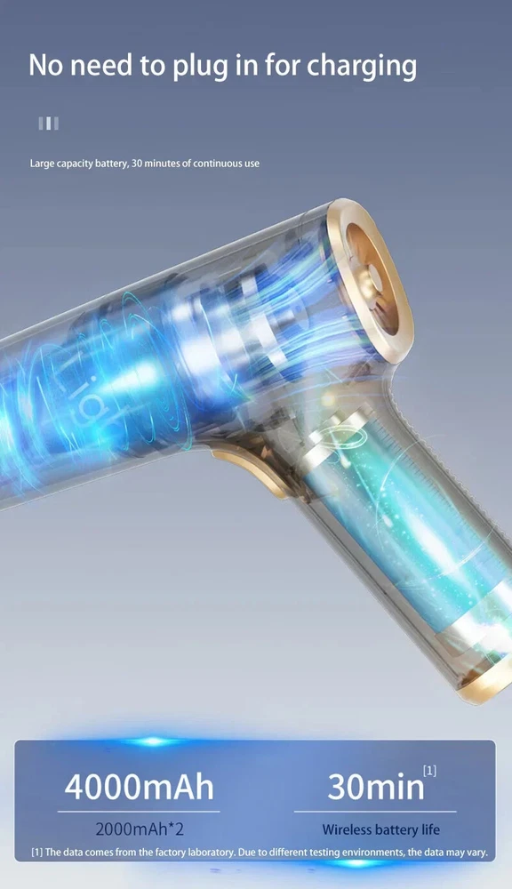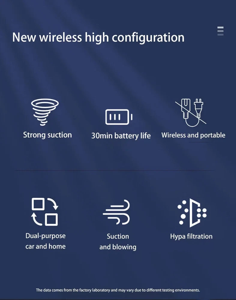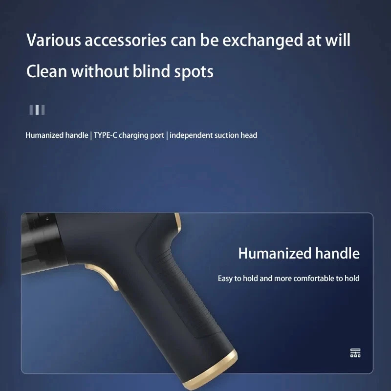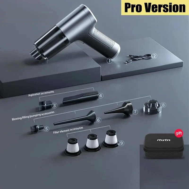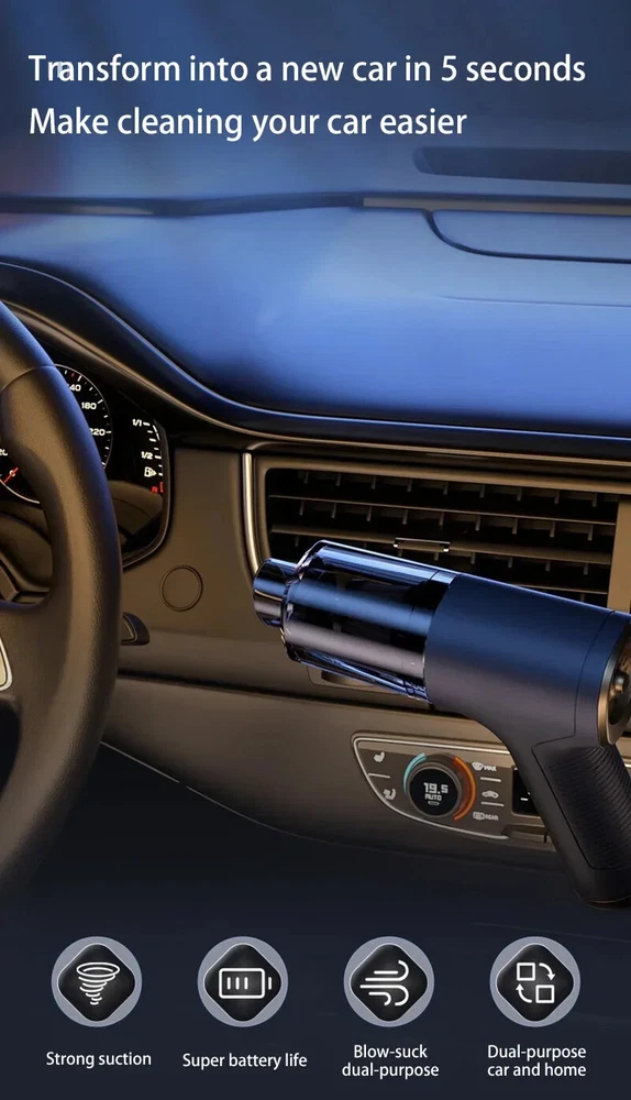 �� Rechargeable Battery :No need to constantly replace batteries. Simply recharge the vacuum cleaner and use it again and again. �� Wireless Convenience :No more tangled cords or limited mobility. The wireless feature allows for easy and convenient use in any room. ��Powerful Suction :The 120w power and strong suction ensure that even the toughest stains are removed with ease. �� Dry and Wet Use :This vacuum cleaner is suitable for both dry and wet use, making it versatile and perfect for any cleaning task. [Product Name]: Handheld Vehicle Vacuum Cleaner [Product functions]:mainly cleaning cars, vacuuming, blowing dust, blowing balloons and so on Version introduction: CA0002-1: Single filter screen Without vacuum cleanerOnly suitable for this vacuum [Pro Version]:AU00020 [Product material]: ABS [Motor]: New upgrated Brushless motor [Vacuum degree]: 1290000PA [Rated speed]: 35500rpm [Capacity of lithium battery]: 2 * 2000mAh [Charging mode]: Type-C charging line [Noise]: ≤ 52dB [Operating temperature]: - 20 ℃~+50 ℃ [weight]:550g [ackage list]: vacuum cleaner X1 Accessories X 6 Charging line X1 User manualX1 [Basic version]:AU00021 [Product material]: ABS [Motor]: Ordinary motor [Vacuum degree]: 1290000PA [Rated speed]: 15500rpm [Capacity of lithium battery]: 2 * 2000mAh [Charging mode]: Type-C charging line [Noise]: ≤ 52dB [Operating temperature]: - 20 ℃~+50 ℃ [weight]:550g [Package list]: vacuum cleaner X1 Accessories X 6 Charging line X1 User manualX1 Notice: 1.The recommended charging time in winter is 8 hours,Charging time in summer is 4 hours 2.During the charging process, the vacuum cleaner cannot be started. You need to unplug the power and start it again. 3..Press and hold for 10 seconds to enter the first gear of the vacuum cleaner 4.Press and hold for two seconds to change the suction power of the vacuum cleaner