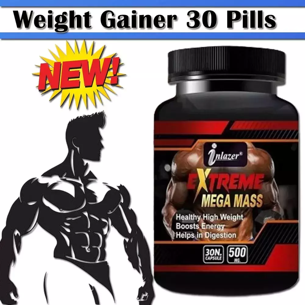 NEW BODY GROW Fast Weight Gain Pills Muscle Gainer WEGHT GAIN 30 CAPSULES (PACK OF 1) Note: This Product is designed to deliver optimal results, offering high-quality performance and satisfaction. Please note that individual experiences and outcomes may vary based on personal use, preferences, and unique circumstances. For best results, we recommend following the provided guidelines and ensuring the product is used as intended. Product result may vary for every individual. Inlazer Extreme Mass Builder Daily Muscle Builder & Performance Enhancer - Muscle Building Supplement for Muscular Strength & Growth - 30 Veggie Pills About This Product Amplifies Gym Efforts: Inlazer Extreme Mass Pills enhances your training, helping maximize muscular gains when combined with effective workouts and nutrition. Fuel Your Cells: Inlazer stimulates ATP production, improving athletic performance, strength, and lean muscle gains. Achieve Fitness Goals: Support muscle-building and absorption support, aiding in a stronger, leaner physique. Premium Weight Gainer: Specially formulated for athletes to boost protein, carbohydrate, and calorie intake for increased size and strength. Superior Formula: Inlazer 100% Mass Gainer contains high-quality protein, mass-producing calories, and creatine monohydrate for faster muscle and strength gains. High-Quality Manufacturing: Produced in a cGMP-certified facility with no harsh chemicals, fillers, or artificial dyes