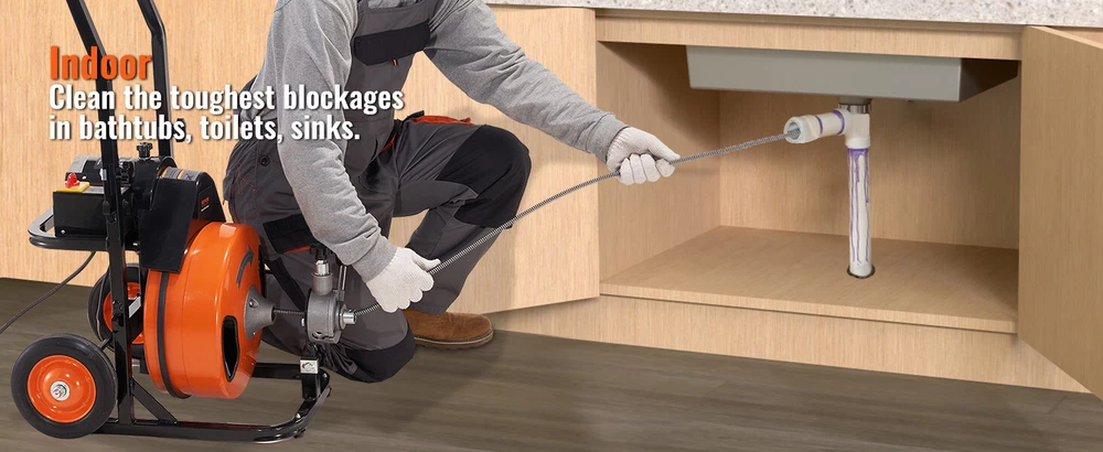 A re you tired of clogged drainage pipes, expensive plumbing services, and incomplete unclogging? Say bye to unpleasant smells and trouble maintenance! Let the electric drain cleaning machine with 50 FT x 1/2 In solid core cable solve all your blockage problems in one go without any worries! Features & Details Apply Anywhere: Versatile drain cleaner machine comes with 4 interchangeable cutters: arrow cutter, spade cutter, c-cutter, and boring bulb cutter. It can effectively tackle clogs in pipes, floor drains, sinks, toilets, and more. This sewer machine eliminates unpleasant odors, making it perfect for use in homes, properties, restaurants, factories, and schools. Attack Stubborn Clogs: Our 50FT x 1/2" sewer snake machine steel core cable is resistant to breakage, twisting, and corrosion, making it easy to navigate through complex curved pipes, leaving them free of blockages. This cable is perfectly suited for 1 inch to 4 inch pipes and prevents any frustrating entanglements or knotting during use, ensuring a smooth and efficient cleaning process. Effortless to Use: Features an automatic feed control system to power the cable in and out of drainage pipes. The CW/OFF/CCW knob and air-activated foot switch make it easy to control the cable. With this system, even one person can efficiently clear blockages with less effort. Compact & Portable: The electric drain auger is small in size and lightweight, making it easy to move around. Its 8-inch shock-absorbing wheels enable effortless use on stairs and other uneven surfaces. Additionally, the retractable handle reduces fatigue and provides a comfortable grip, while making it convenient to store when not in use. Boast Durability and Security: Our powerful drain auger cleaner, which boasts a high-quality motor with a speed of 1800RPM, is ready for anything. It features a semi-enclosed drum that allows for easy observation of the remaining cable length, as well as an upgraded steel frame with a special coating that prevents rust and extends its lifespan. Additionally, it comes with an integrated GFCI to protect operators from electric shock.