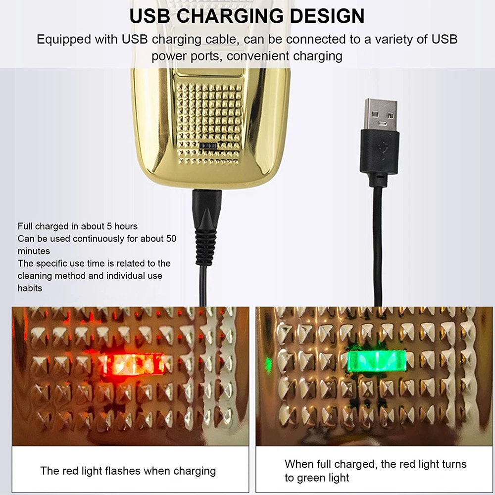 Motor Type: Rotary Number of Heads: 1 Color: Gold Item Length: 2 in Power Source: USB Charging Body Area: Back, Body, Chest, Ear, Face, Neck, Nose, Pubic Features: Adjustable Speed, Built-In Moisturizing System, Cleaning Indicator, Cleaning System, Cordless, Dual Voltage, Folding Blade, Hair Trimmer Option, LED Display, Low Battery Indicator, Pivoting Head, Quick Charging Time, Rechargeable, Replacement Blades, Smartlight, Swivel Cord, Travel Case, Travel Size, Washable, Waterproof, Wet/Dry Item Weight: 2 lb Department: Men Type: Facial Shaver Country/Region of Manufacture: China Head Type: Beard Trimmer Brand: Unbranded