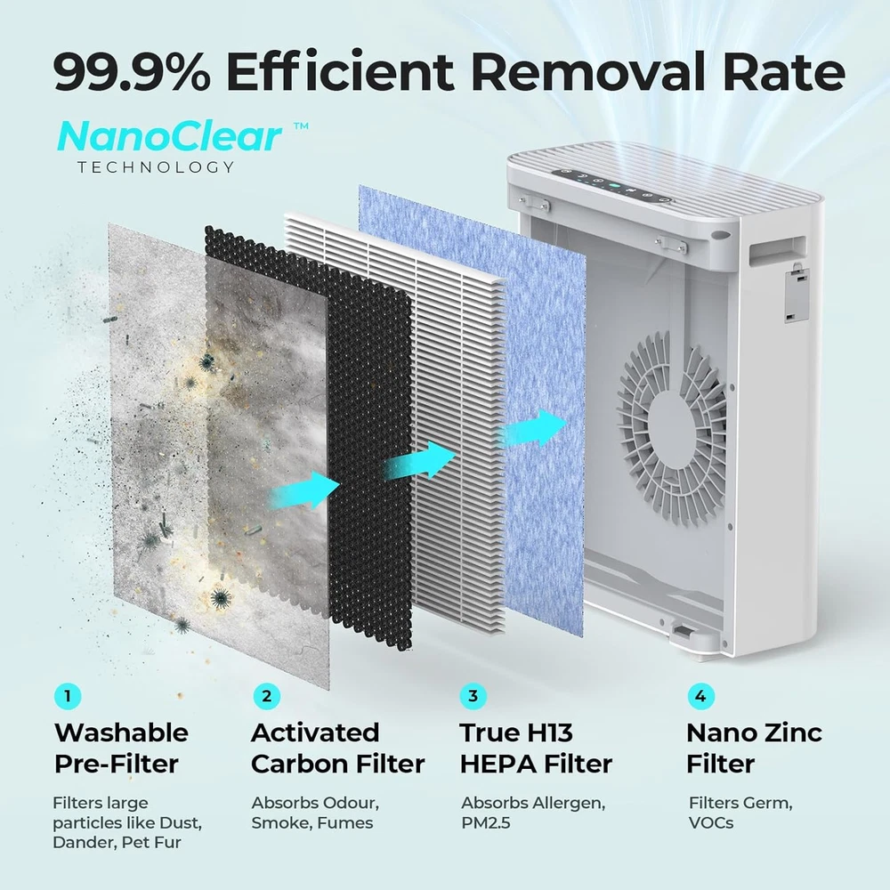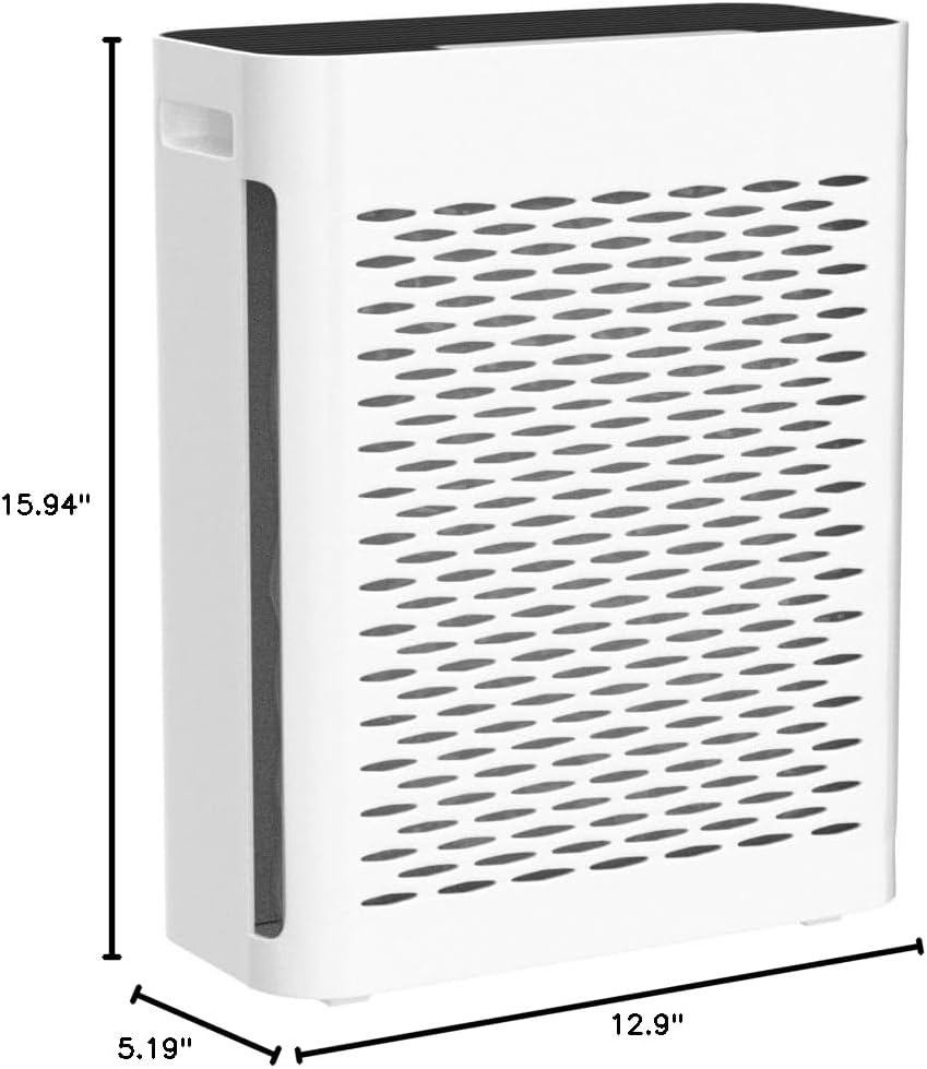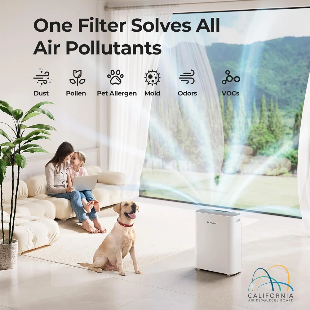 【Powerful for Rooms up to 1250ft²】With a peak-performing CADR of 142 CFM / 240 m³/h, Homvana Smart Air Purifier H211 clears air in 270 ft² in 12mins, 645ft² in 30mins, and 1250ft² in 60mins. For your larger room such as a living room, open kitchen, loft apartment or basement, one choice to solve them all! 【4-Stage Defense with H13 True HEPA Filter】 High-efficiency 4-stage filtration helps people with asthma and allergies. It includes the H13 True HEPA Filter, which captures 99.97% of airborne contaminants of 0.1 microns, like dust, pollen, smoke, pet dander, etc. Search for "B09R1GHVKF" on Amazon to purchase official filters. 【Real-time Air Quality Indicator】Know the real-time air quality and see the changes in air quality at a glance of the distinct indicators like Green(Very Good), Blue(Good), Orange(Moderate), Red(Bad), with the help of the advanced infrared sensor. 【Smart Auto Mode】Tap the Auto Mode, and the purifier will auto-optimize the fan speed based on the surrounding air quality, providing clean, fresh air to your home without any worries about manually adjusting, especially when with a baby or hands full of stuff. 【22dB SilentAir, Undisturbed Sleep】Thanks to the exclusive SilentAir tech, you can enjoy undisturbed sleep with Homvana's sleep mode on both the device panel and the Homvana App, which operates at a level as low as 22dB, even quieter than a whisper. Also, you can turn off all lights with the Display Off button. You deserve this pure and silent air and sweet night. Product Description 2/4/8H Timer Set a timer for 2, 4 or 8 hours to perfectly fit for your schedule. Maintain powerful purification when necessary, and save energy when sleeping or going out. Filter Change Reminder The Display/Filter button, with its red button light, reminds you the time to change filter after 3-5 months of use, depending on your usage. Search for "B09R1GHVKF". 3 Fan Speeds Comes with 3 adjustable fan speed settings from Low, Medium to High, to find your optimal fan speed to tackle different purification needs.