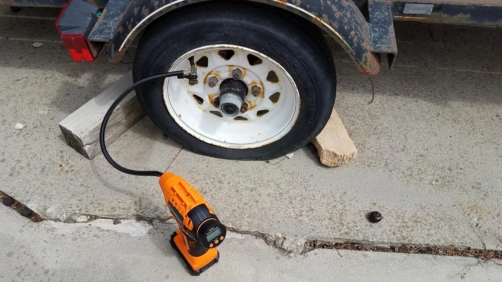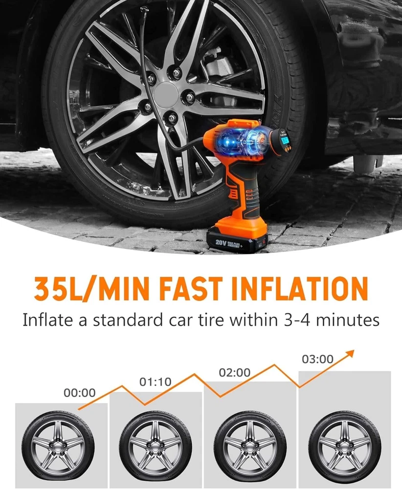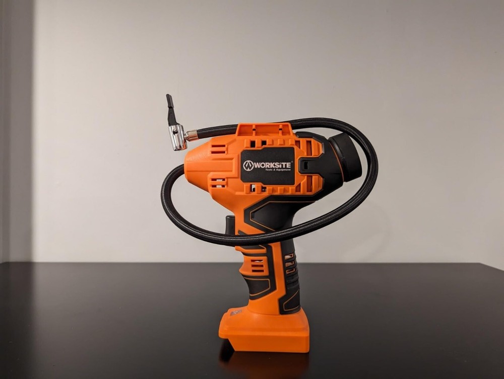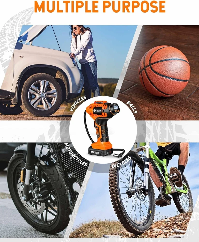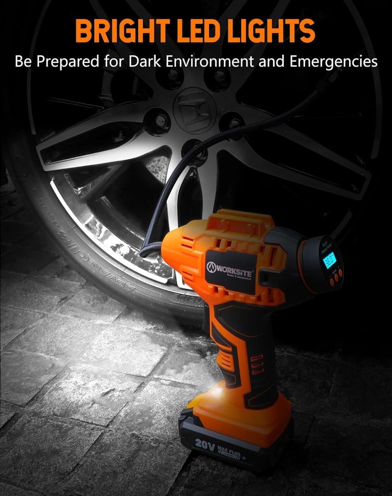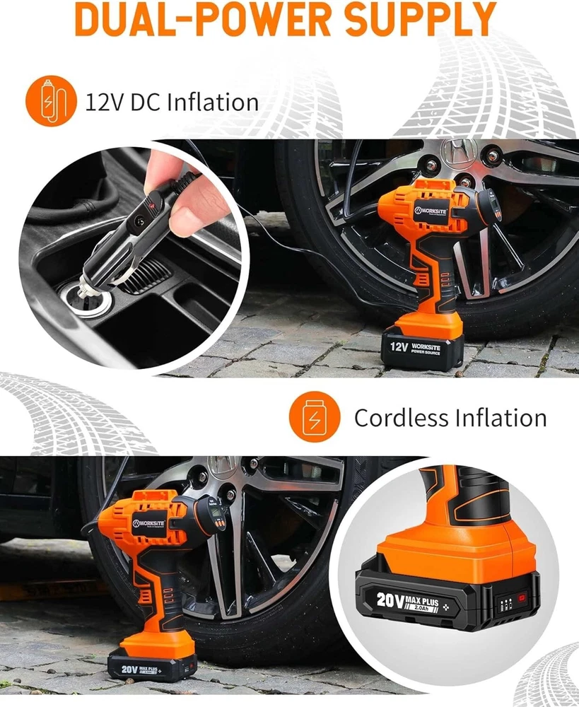 WORKSITE Cordless Tire Inflator Air Compressor, Battery Powered Car Pump, Orange About this item DUAL POWER SUPPLY: 12V DC and 20V rechargeable battery power supply provide much convenience during trip. No worry about running out when travelling or on the road Auto Shut Off: The tire pressure monitoring system will make sure the pump automatically stops inflating when it reaches your specified air pressure ensures you won't over-inflate your tires. The unit of air pressure can be switched among bar, kPa and PSI Fast Inflation & Ergonomics: Equipped with metal cylinder and metal motor, this tire compressor can inflate a 195/60 R14 no gas tire within 3 mins and a 215/60 R16 no gas tire within 5 mins Multiple Use with 3 Nozzle Adaptors: This tire air compressor is suitable for inflating tires on cars, bicycles, motorcycles, midsize Sedan and SUVs, sport balls, pool toys, etc What You Would Get: A cordless tire inflator, 20V battery pack, 12V car power adapter, battery charger, 3 nozzles, user manual and a tool bag What's in the box Tire Inflator Charger Battery 12V car power adapter 3 nozzles