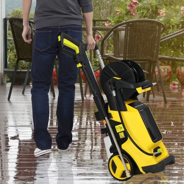 Features: Powerful Motor Powerful 1800-watt motor generates up to 3800 PSI + 2.6 GPM for max cleaning power. Adjustable Pressure Upgrade pressure control features an adjustable pressure function, including 3 cleaning modes, soft, medium, and strong. And press the +/-buttons to adjust the water pressure. Safety Lock & TSS Safety Lock - Locks the water gun trigger to prevent misuse by children. Total Stop System - Automatically shuts off the pump when the trigger is not engaged to save energy and prolong pump life. Easy to Store Portable High-pressure washers complete with accessories stowed on the corresponding hook of the unit after use. Easy to Move The unique three-section retractable pull rod is made of aluminum alloy with strong load-bearing material, giving you a smoother pulling experience. Also, the wheel makes the pressure washers easy to move with. 4 Nozzles and Soap Bottle Power washer comes with 4 interchangeable nozzles (0°, 15°, 25°, 40°and soap). 0º - areas that are high and hard to reach; clean crevices in sidewalks or driveways; 15º- use on concrete, brick, and other hard surfaces with stubborn stains; 25º- use on painted surfaces, wood siding, fences, and lawn mowers;40º- use on windows and screens; soap- use to spray soaps and detergents. Freely select the high-pressure nozzle best suited to your task. Specifications: 1. Material: Plastic and Metal 2. Dimensions: (10.24 x 11.42 x 38.19)inch / (26 x 29 x 97)cm (L x W x H) 3. Wheel Diameter: 15CM/ 5.9 inch 4. Power Cord Length: 16ft / 5m 5. High-Pressure Hose Length: 19.7ft / 6m 6. Wattage: 1800W 7. Max Pressure: 3800PSI 8. Flow Rate: 2.6GPM 9. Water Temperature: 0-35℃ 10. Features: Total Stop System 11. Applications: For Homes, Cars, Boats, RVs, Driveways, Decks, Patios, Gardens, Fences, Sidewalks, Walls, Yards 12. Weight: 17.2 lbs./7.8KG Package Includes: 4 x Nozzles 1 x Soap bottle 1 x high pressure cleaner 1 x Instruction Manual