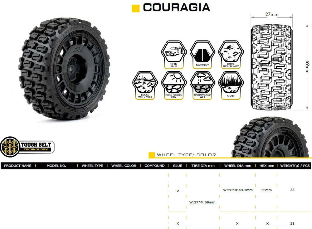 Powerhobby 1/10 Rally Car Couragia Mounted Tires Claw Wheels (4) Tamiya