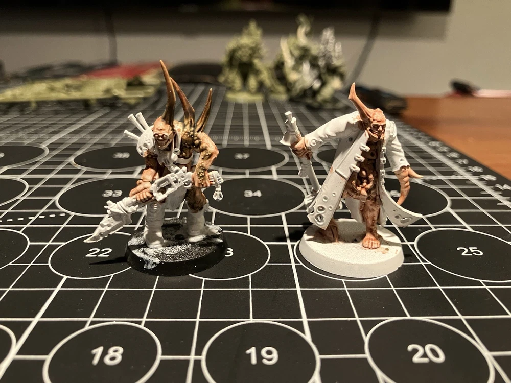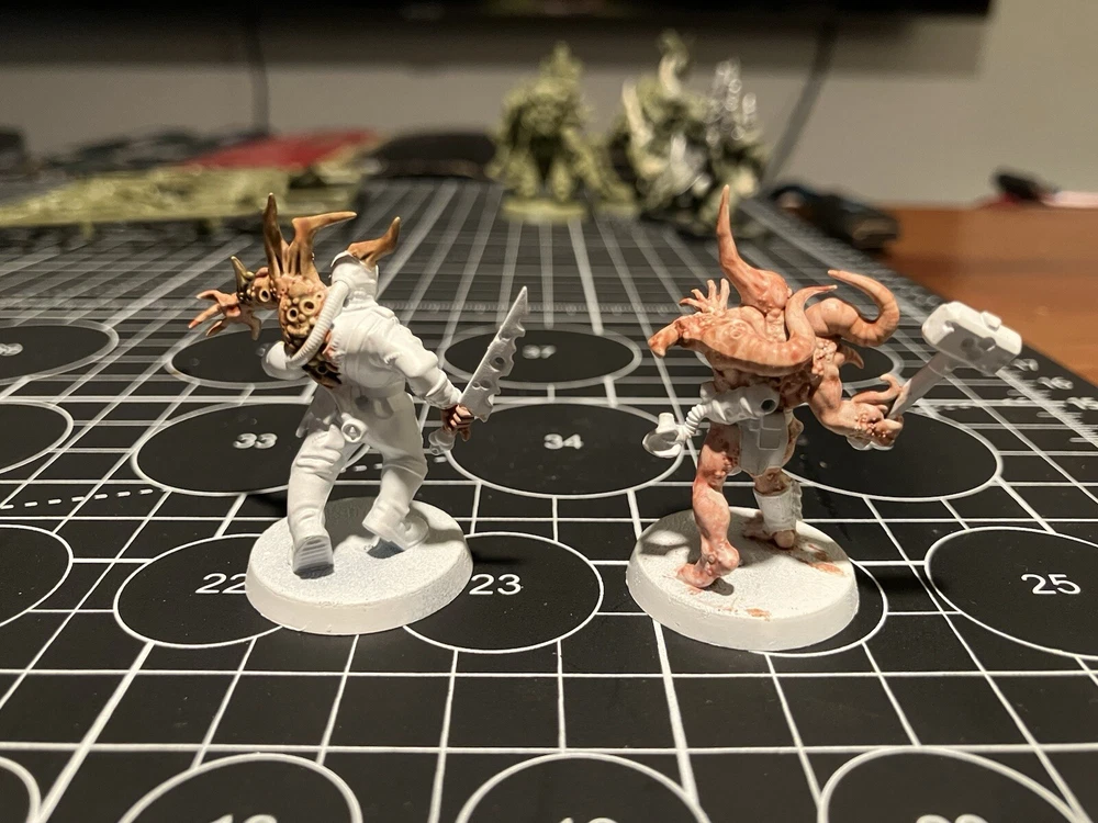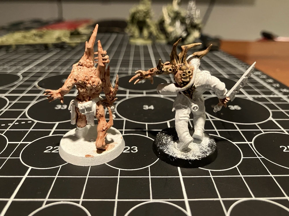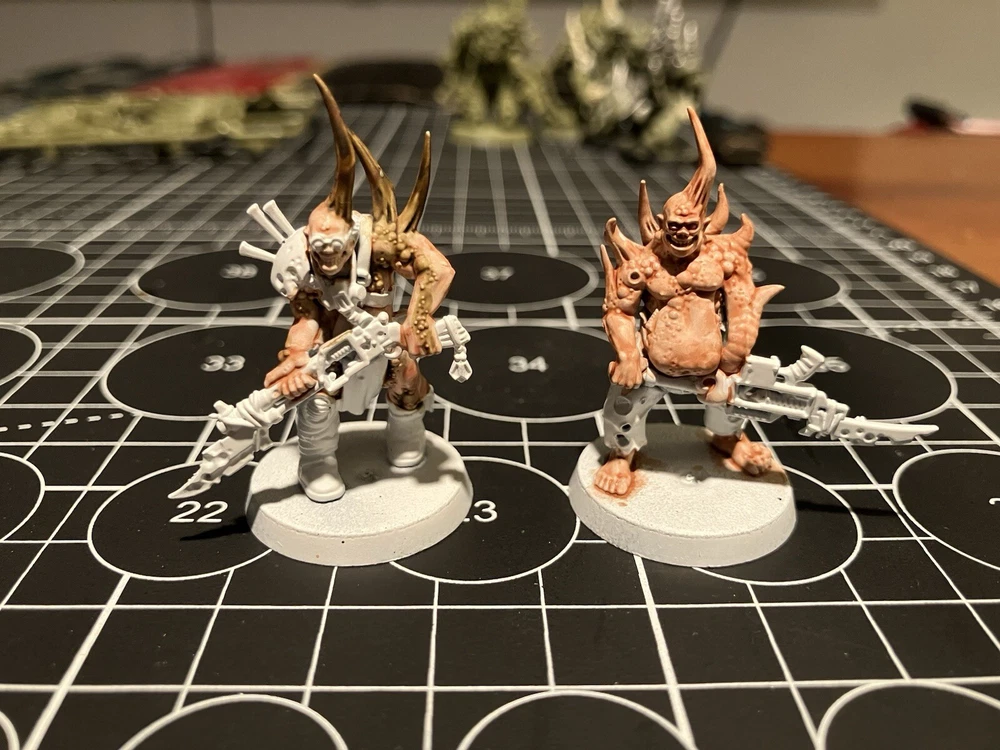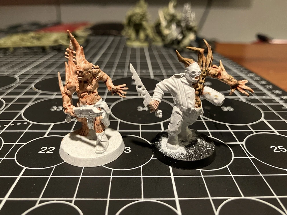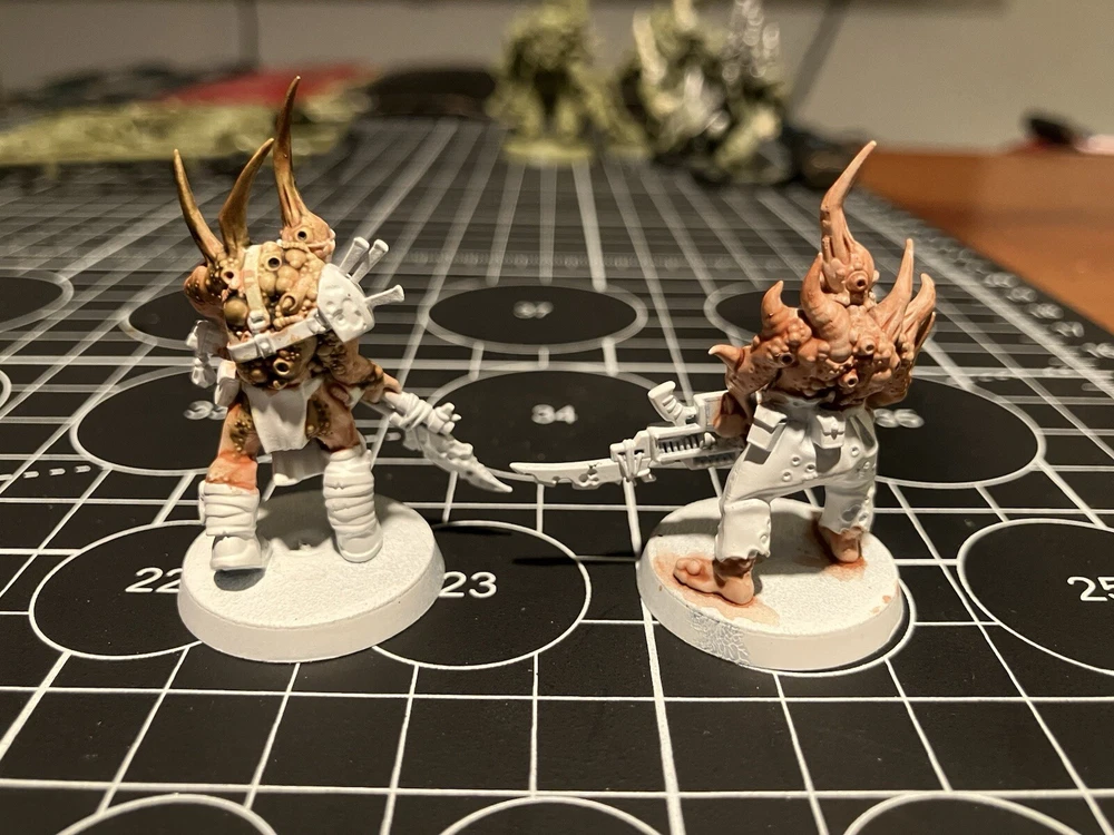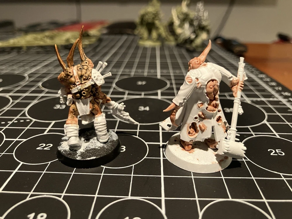 Poxwalkers 10 poxwalkers from an old box set 9 primed and part painted with citadel washes Was missing one so added one on sprue to the squad so you get a full squad. Army painter rattle can white primer was used Painted 10 of these partially started guys for my own army, they paint easy and don’t take long to finish up decently. Father Nurgle sends his blessings.