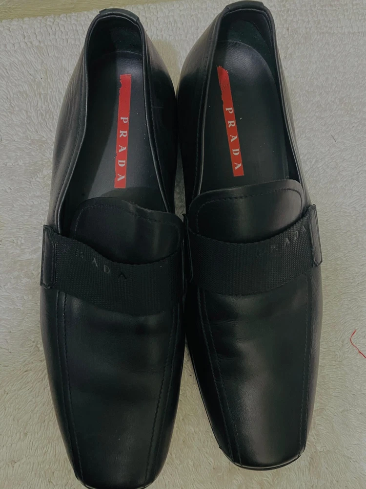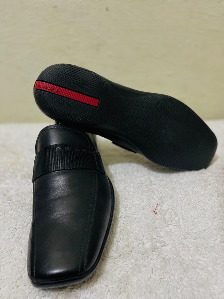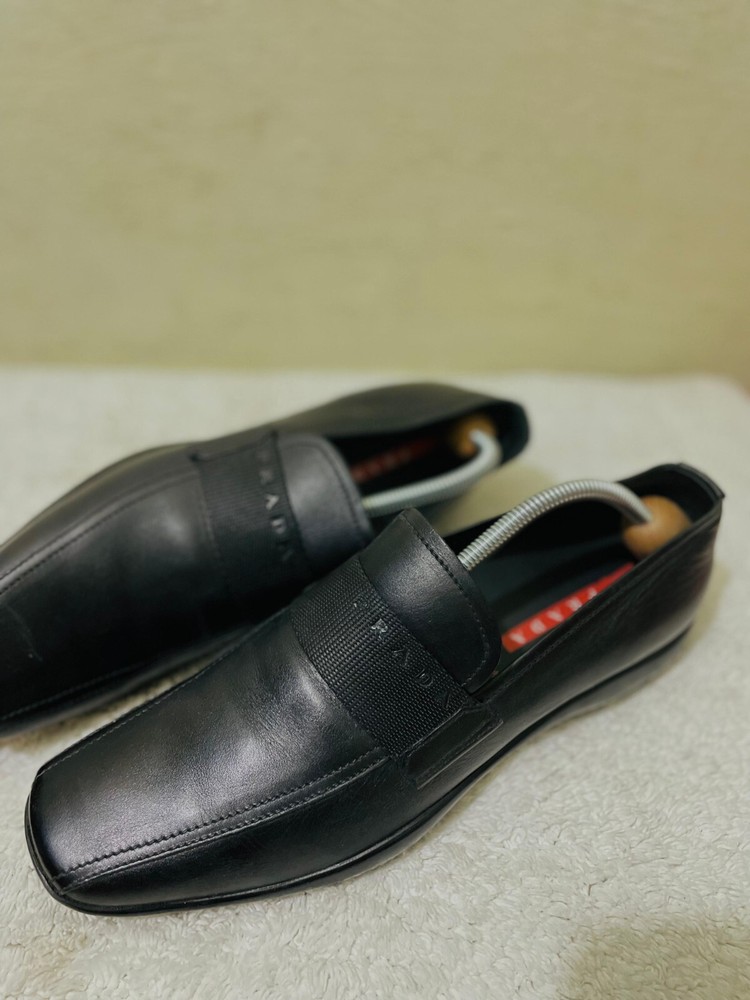 The Prada loafer shoes are a stylish and comfortable pair of men's dress shoes in size 8 UK/9 US. Featuring a solid black color and made from leather, these Oxford-style shoes are perfect for formal occasions or everyday wear. The Prada brand ensures high quality and a fashion-forward design, making them a versatile and sophisticated addition to any wardrobe.