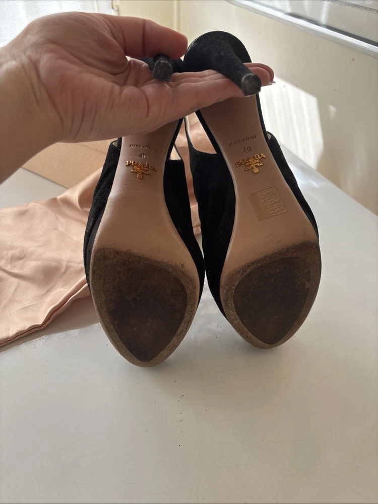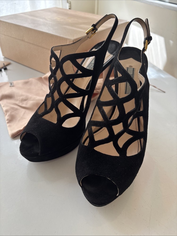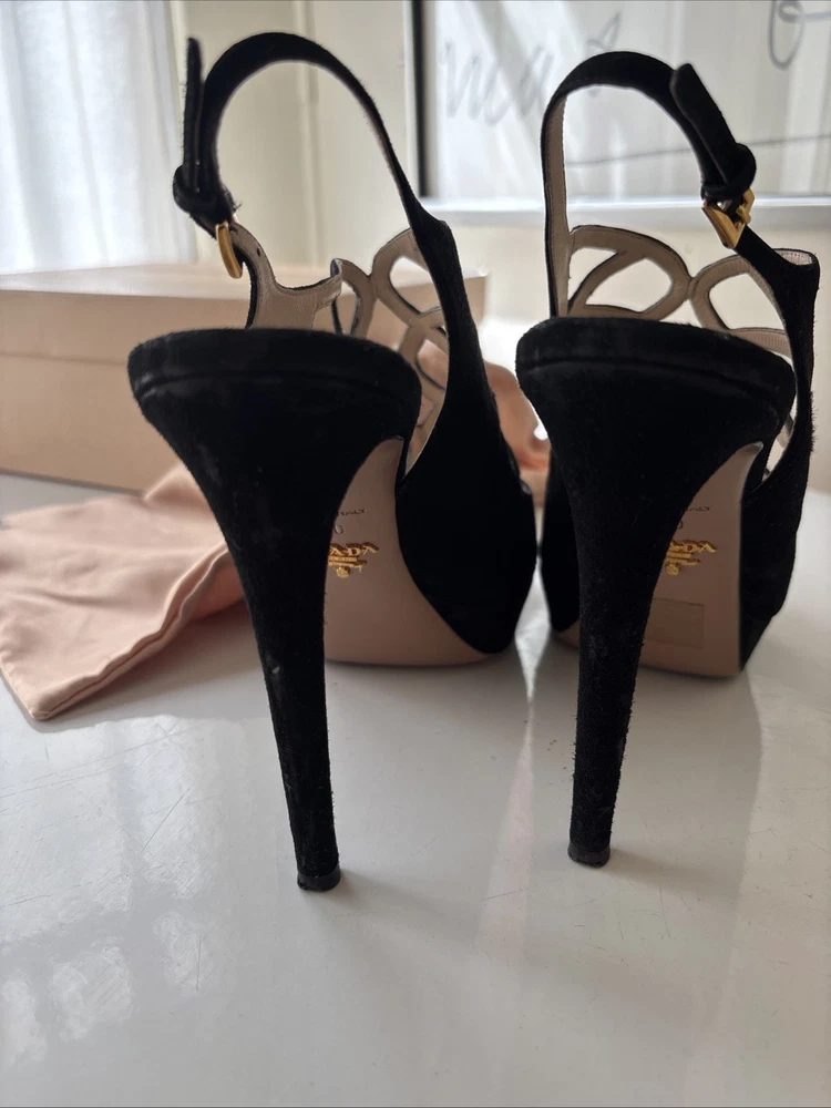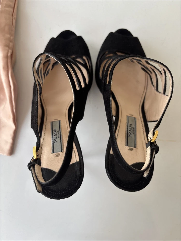 Elevate your fashion game with these stunning Prada black strappy stilettos. Crafted with premium quality leather and suede, these shoes are a perfect blend of style and comfort. The peep toe design and stiletto heel style make them perfect for any occasion, be it a party or a formal event. The vintage look of these shoes adds a touch of sophistication to your wardrobe. Available in US shoe size 40, these Prada stilettos are a must-have for every fashion-forward woman. So, add them to your collection now and walk in style! Comes with original box, original dust bag and original spare heel lifts. These are previously worn and do have minor defects.