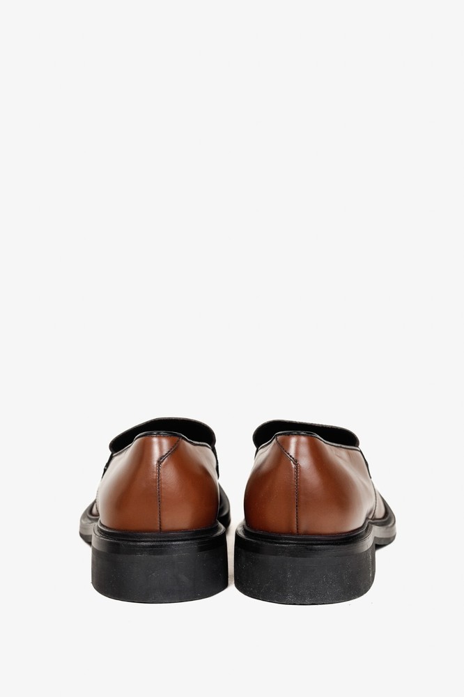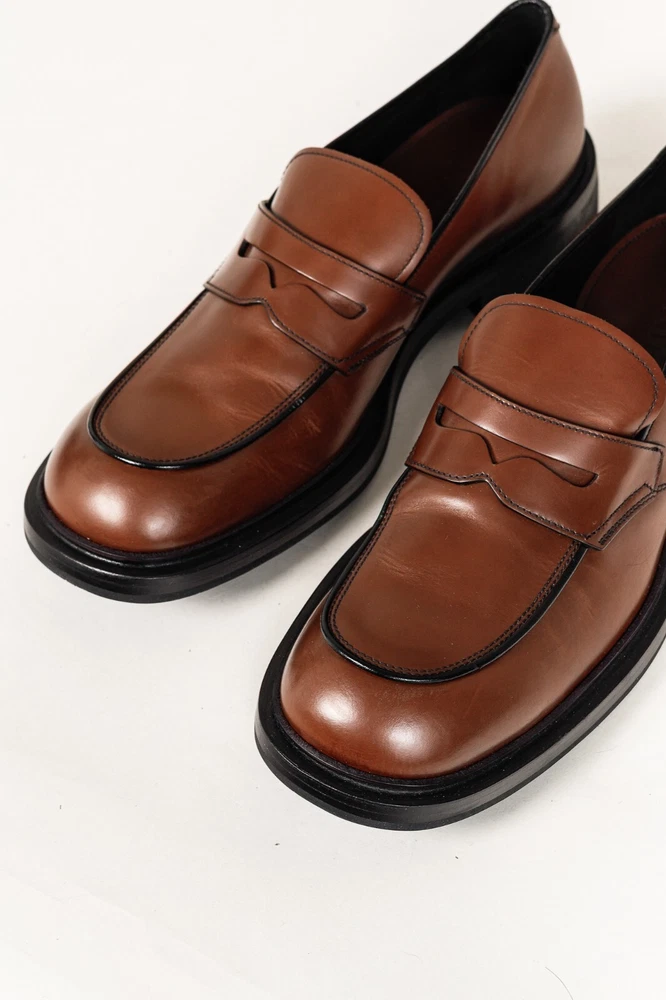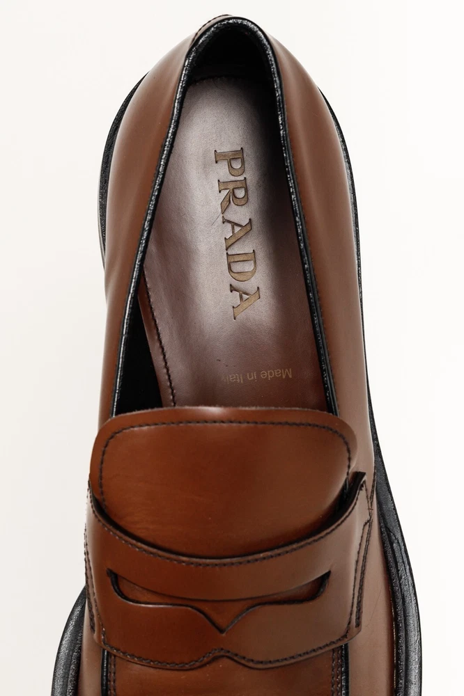Circa 2019, these Italian-made loafers from Prada are crafted with a Bright Calf leather in a Bruciato brown, and feature flat block heels, closed rounded toes, penny straps, piped detailing, small platforms, and leather lining and soles. Size: 12 Condition: Excellent; light scuffing on upper, light wear on outsoles. Comes with care card, dustbags, and box. Approximate Measurements: Insole Length: 12” (30.5 cm) Heel Height: 1.5” (4 cm) Platform Height: 0.75" (2 cm) Composition: Leather upper and lining, leather and manmade outsoles.