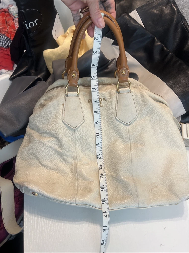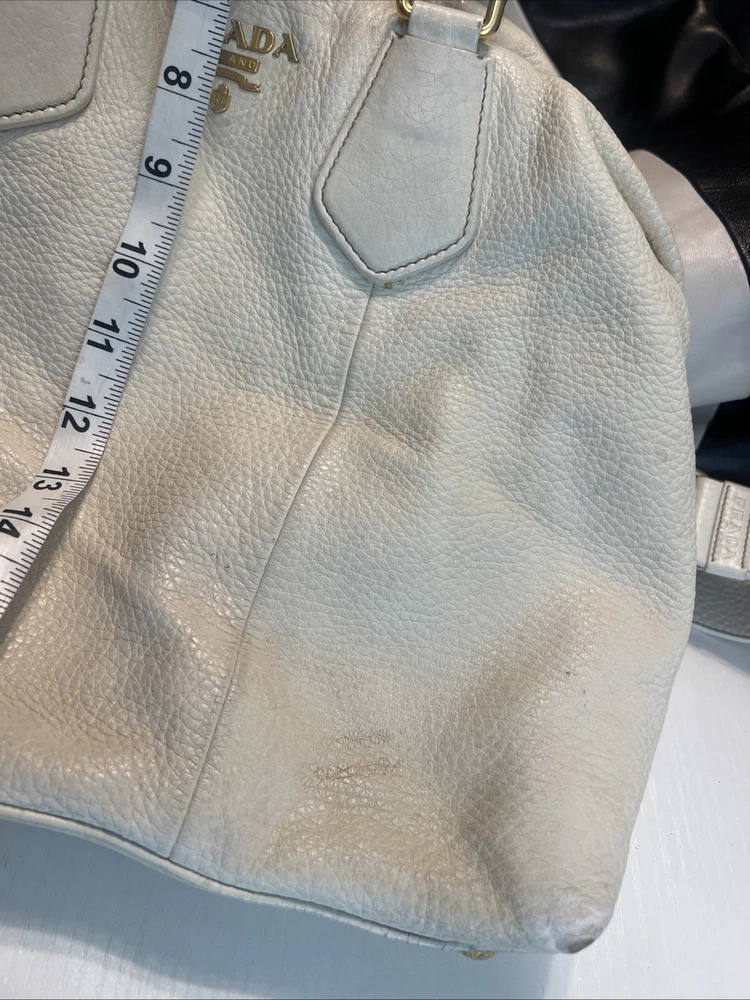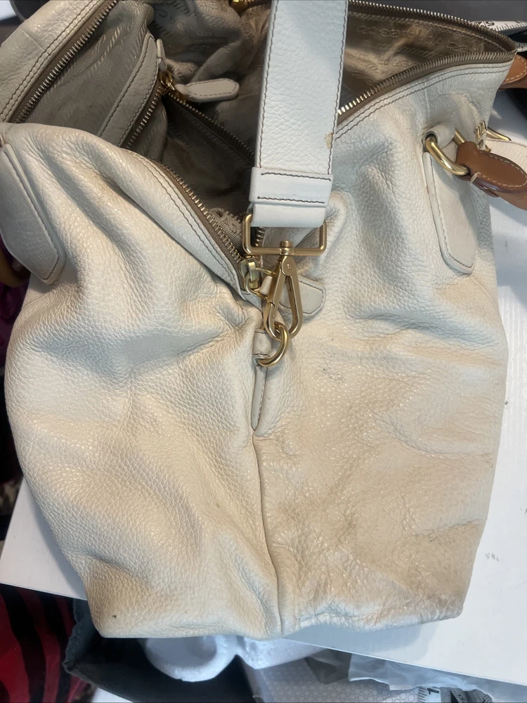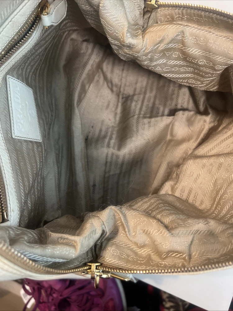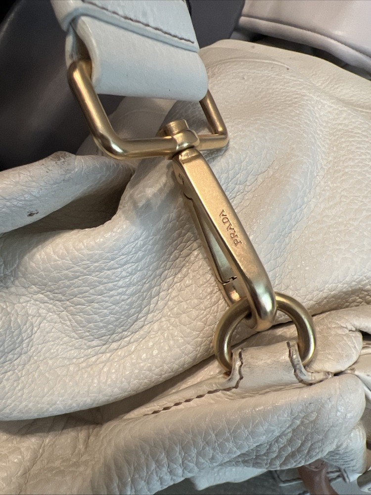 This is beautiful and it does have some wear and wrinkles and stains. It’s all very minor. It still looks very gorgeous and the lining is very clean except for a few pen marks. No odor s at all and smoke free. The Prada handbag is a luxurious accessory for women, featuring a large size with top handles and a long adjustable shoulder strap in ivory leather. The gold hardware accents, including the signature Prada Milano logo, add a touch of elegance to this stylish and sophisticated handbag. The zip closure and fabric lining ensure the secure storage of your belongings, making it a practical yet fashionable choice for everyday use or special occasions. The combination of high-quality materials and iconic brand design make this handbag a must-have for any fashion-forward individual.