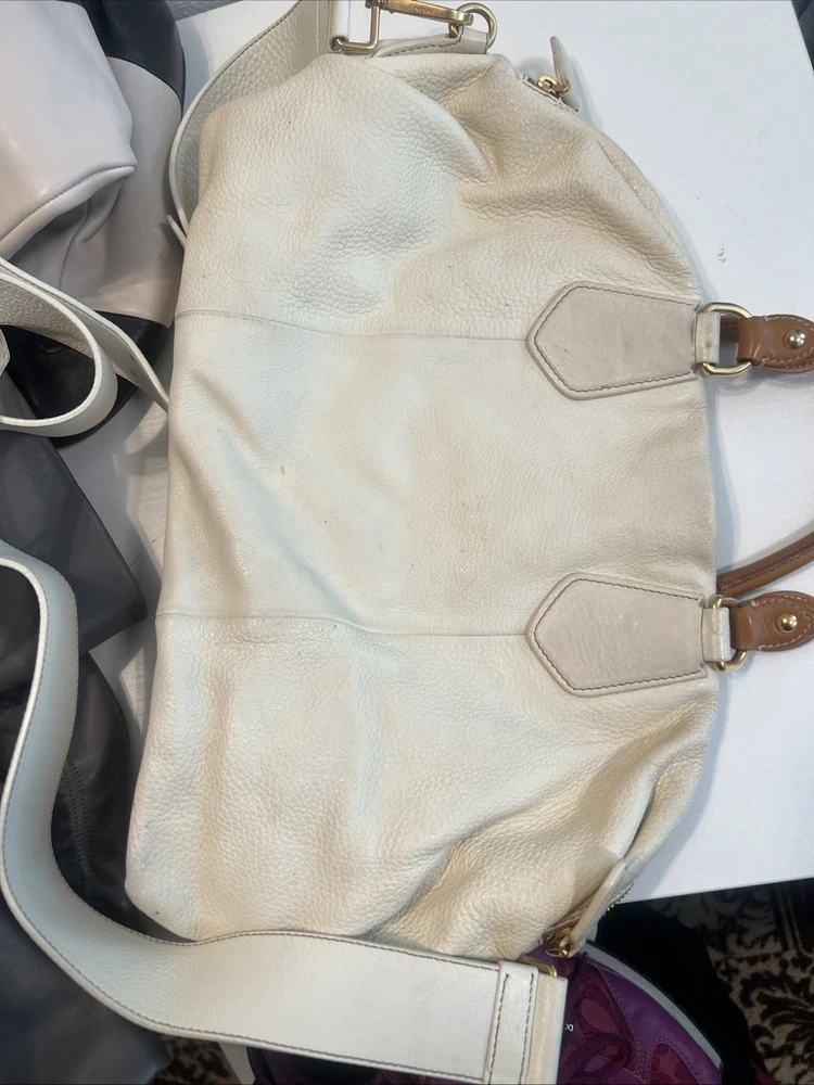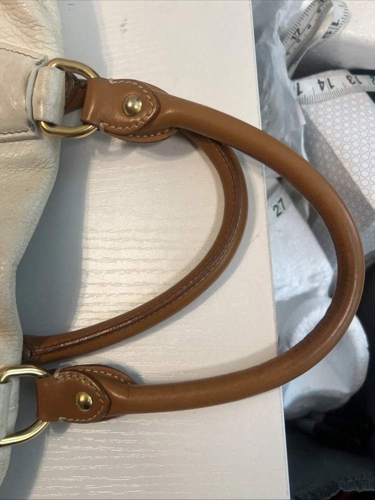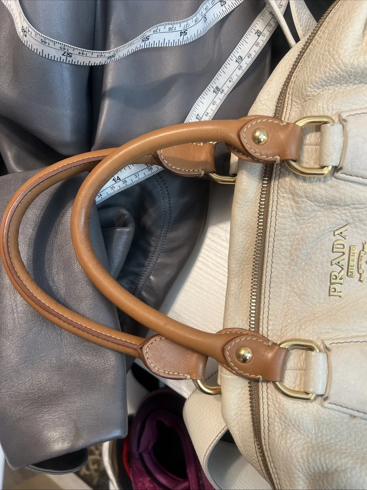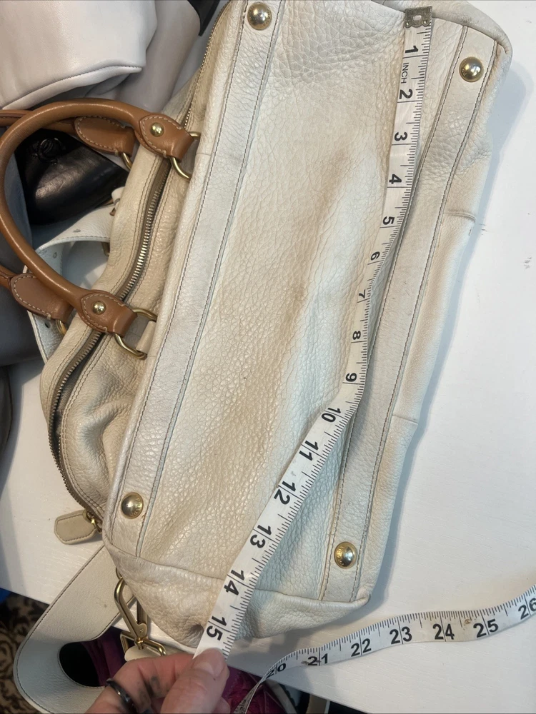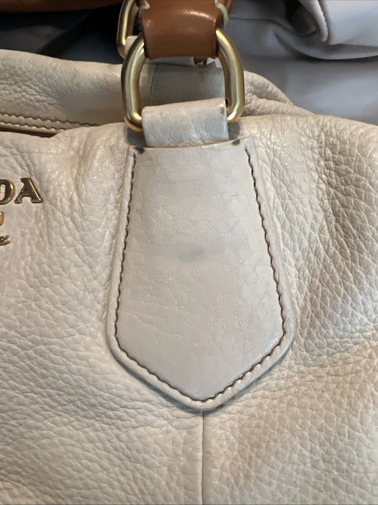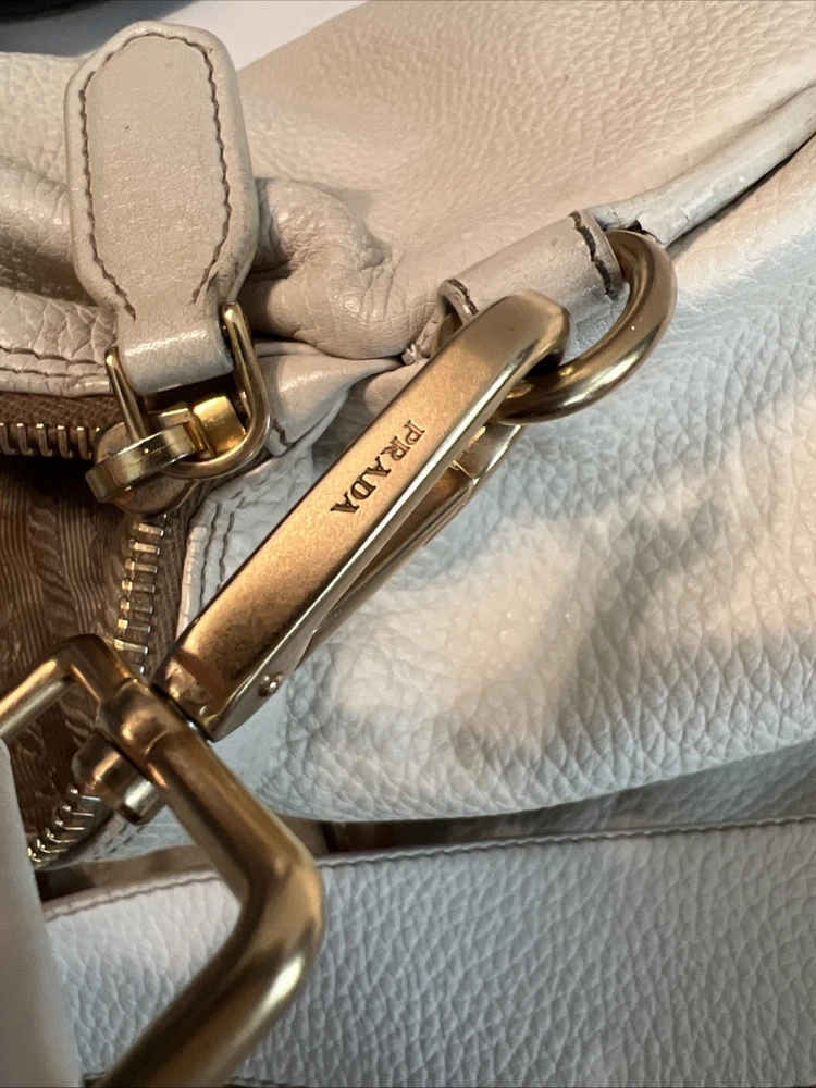 This is beautiful and it does have some wear and wrinkles and stains. It’s all very minor. It still looks very gorgeous and the lining is very clean except for a few pen marks. No odor s at all and smoke free. The Prada handbag is a luxurious accessory for women, featuring a large size with top handles and a long adjustable shoulder strap in ivory leather. The gold hardware accents, including the signature Prada Milano logo, add a touch of elegance to this stylish and sophisticated handbag. The zip closure and fabric lining ensure the secure storage of your belongings, making it a practical yet fashionable choice for everyday use or special occasions. The combination of high-quality materials and iconic brand design make this handbag a must-have for any fashion-forward individual.