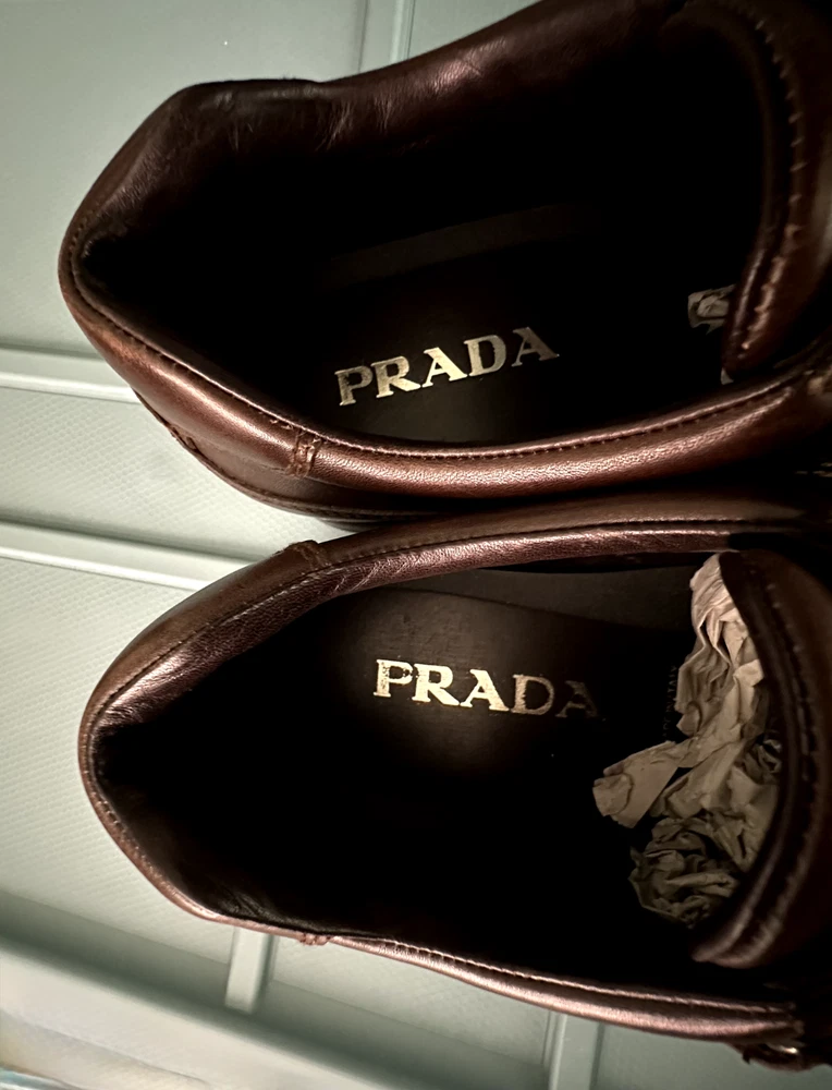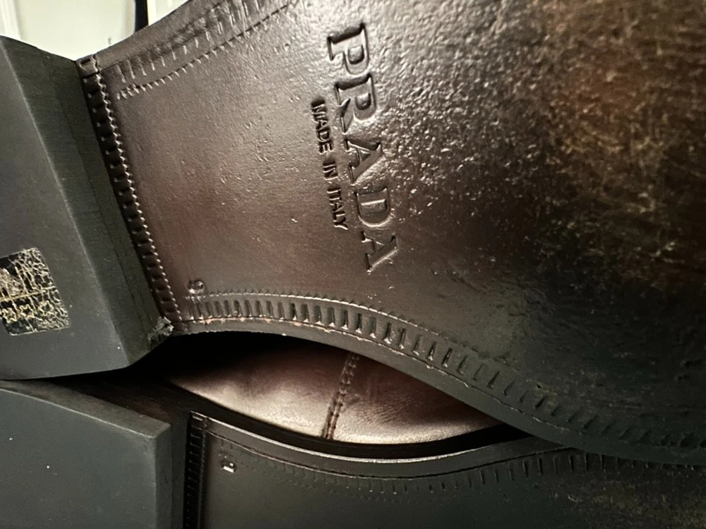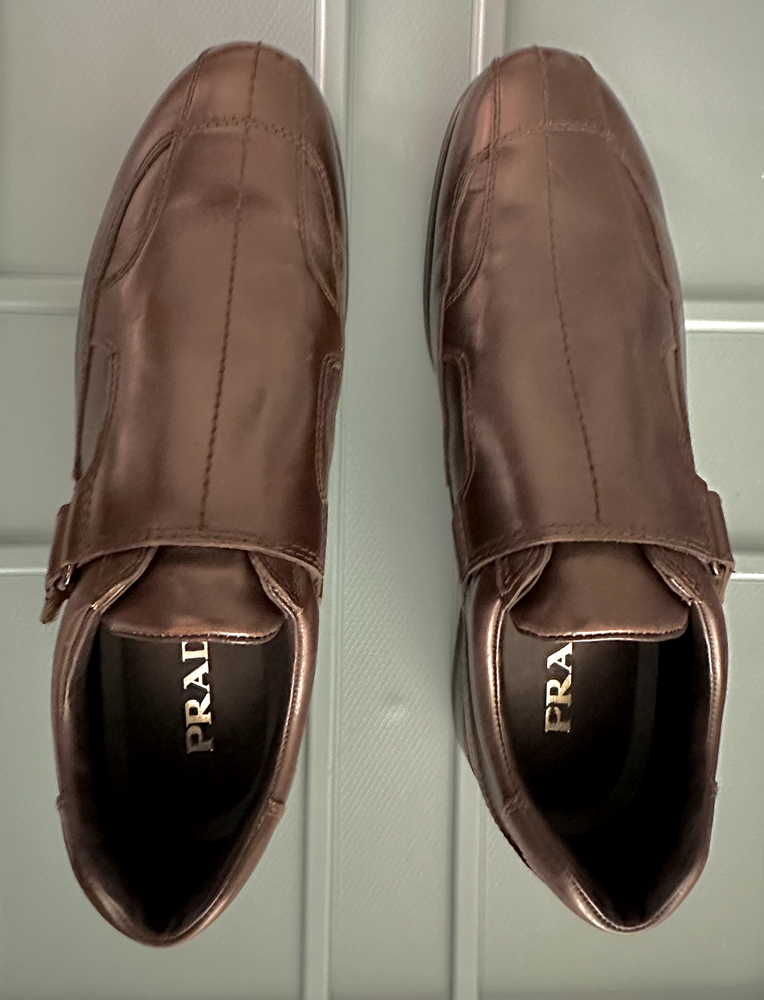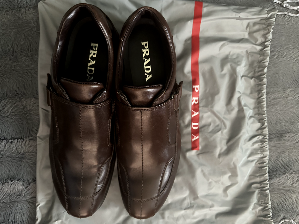 PRADA Mens Dark Brown Leather Dress Shoes. Size 10M (Prada size 9) Made in Italy. Model 2P0709. Great condition. Worn a couple of times. Some signs of wear to soles, heels and toe caps. Leather upper, soles and removable padded insoles. 1"H Rubber heels. Elasticized side and tongue. Strap velcro closure. Comes with Prada vinyl dust bag.