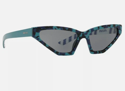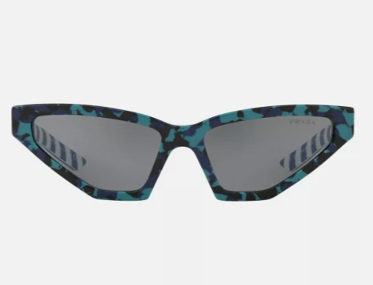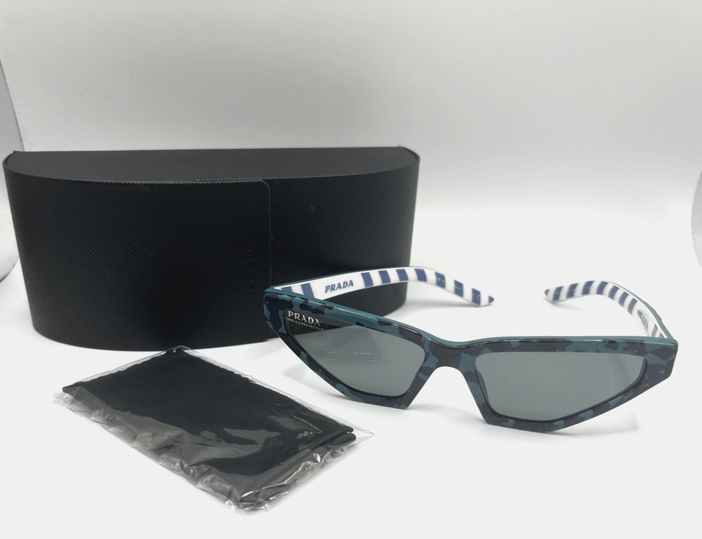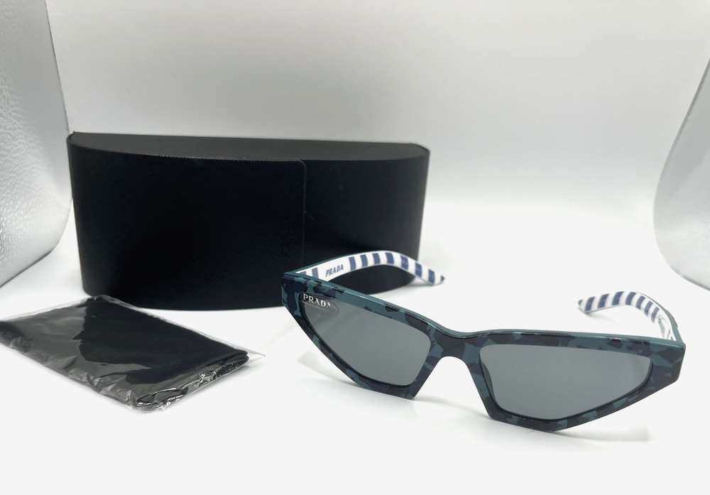 Prada women's Cat eye SPR12V Sunglasses Frame color: Blue / Green Lens color: Grey Marbled and striped print on frame Acetate frame Includes logo case and lens cloth PR823