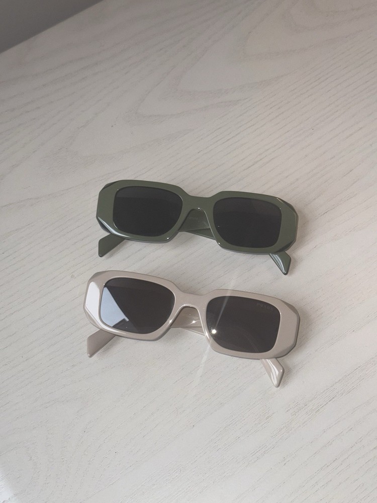 Elevate your style with these Prada Sunglasses SPR17W 13N-5S0, featuring a sophisticated geometric design. The sage green rectangle frames are made of lightweight and durable acetate material, while the dark grey lenses provide UV400 protection. These sunglasses are perfect for women who want to add a touch of designer to their look. The solid pattern and tinted lens technology make these sunglasses a great accessory for any occasion. The frame width is 140 mm, and the temple length is 145 mm. These Prada sunglasses are made in Italy and are a great addition to any wardrobe.