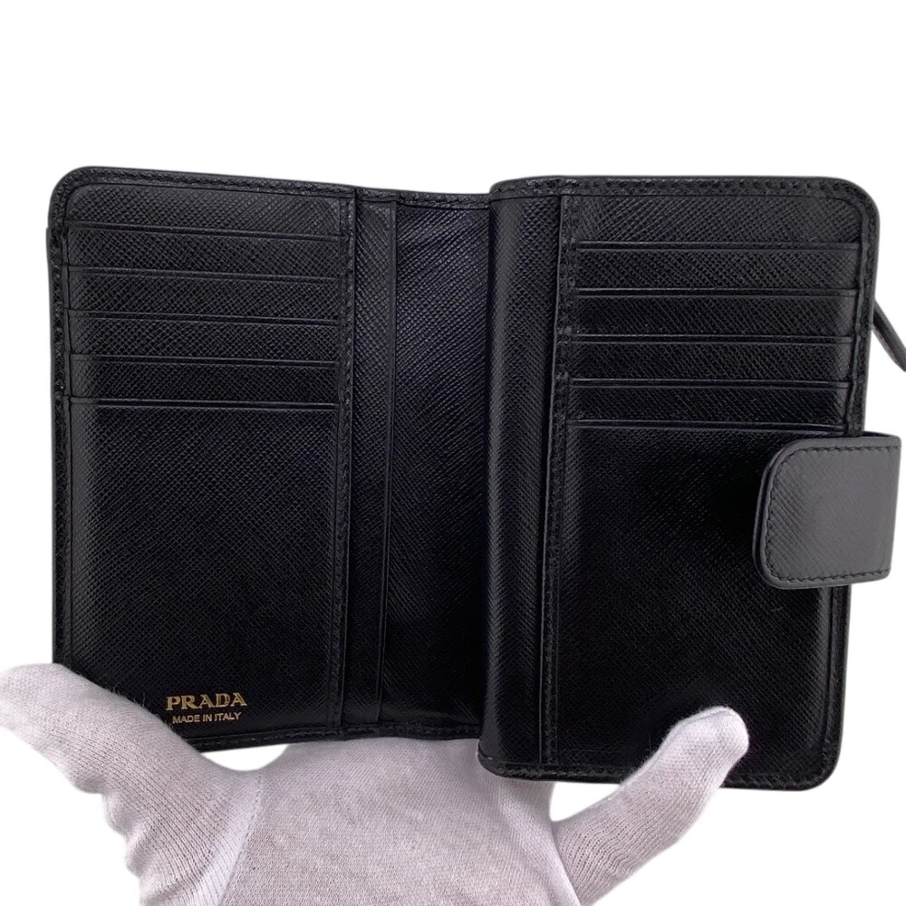1. This Prada Saffiano bifold wallet is sleek, functional, and surprisingly roomy despite its compact size. The L-shaped zipper adds a unique touch while keeping contents secure, and the black leather looks luxurious while hiding minor wear. Even as a B-rank item, it's in great shape—just a few light scuffs that don’t take away from its polished look. Perfect for daily use with plenty of card slots and a sturdy feel. A stylish pick for those who want designer quality without the brand-new price tag!