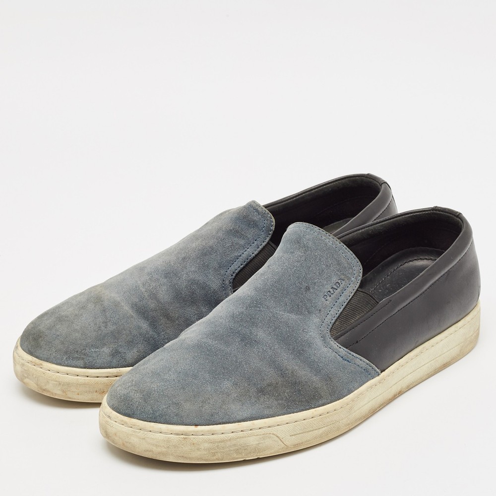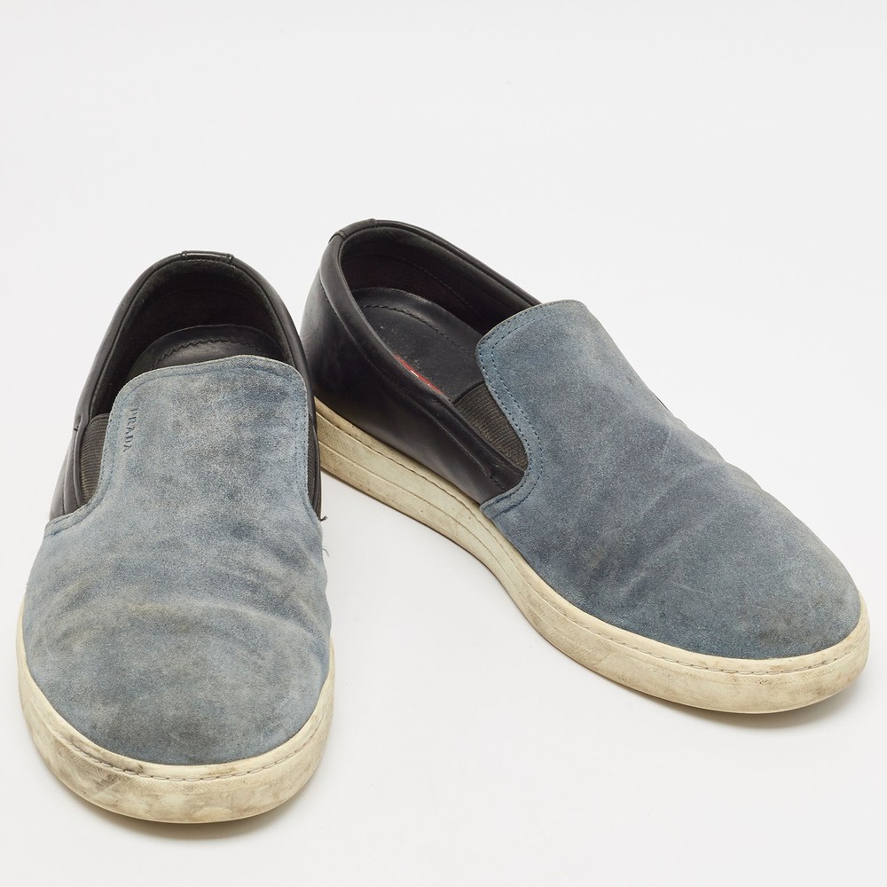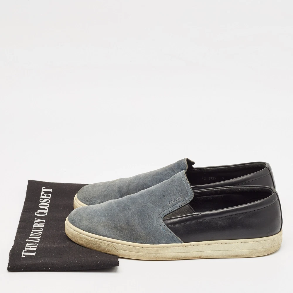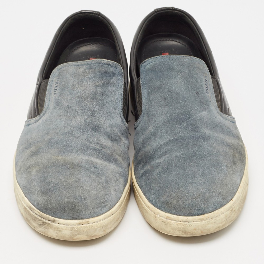 Designed to elevate your style quotient and give you comfort at the same time, these kicks are crafted using the best materials. Pair them with your casuals for a cool look.Certified by The Luxury Closet - This item has gone through a detailed authentication process overseen by our experts. We offer a lifetime guarantee of authenticity on all our items. Import duties, taxes and charges are not included in the item price. These charges are the buyers responsibility. Please check with your country’s customs office to determine what these additional cost will be prior to buying. Our eBay Store About Us Contact Us Add to Favorite Sellers Prada Sport Black/Blue Suede and Leather Slip On Sneakers Size 43 $151.8 Designed to elevate your style quotient and give you comfort at the same time, these kicks are crafted using the best materials. Pair them with your casuals for a cool look. Product Details Brand Color Black Dimensions Material Leather, Suede Size 43 Outsole Width 11 cm Outsole Length 30 cm Heel Height Includes The Luxury Closet Packaging Certified by The Luxury Closet This item has gone through a detailed authentication process overseen by our experts. We offer a lifetime guarantee of authenticity on all our items. How We Check The in-house team of experts at The Luxury Closet is highly trained to verify the authenticity and the condition of the luxury products. They ensure that only 100% authentic items are put on sale.The evaluation process is unique with its own mix of assessment criteria and differs according to the category. Each item is evaluated based on the following combination of hallmarks, hardware, stitching, symmetry, material, craftsmanship, stamping, codes, hologram stickers, and packaging. Our authenticators also check if the items have been modified or amended (e.g., aftermarket diamonds, replaced batteries, repaired bags, etc.) International Buyers Import duties, taxes and charges are not included in the item price. These charges are the buyers responsibility. Please check with your country’s customs office to determine what these additional cost will be prior to buying.