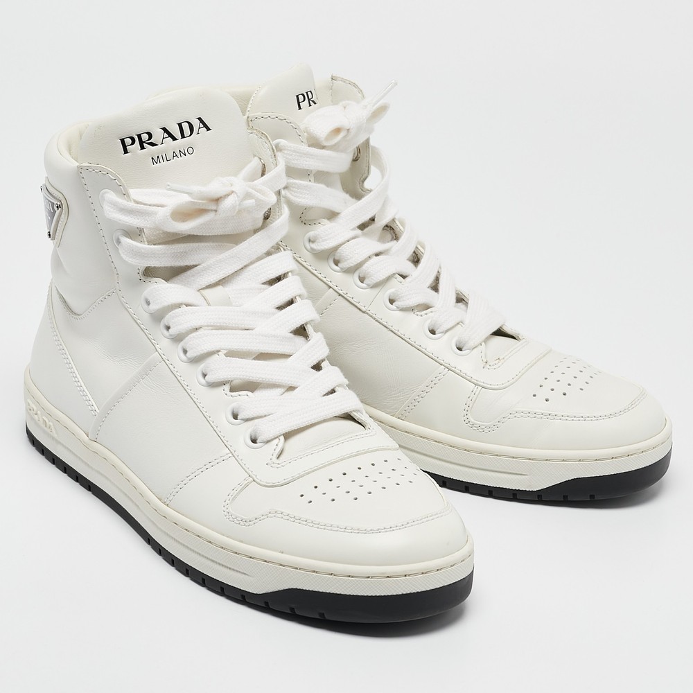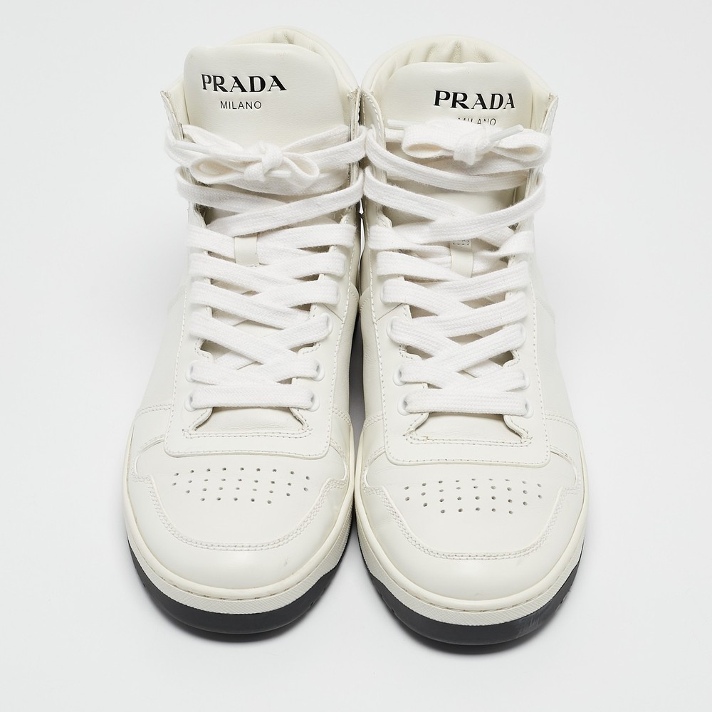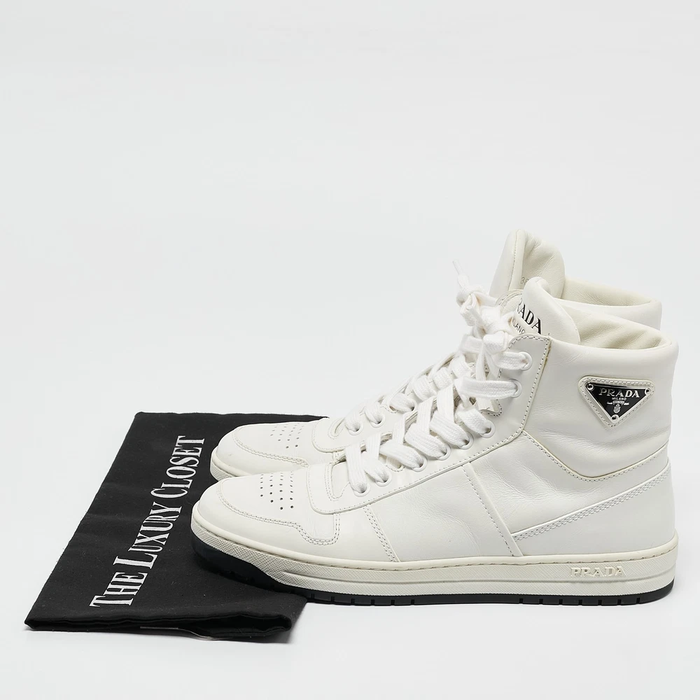Coming in a classic silhouette, these designer sneakers are a seamless combination of luxury, comfort, and style. These sneakers are finished with signature details and comfortable insoles.Certified by The Luxury Closet - This item has gone through a detailed authentication process overseen by our experts. We offer a lifetime guarantee of authenticity on all our items. Import duties, taxes and charges are not included in the item price. These charges are the buyers responsibility. Please check with your country’s customs office to determine what these additional cost will be prior to buying. Our eBay Store About Us Contact Us Add to Favorite Sellers Prada White Leather New Avenue High Top Sneakers Size 38 $810.7 Coming in a classic silhouette, these designer sneakers are a seamless combination of luxury, comfort, and style. These sneakers are finished with signature details and comfortable insoles. Product Details Brand Color White Dimensions Material Leather Size 38 Outsole Width 10 cm Outsole Length 27 cm Heel Height Includes The Luxury Closet Packaging Certified by The Luxury Closet This item has gone through a detailed authentication process overseen by our experts. We offer a lifetime guarantee of authenticity on all our items. How We Check The in-house team of experts at The Luxury Closet is highly trained to verify the authenticity and the condition of the luxury products. They ensure that only 100% authentic items are put on sale.The evaluation process is unique with its own mix of assessment criteria and differs according to the category. Each item is evaluated based on the following combination of hallmarks, hardware, stitching, symmetry, material, craftsmanship, stamping, codes, hologram stickers, and packaging. Our authenticators also check if the items have been modified or amended (e.g., aftermarket diamonds, replaced batteries, repaired bags, etc.) International Buyers Import duties, taxes and charges are not included in the item price. These charges are the buyers responsibility. Please check with your country’s customs office to determine what these additional cost will be prior to buying.
